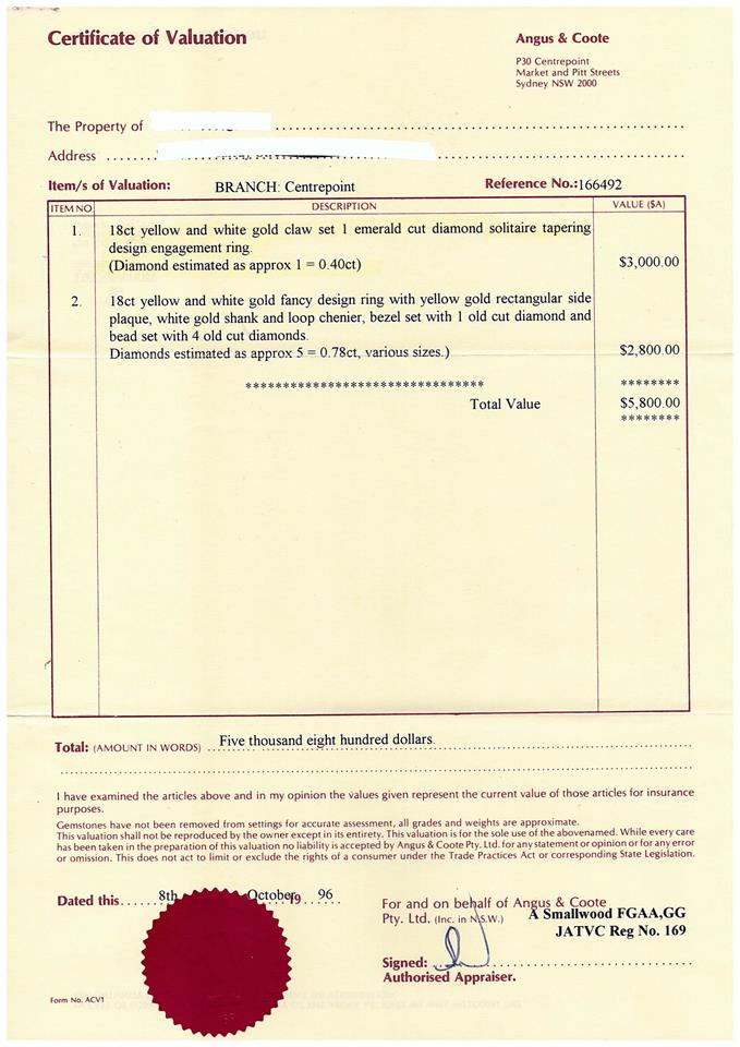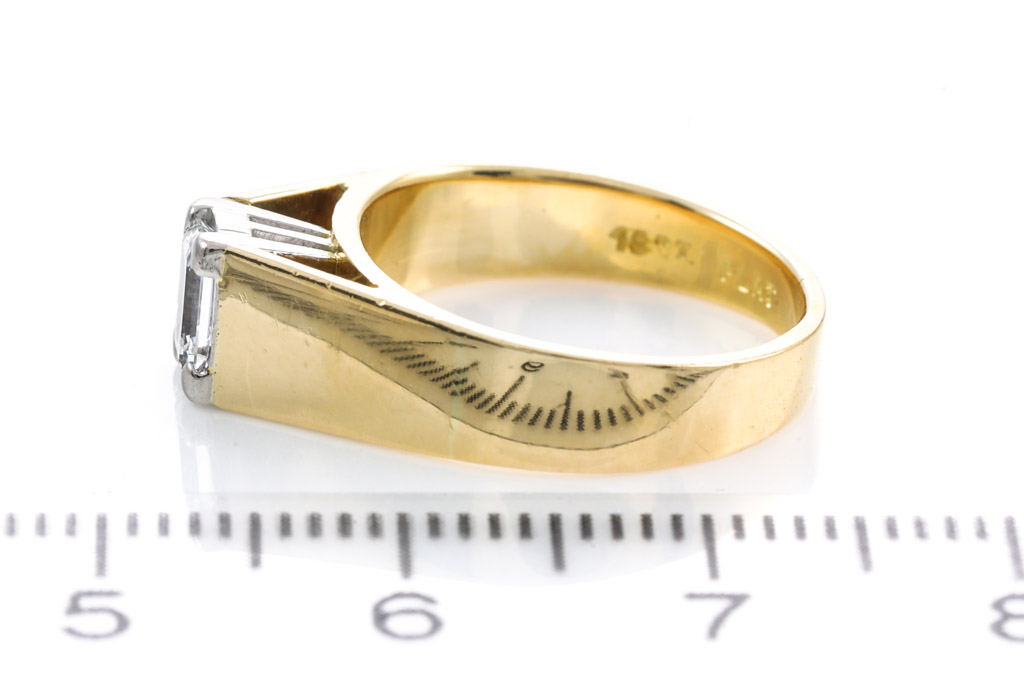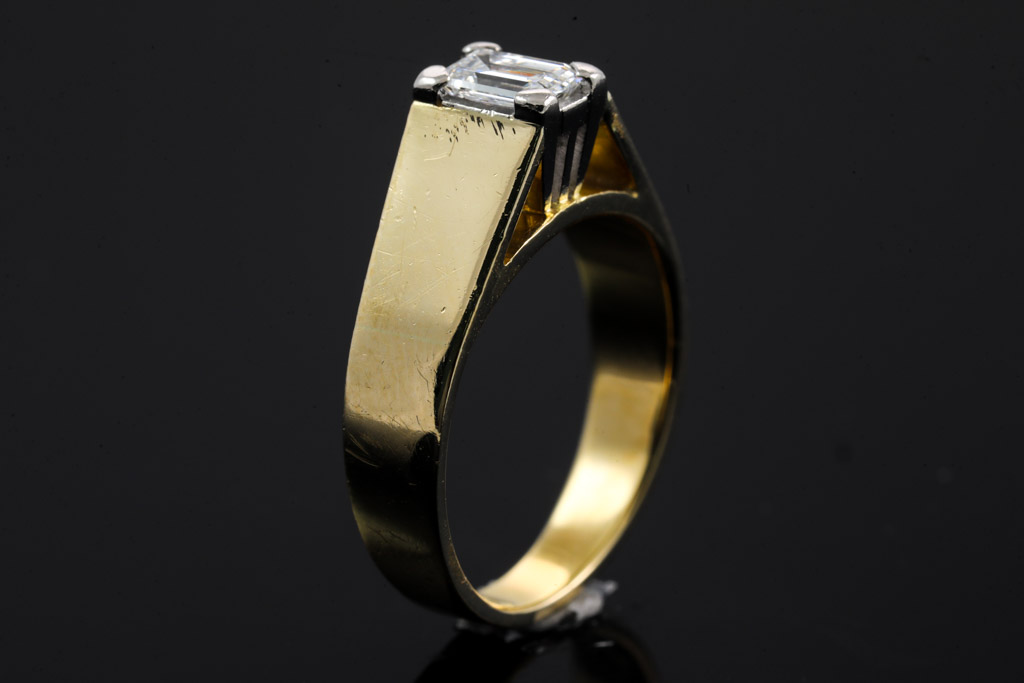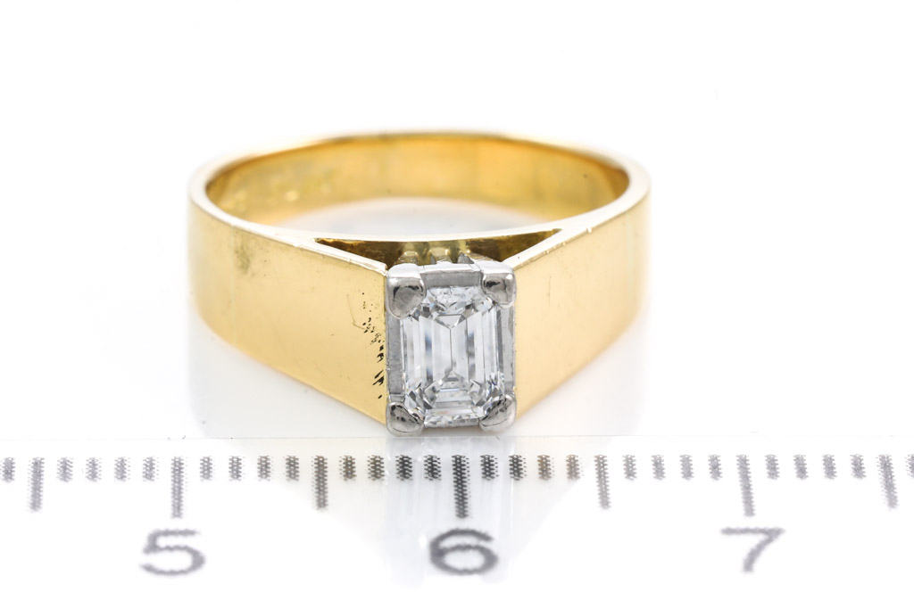 Diamond engagement ring with emerald cut Diamond of 0.40ct (Estimated grading: G VS-SI) 18ct yellow and white gold. Ring size H½. Weight: 4.9g. With Valuation Certificate dated 08/10/1996. (Pre-owned)