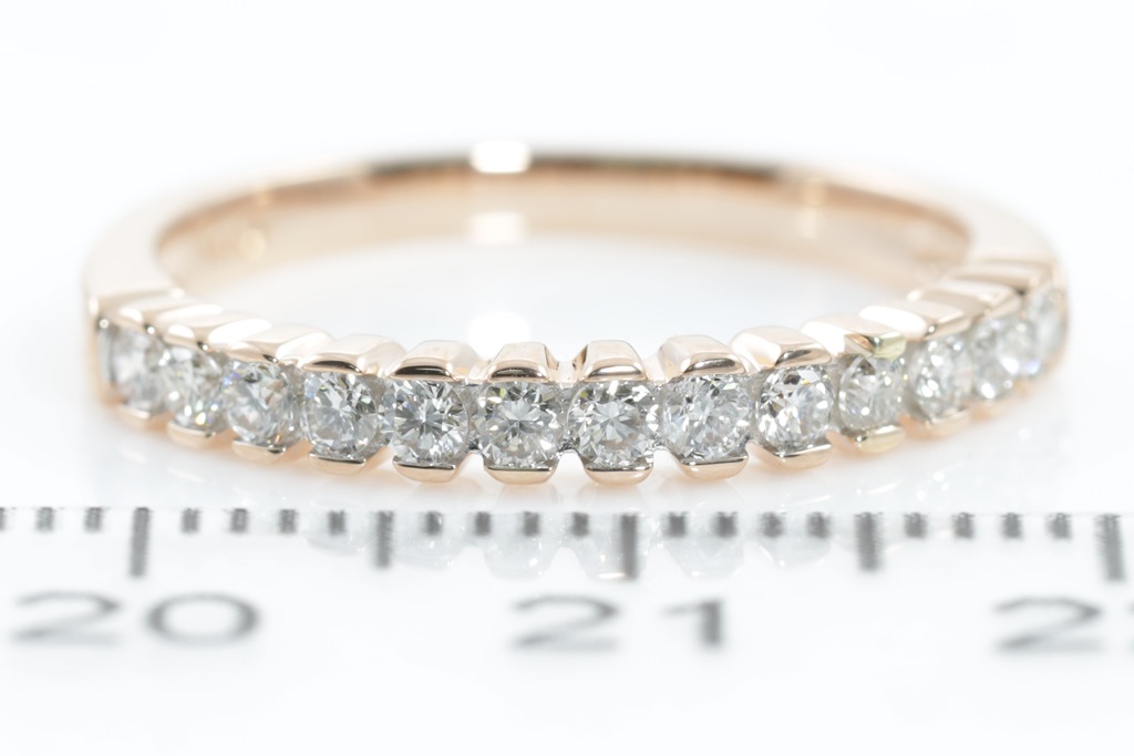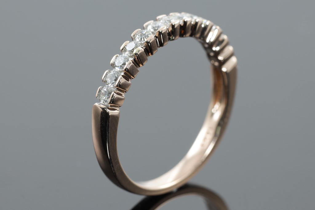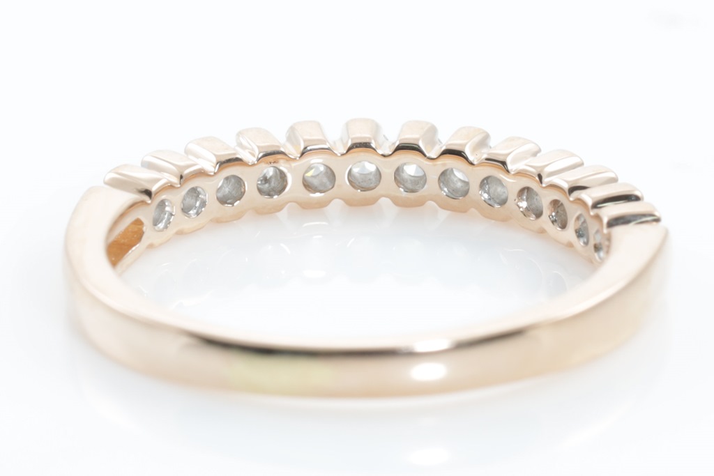 Diamond eternity ring with 13 round Diamonds totalling 0.40cts (Estimated grading: G-H SI). 14ct rose gold. Size: N. Weight: 2.6g. (New)