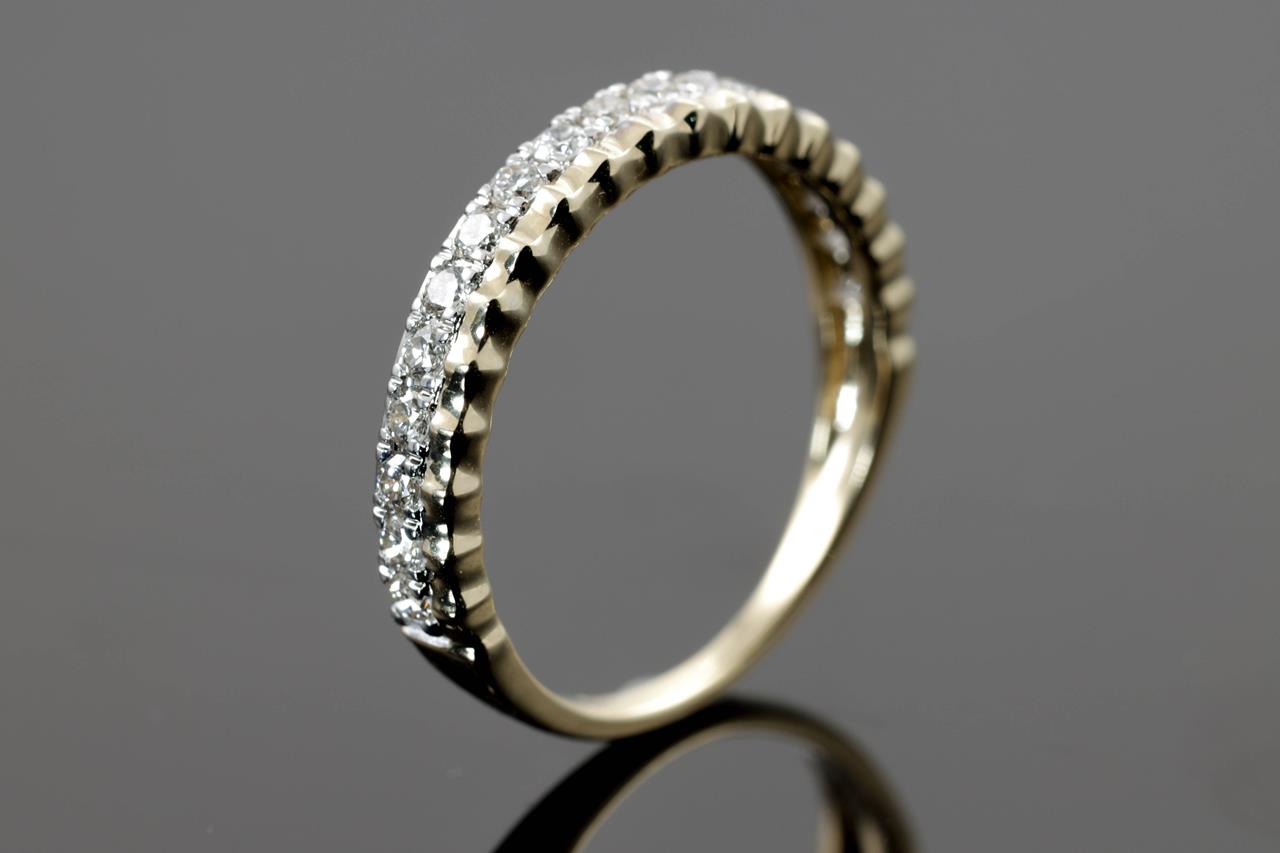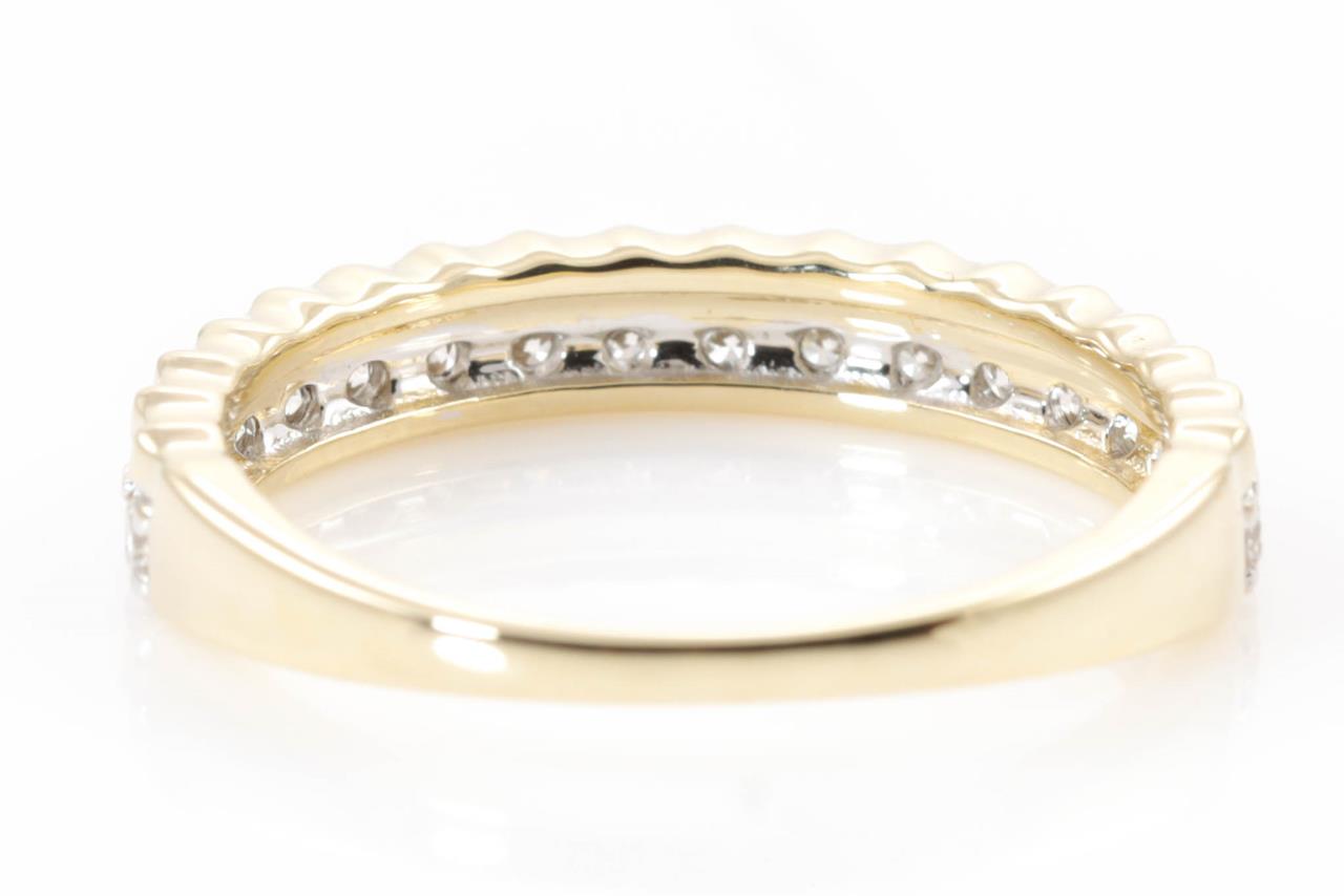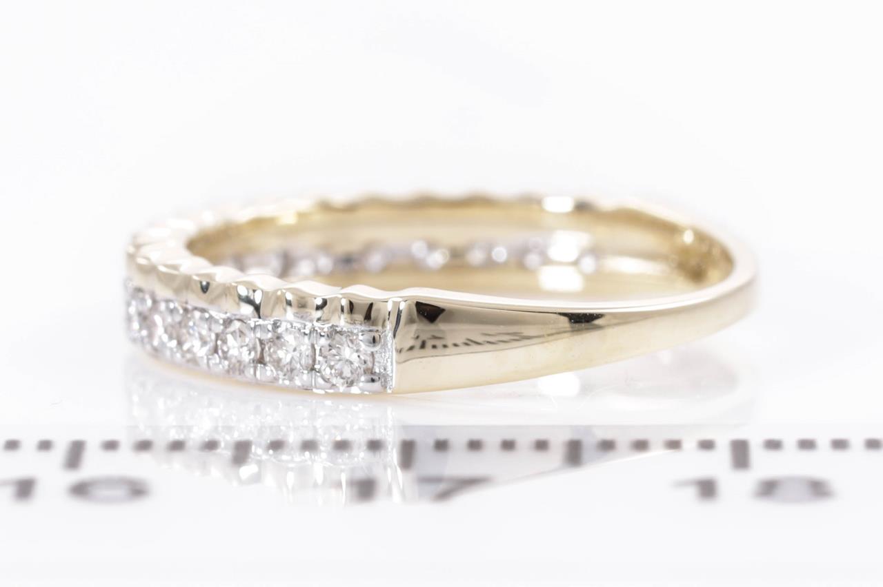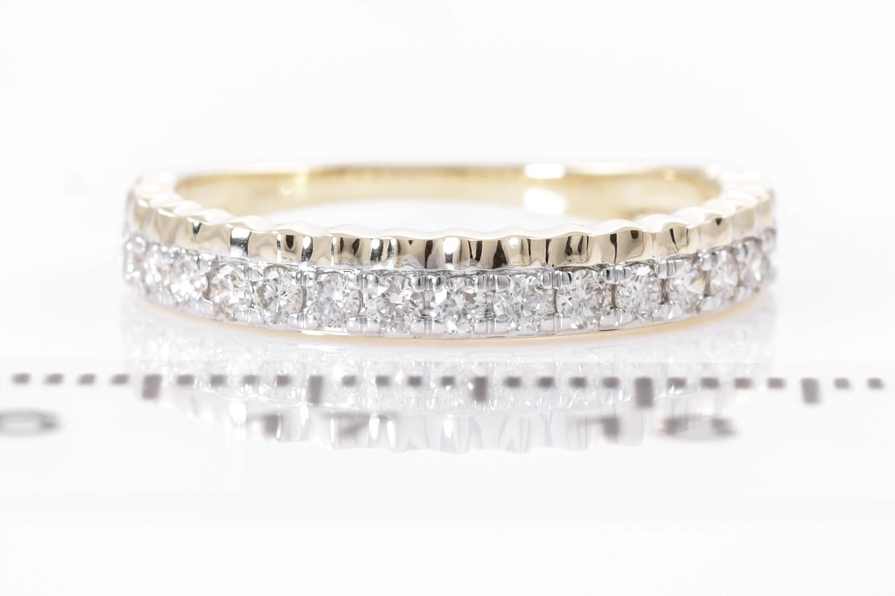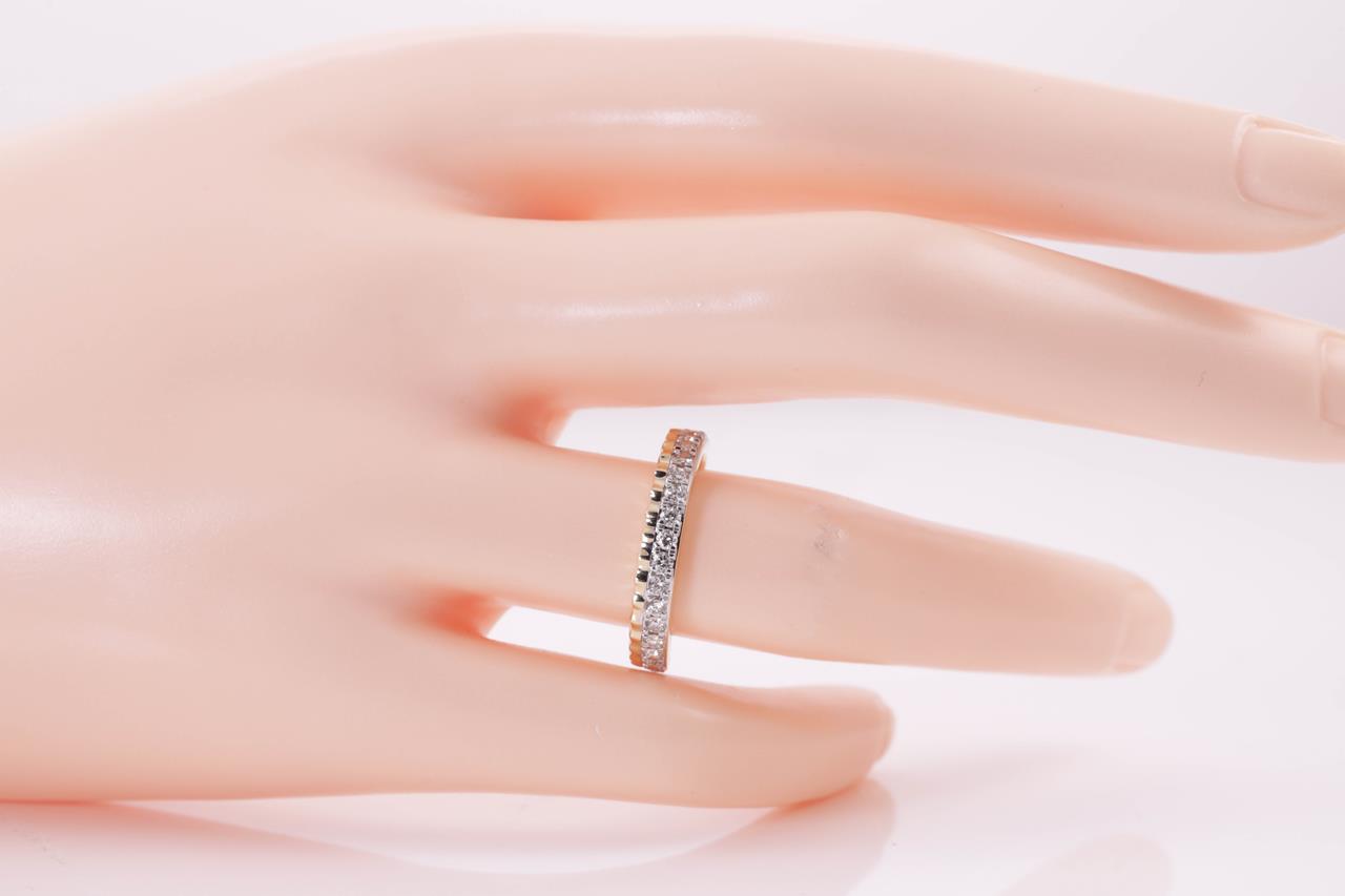 Diamond eternity ring with 18 round Diamonds totalling 0.40cts (Estimated grading: H SI). 14ct yellow and white gold. Size: M. Weight: 2.4g. (New)