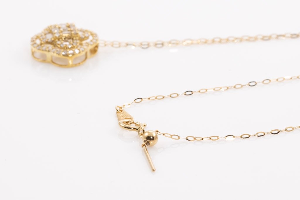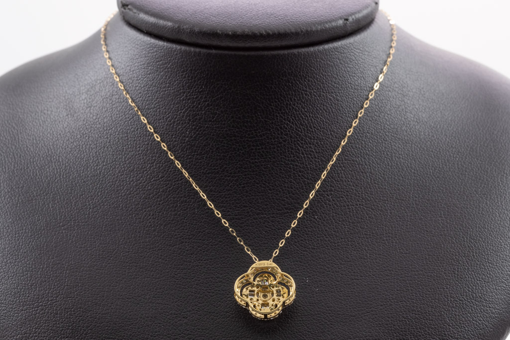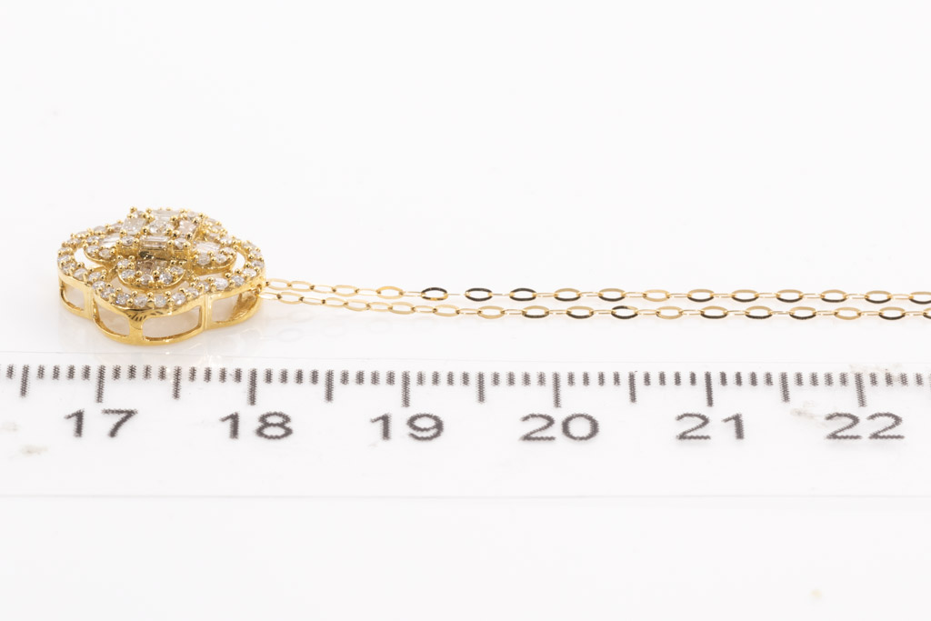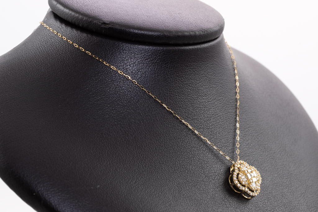 Diamond pendant with baguette cut and round Diamonds totalling 0.40cts (Estimated grading: H-I SI-P1). 18ct yellow gold with 18ct yellow gold adjustable 45cm chain. Weight: 2.3g. (Pre-owned)