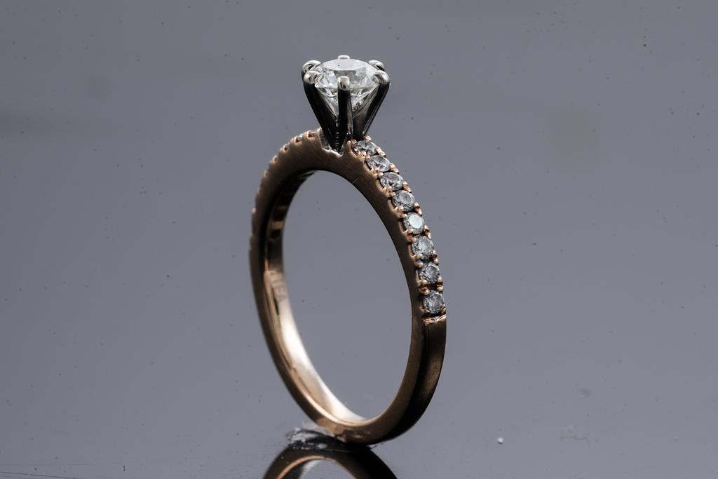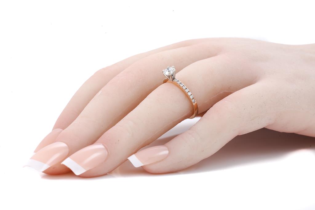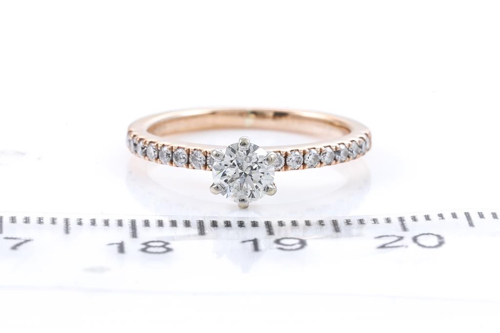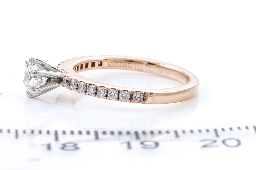 Diamond solitaire ring with centre round brilliant cut Diamond of 0.40ct (with Copy of GIA report graded as H SI2 #2195232329) and remaining round Diamonds totalling 0.24cts. 18ct white and rose gold. Ring size: H1/2. Weight: 2.4g. (Pre-owned)