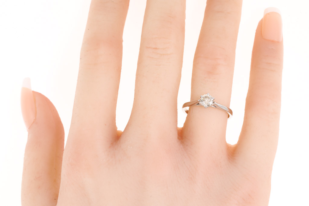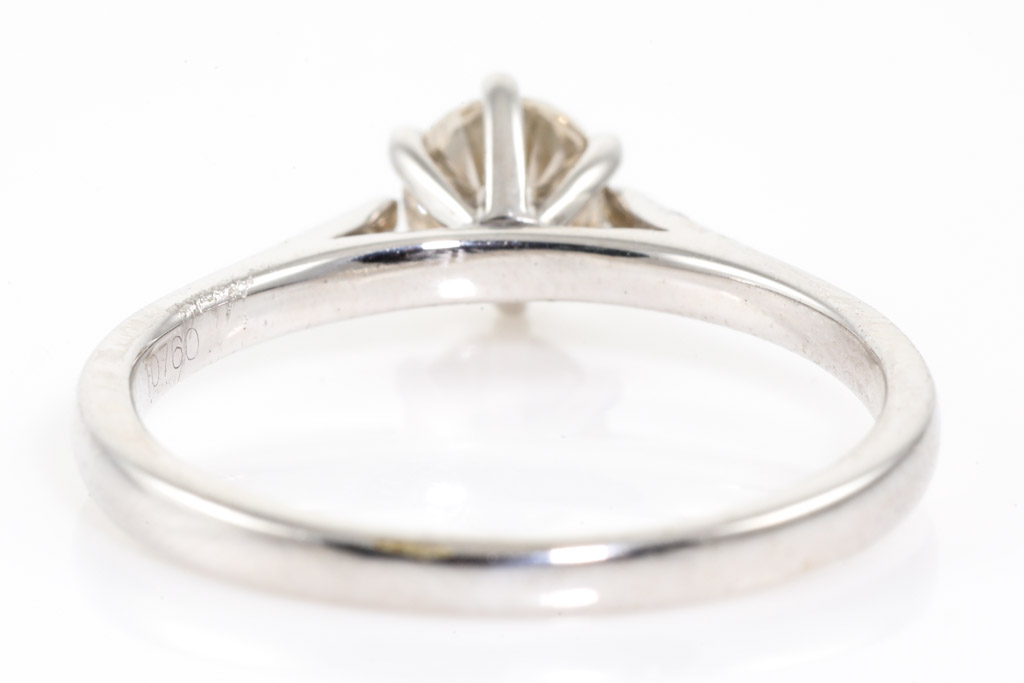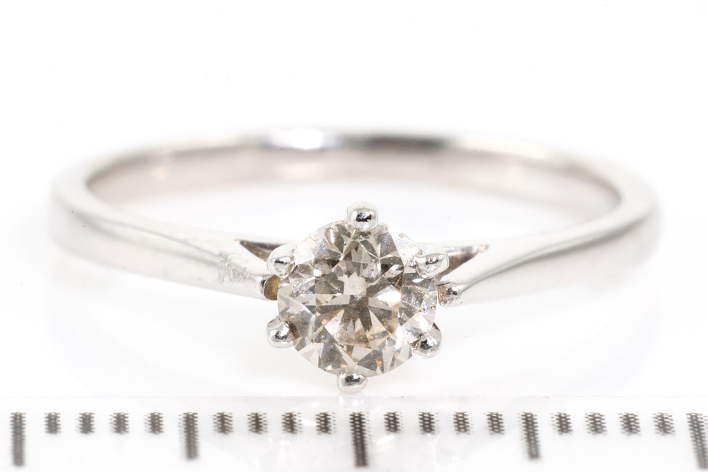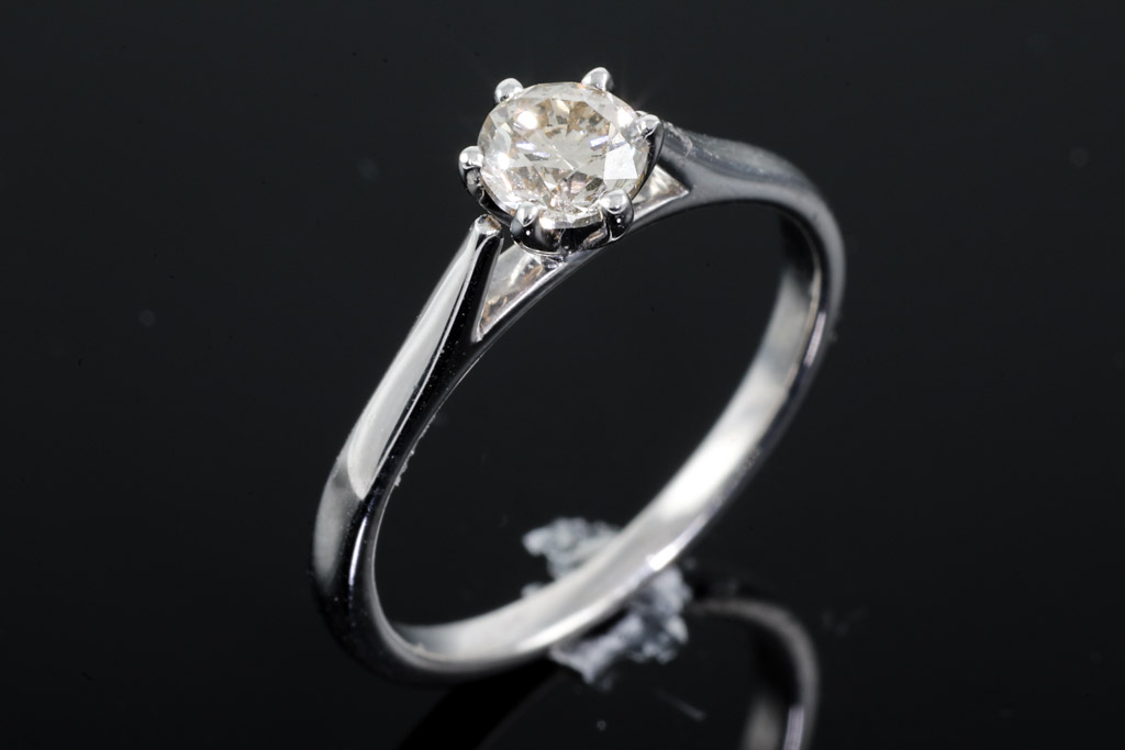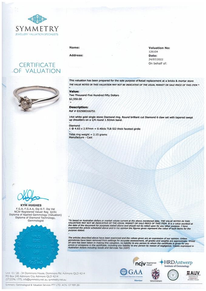 Diamond solitaire ring with round Diamond of 0.40ct (Estimated grading: TLB SI2). 14ct white gold. Ring size K. Weight: 2.1g. With Valuation Certificate Ref# 032500316751. (Pre-owned)