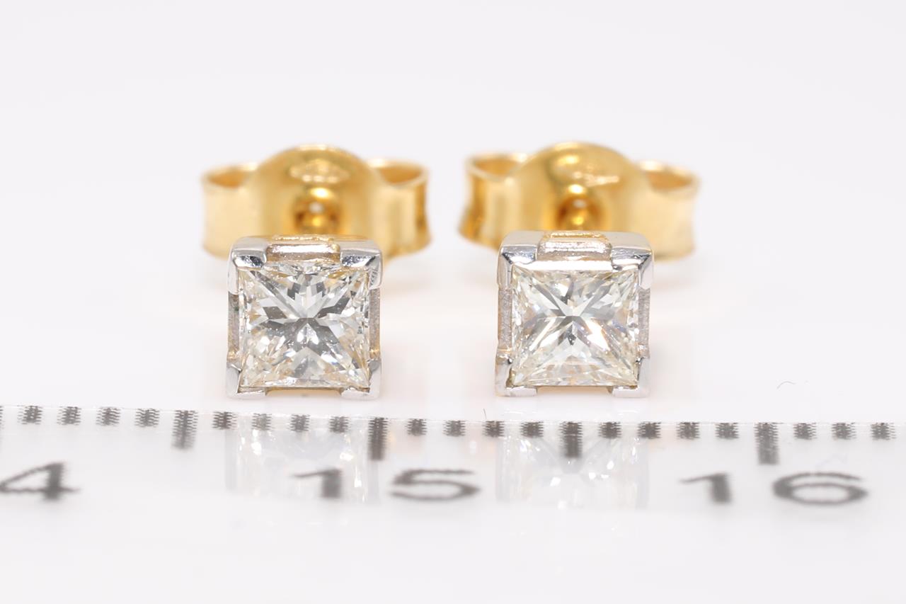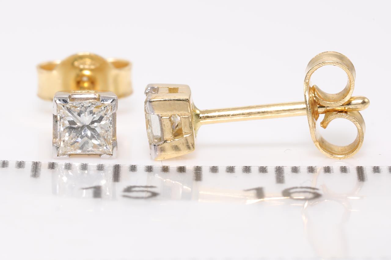 Diamond stud earrings with princess cut Diamonds totalling 0.40cts (Estimated grading: G-H VS-SI). 18ct yellow gold. Weight: 1.4g. (As New)