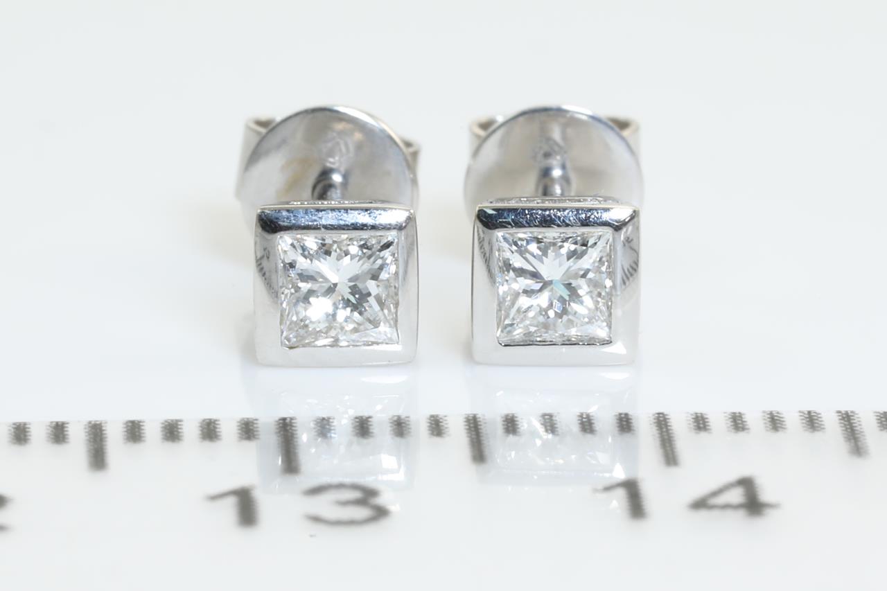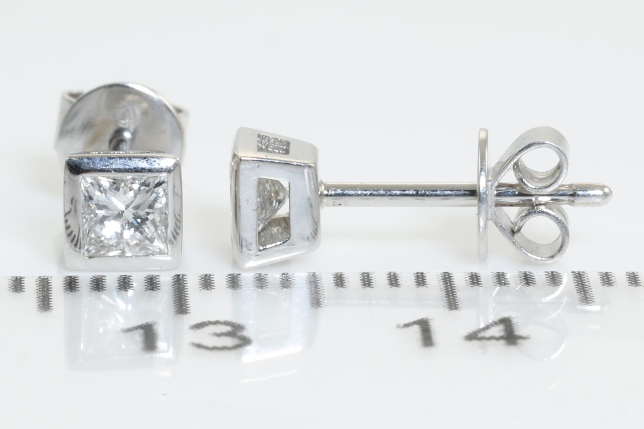 Diamond stud earrings with princess cut Diamonds totalling 0.40ct (Estimated grading: G-H VS-SI). 18ct white gold. Weight: 1.5g. (As New)