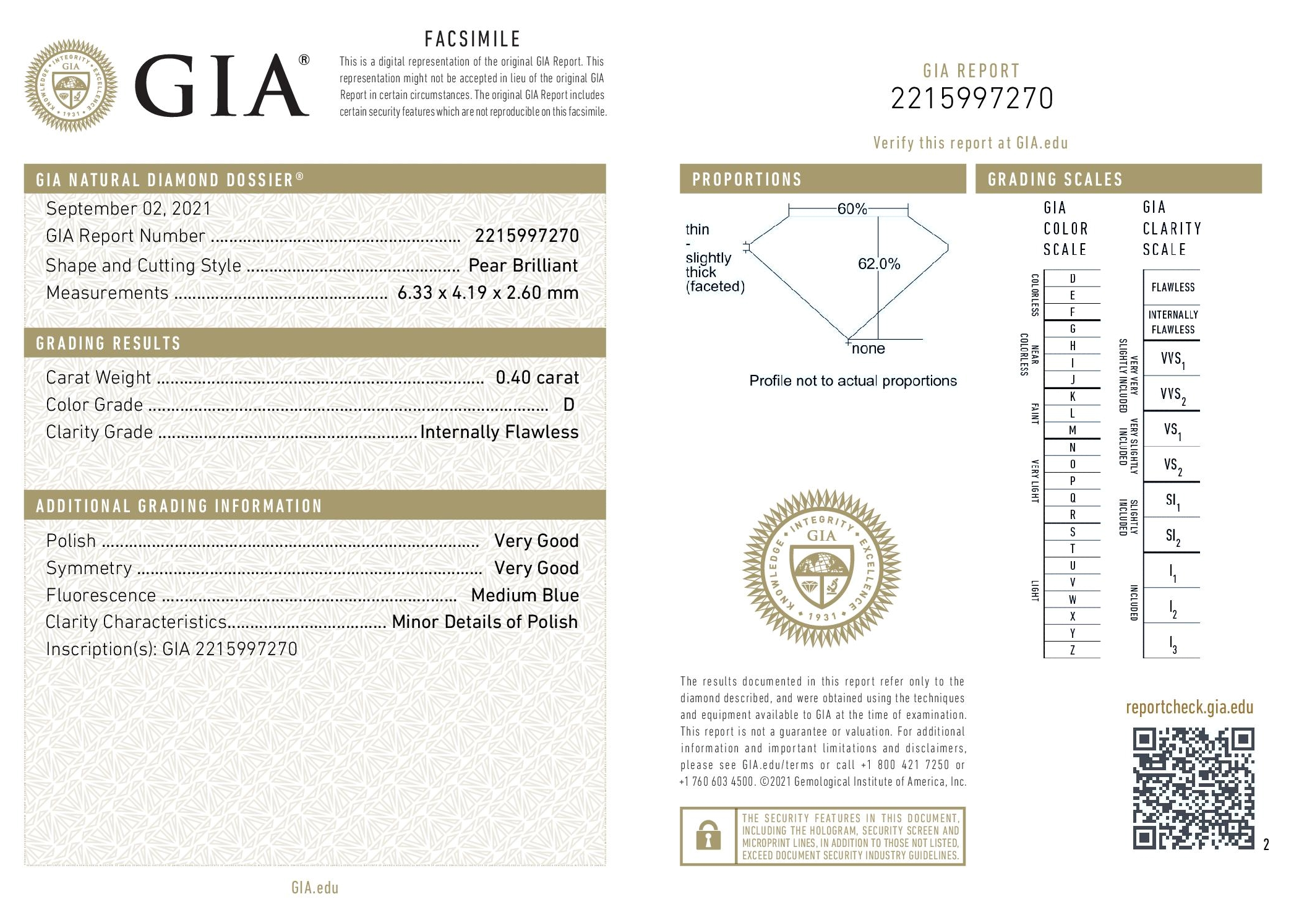 A loose pear shape Diamond of 0.40ct (with GIA summary report graded as D IF #2215997270). (New)