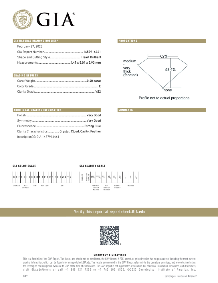 A loose heart shape Diamond of 0.40ct (with GIA Digital Diamond Dossier graded E VS2 #1457916461). (New)