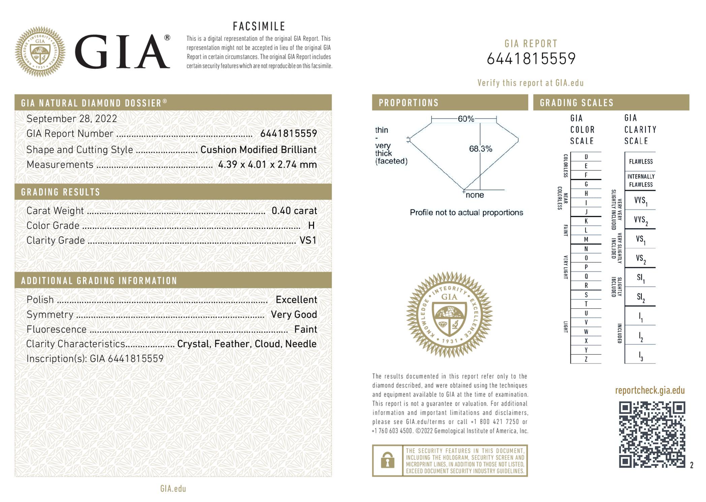 A loose cushion cut Diamond of 0.40ct (with GIA summary report of H VS1 #6441815559). (New)