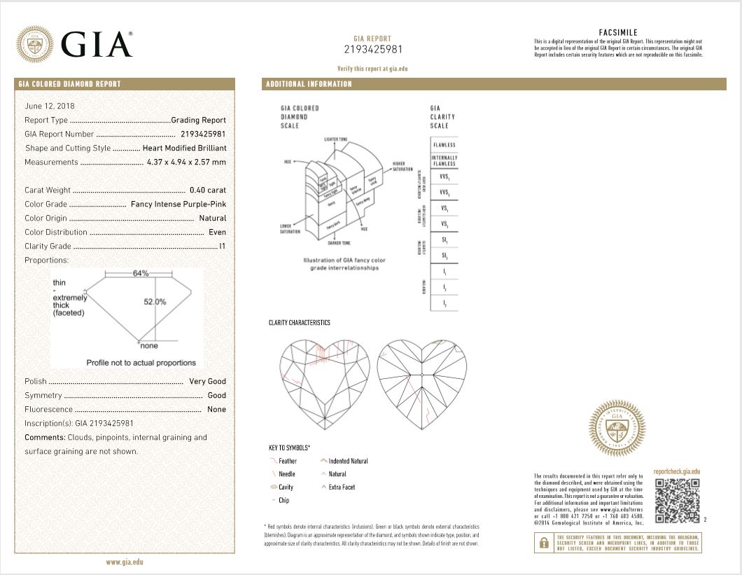 A loose heart shape Diamond of 0.40ct (with GIA report graded as Natural Fancy Intense Purple-Pink Even P1 #2193425981). (New)