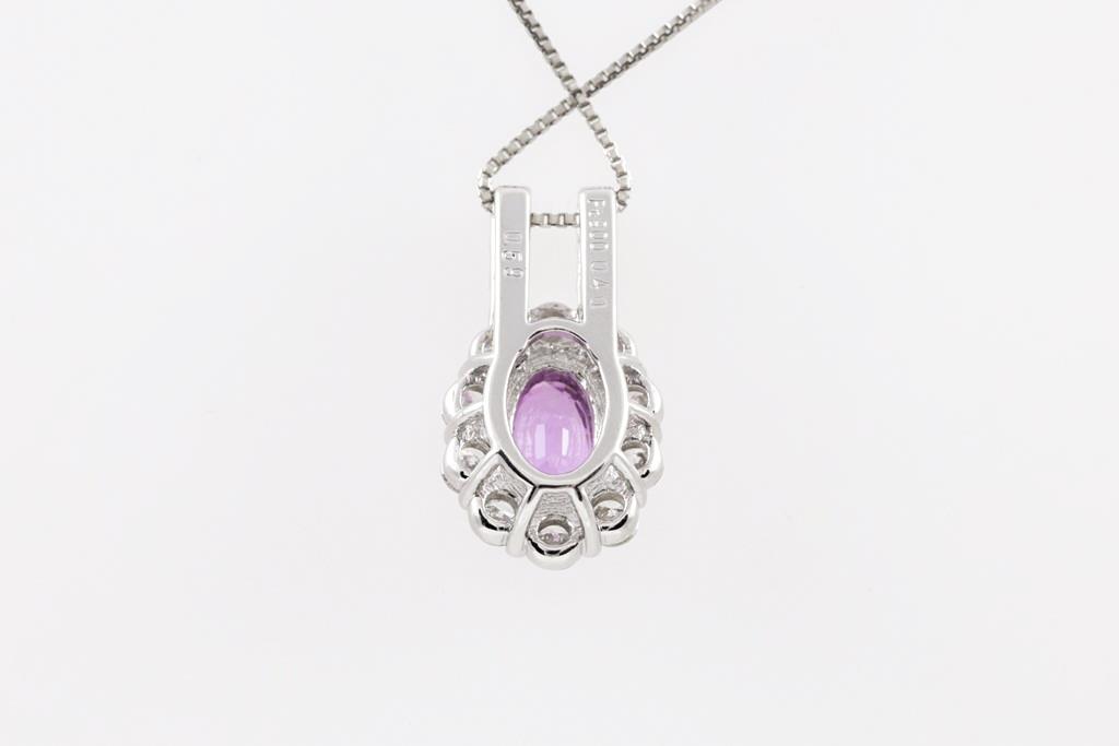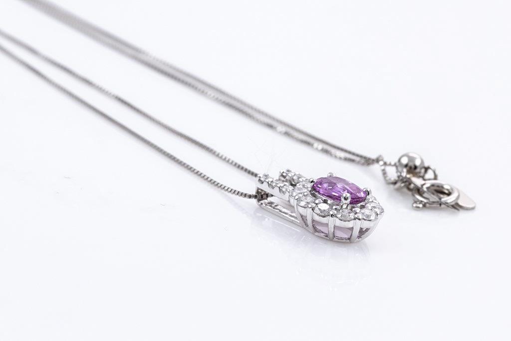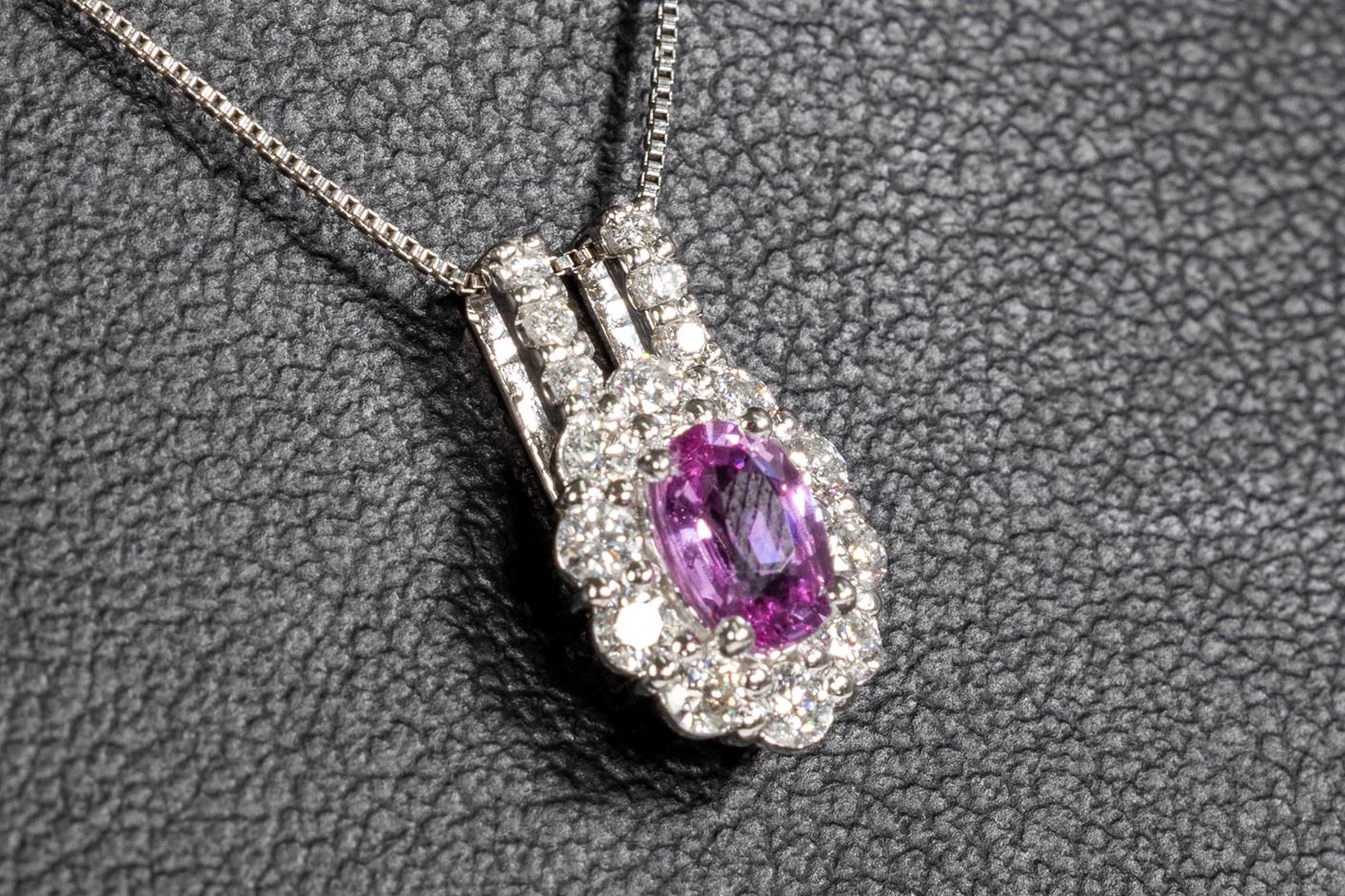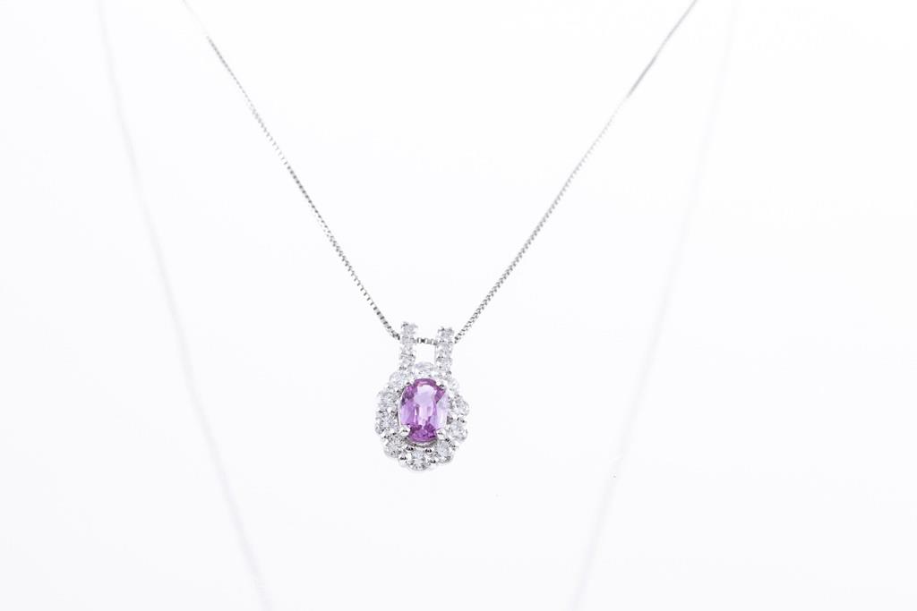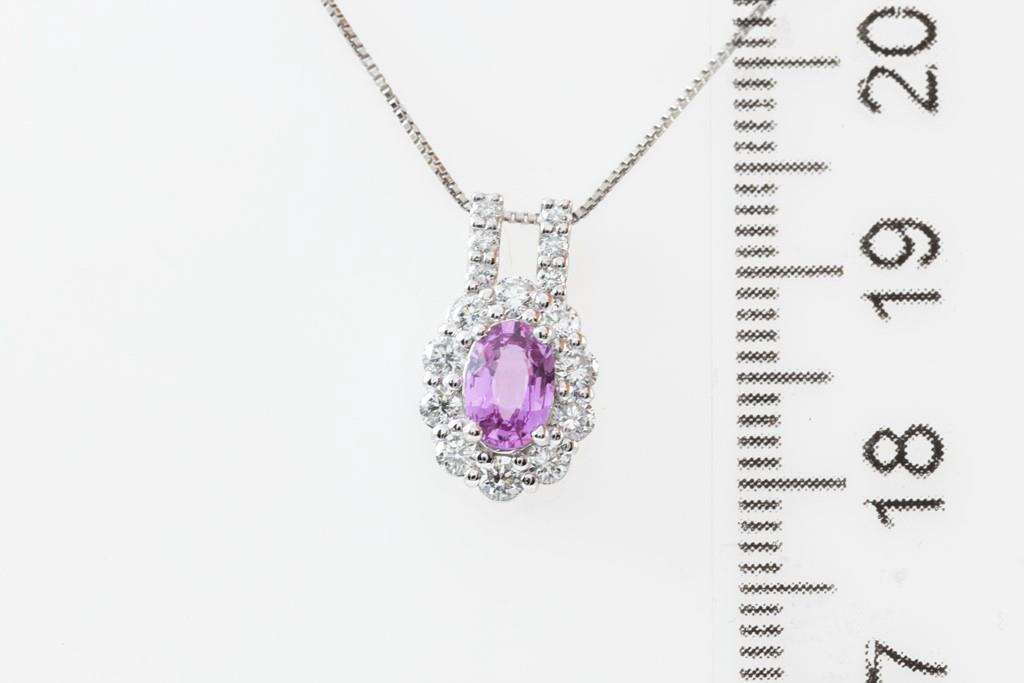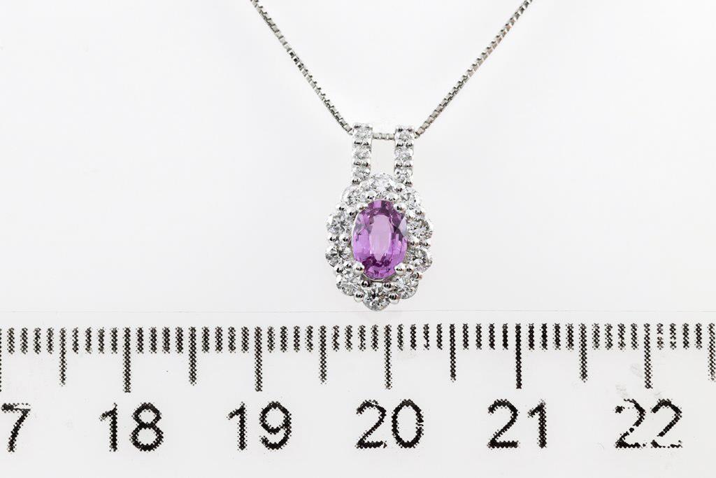 Sapphire and Diamond pendant with an oval pink Sapphire of 0.40ct and Diamonds totalling 0.59cts (Estimated grading: G-H SI). Platinum with adjustable 45cm chain. Length: 3.4g (Pre-owned)