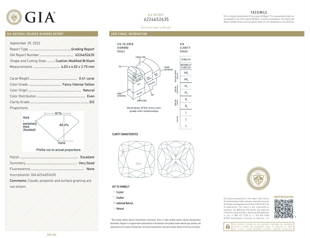 A loose cushion cut Diamond of 0.41ct (with GIA report graded as Natural Fancy Intense Yellow Even SI2 #6224652635). (New)