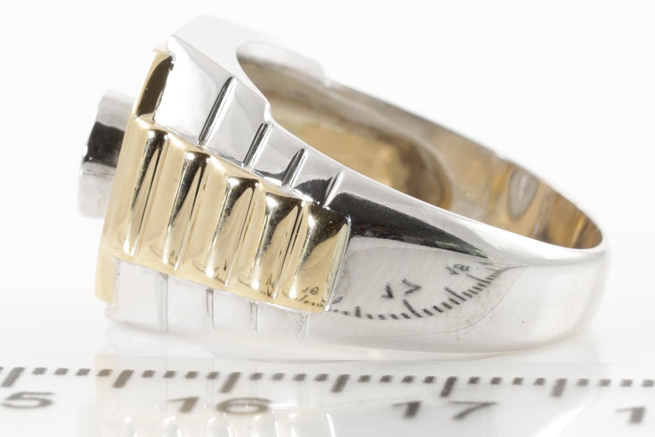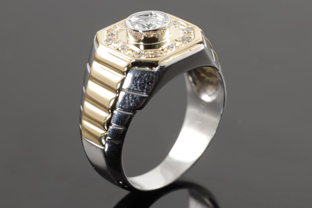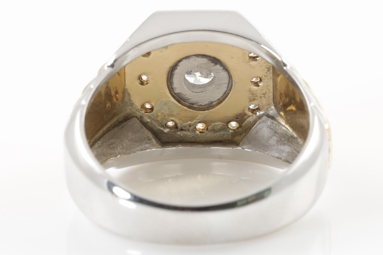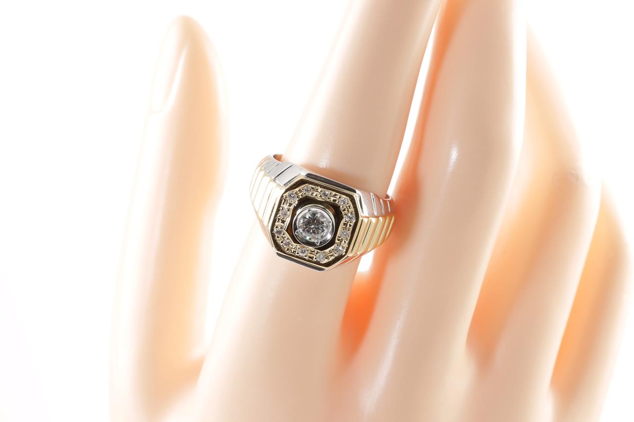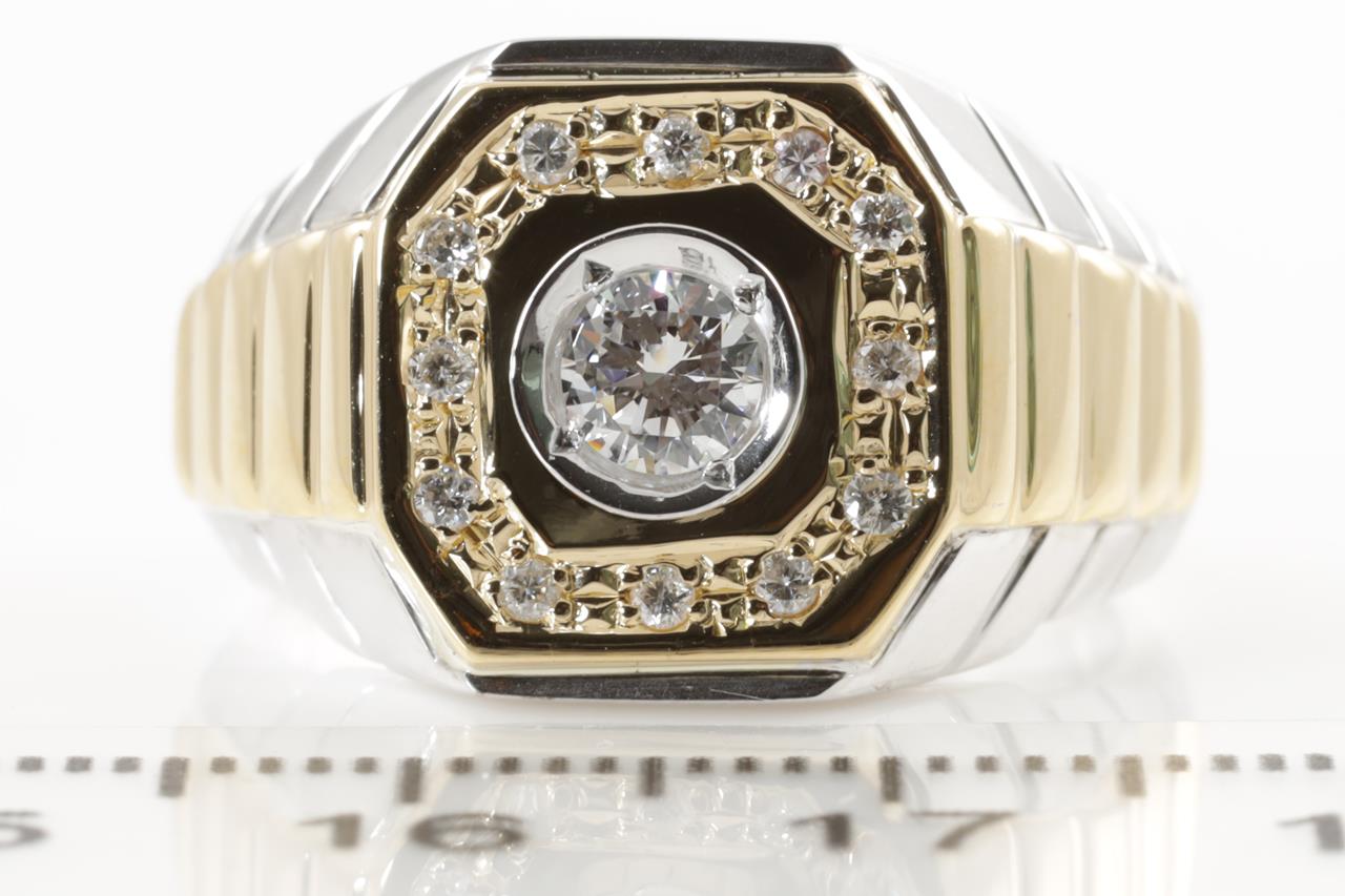 Diamond mens ring with centre round Diamond of 0.28cts (Estimated grading: H SI) and remaining diamonds totalling 0.13cts. 18ct yellow gold & platinum. Ring size Q1/2. Weight: 12.6g. (Pre-owned)