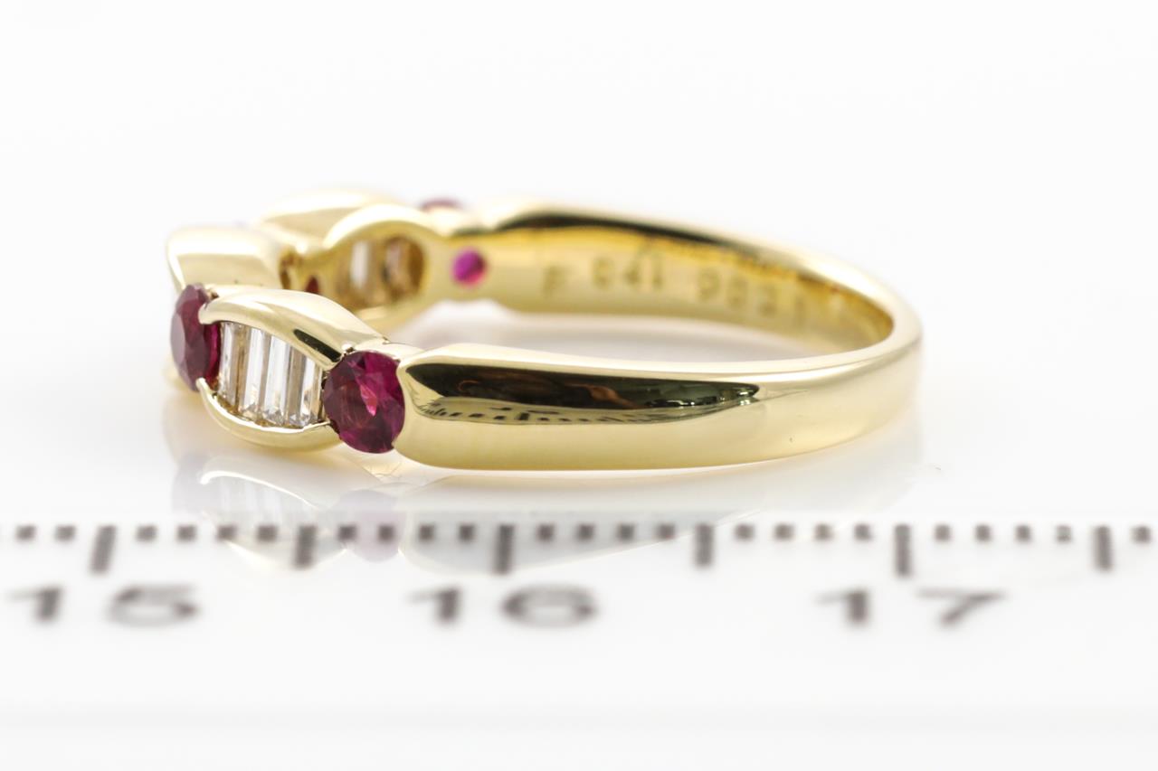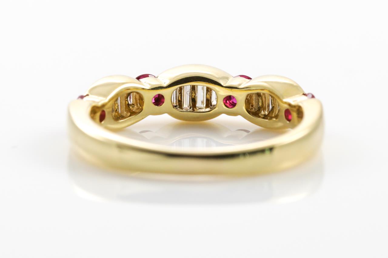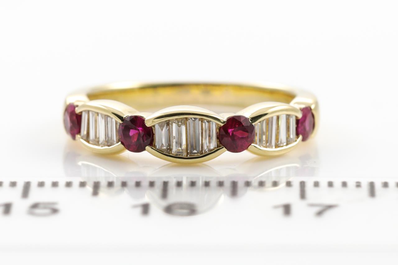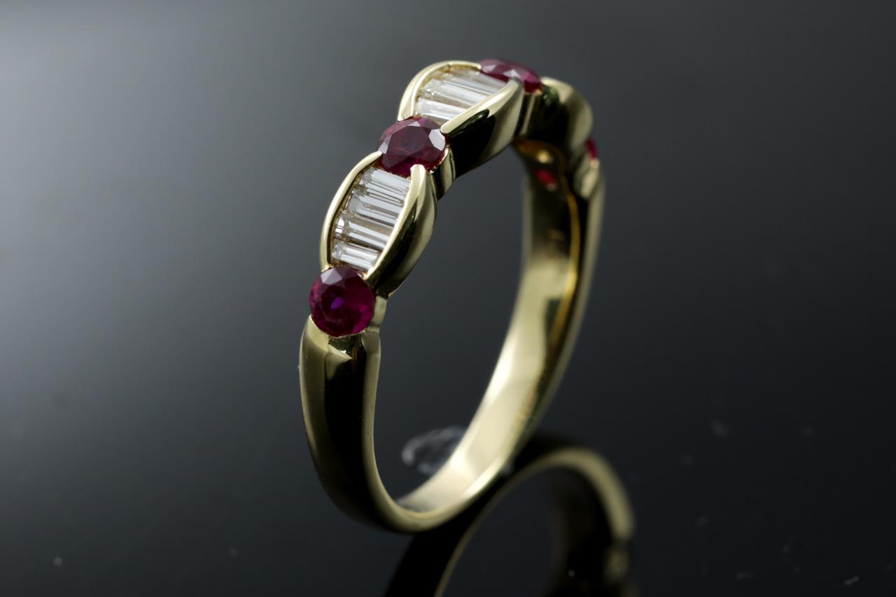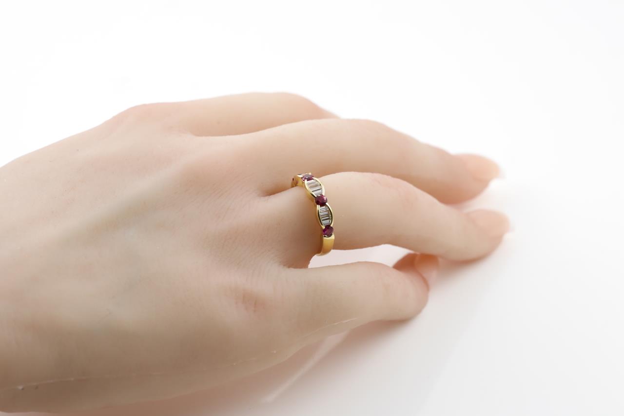 Ruby and Diamond Ring with round Rubies totalling 0.41cts and baguette cut Diamonds totalling 0.31cts (Estimated grading: H VS). 18ct yellow gold. Ring size: J- ring resizing is not recommended. Weight: 3.4g (Pre-owned)