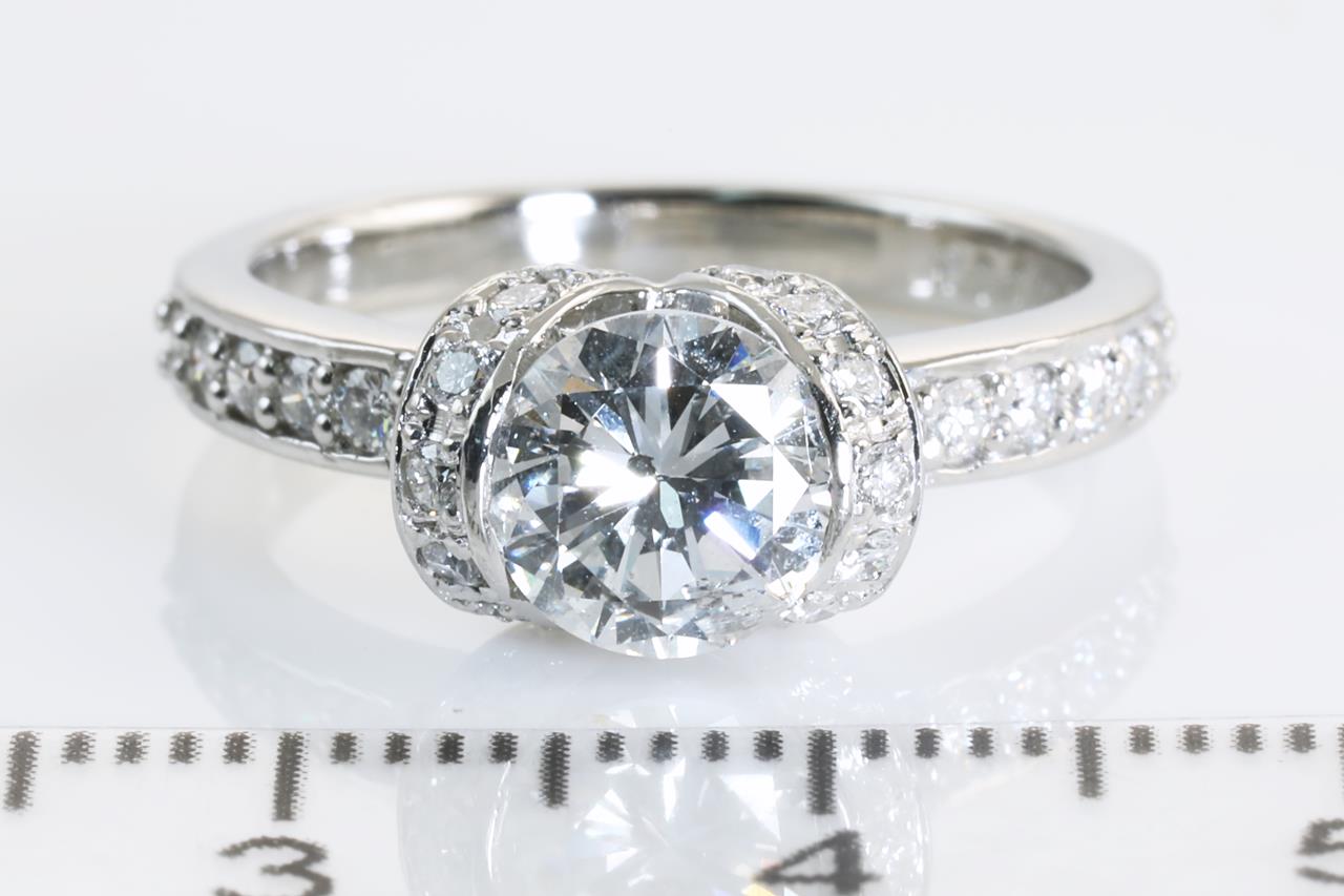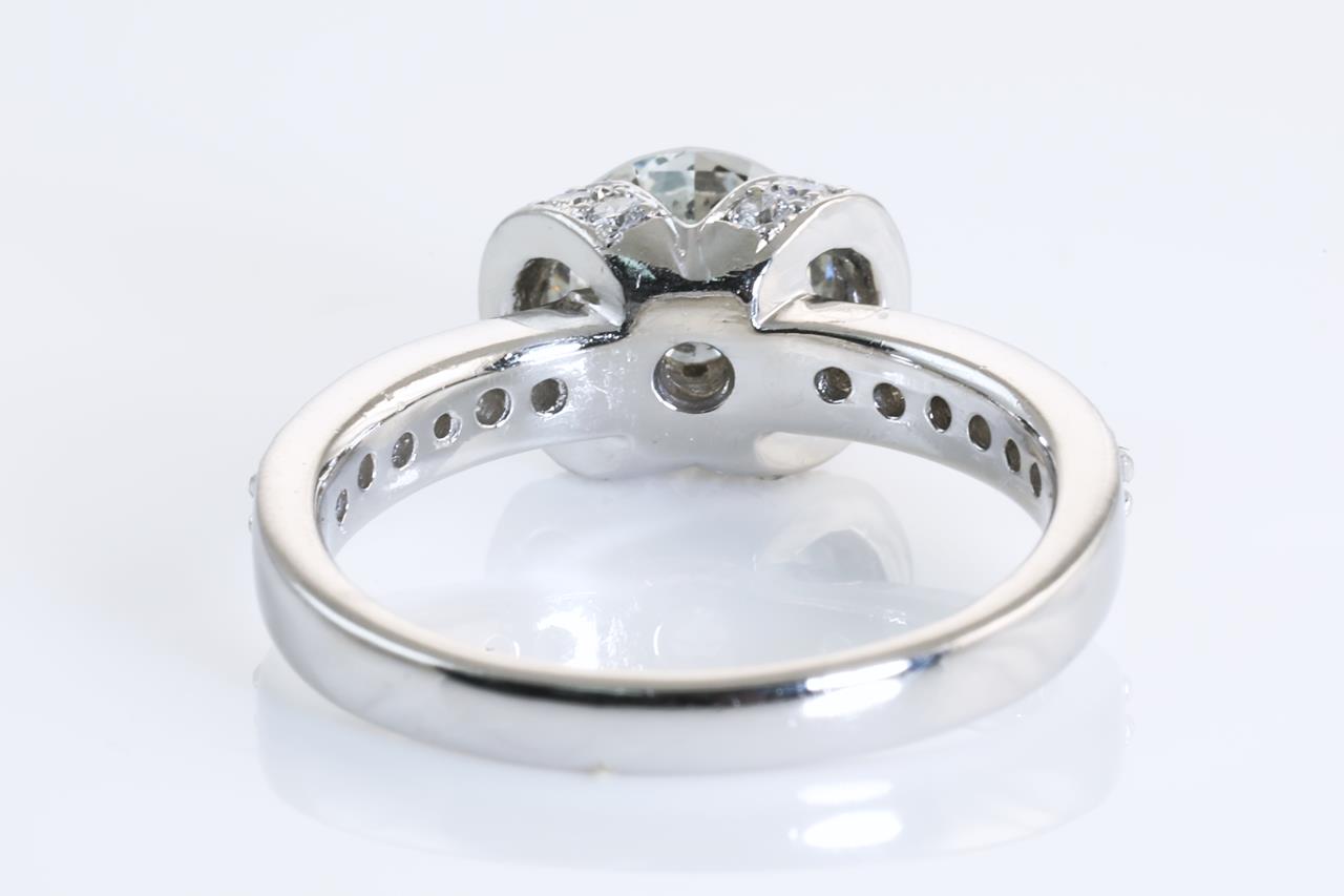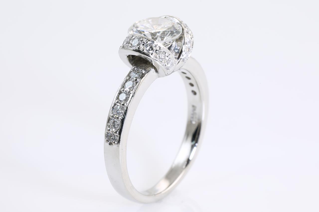 Diamond ring with a centre round brilliant cut Diamond of 1.15ct (Estimated grading: F SI2) and remaining Diamonds totalling 0.42cts (Estimated grading: F VS). Platinum. Ring size K1/2. Weight: 6.4g. With certificate #414164. (Pre-owned)