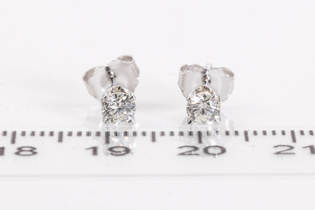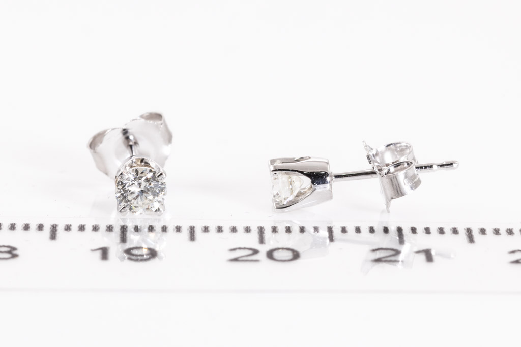 Diamond stud earrings with 2 round Diamonds totalling 0.42cts (Estimated grading: J P1). 18ct white gold. Weight: 0.9g. (New)