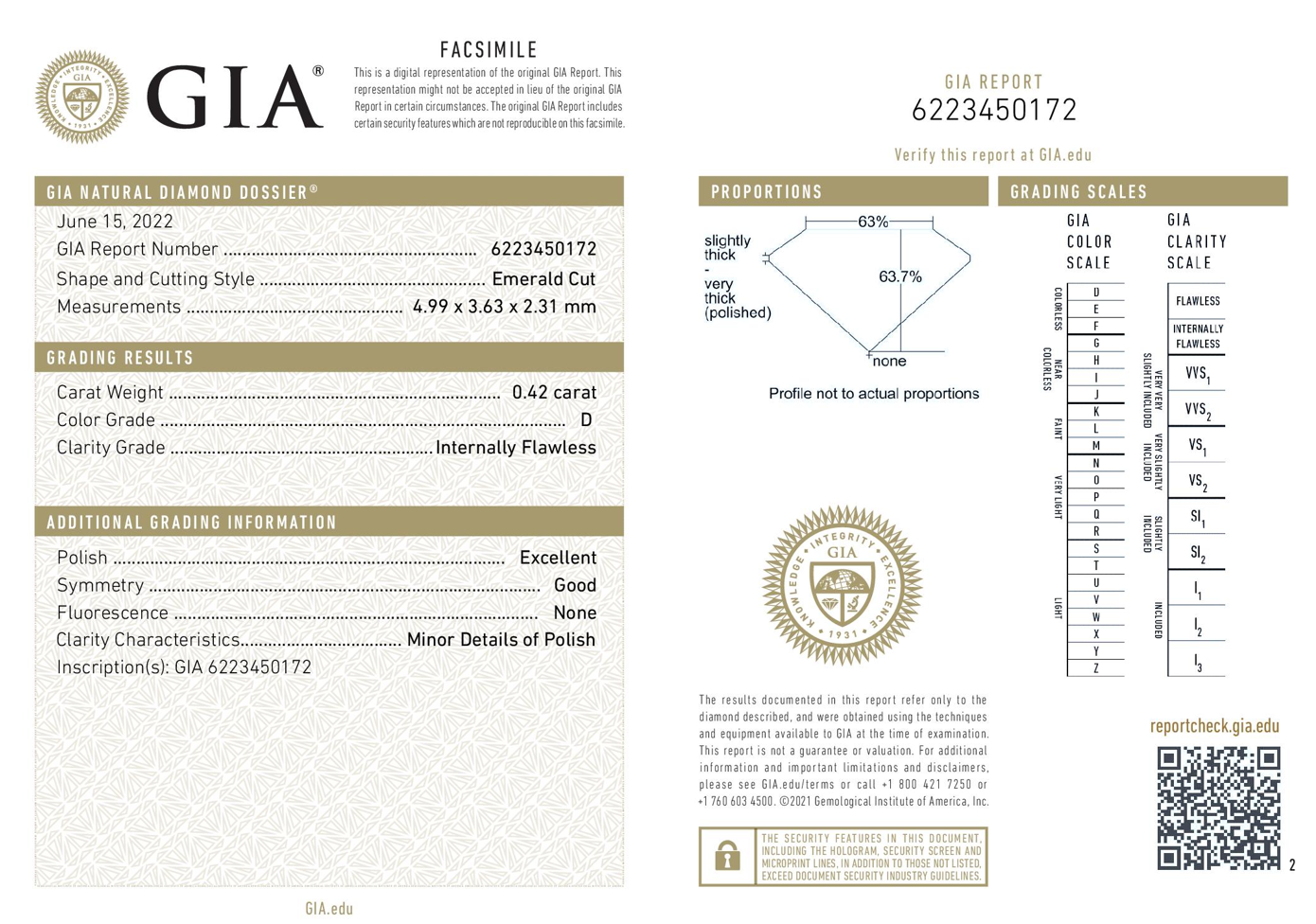 A loose emerald cut Diamond of 0.42ct (with GIA summary report of D IF #6223450172). (New)