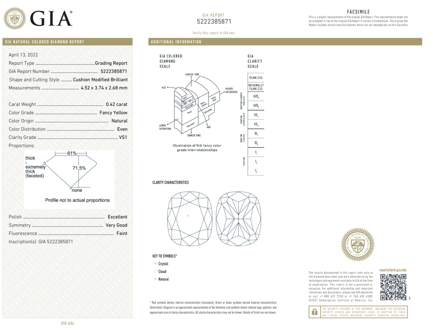 A loose cushion cut Diamond of 0.42ct (with GIA report graded as Natural Fancy Yellow Even VS1#5222385871). (New)