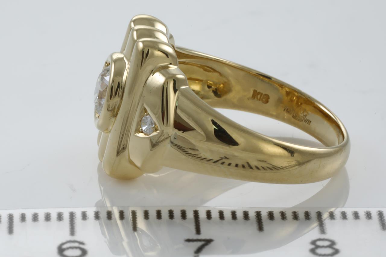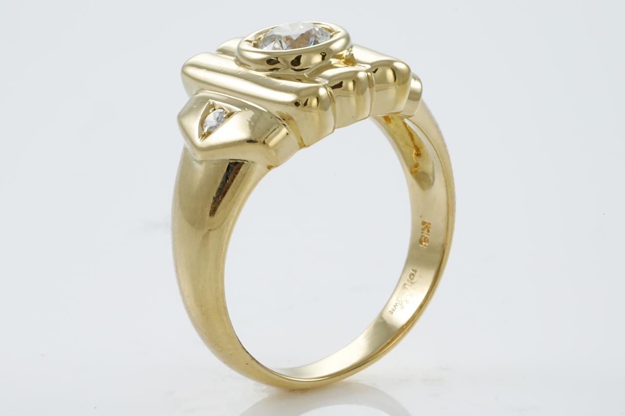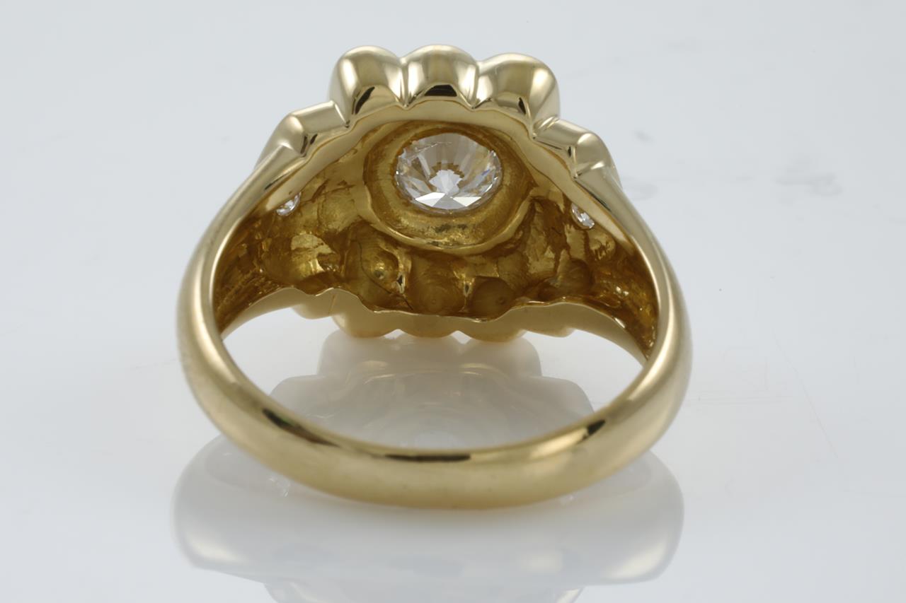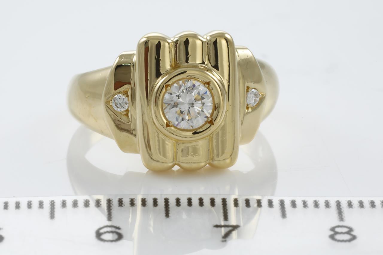 Diamond ring with centre round Diamond of 0.39cts (estimated grading: G-H SI) and surrounding Diamonds totalling 0.04cts. 18ct yellow gold. Ring size L. Weight: 5.9g (pre-owned)