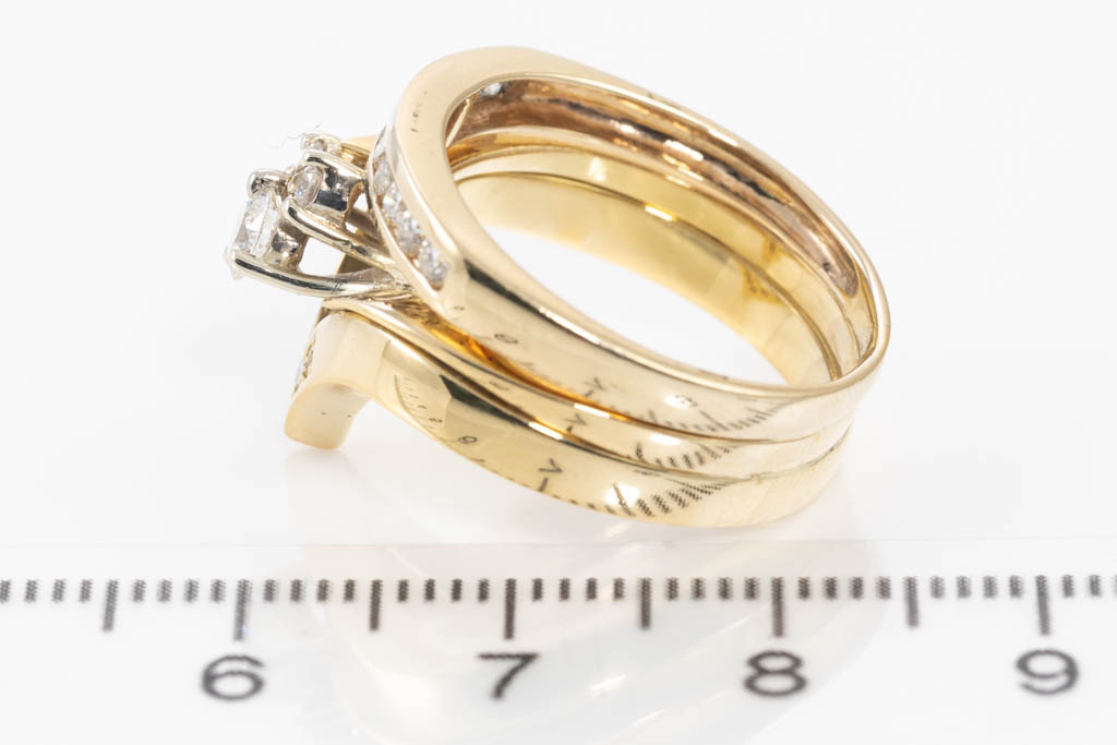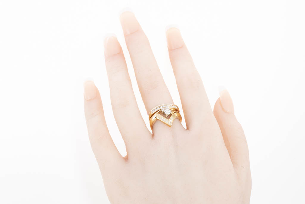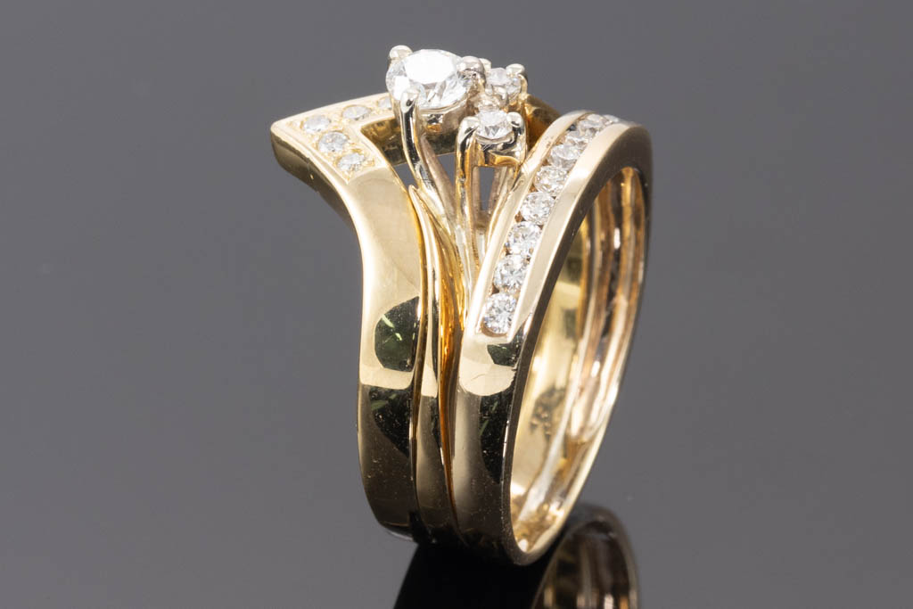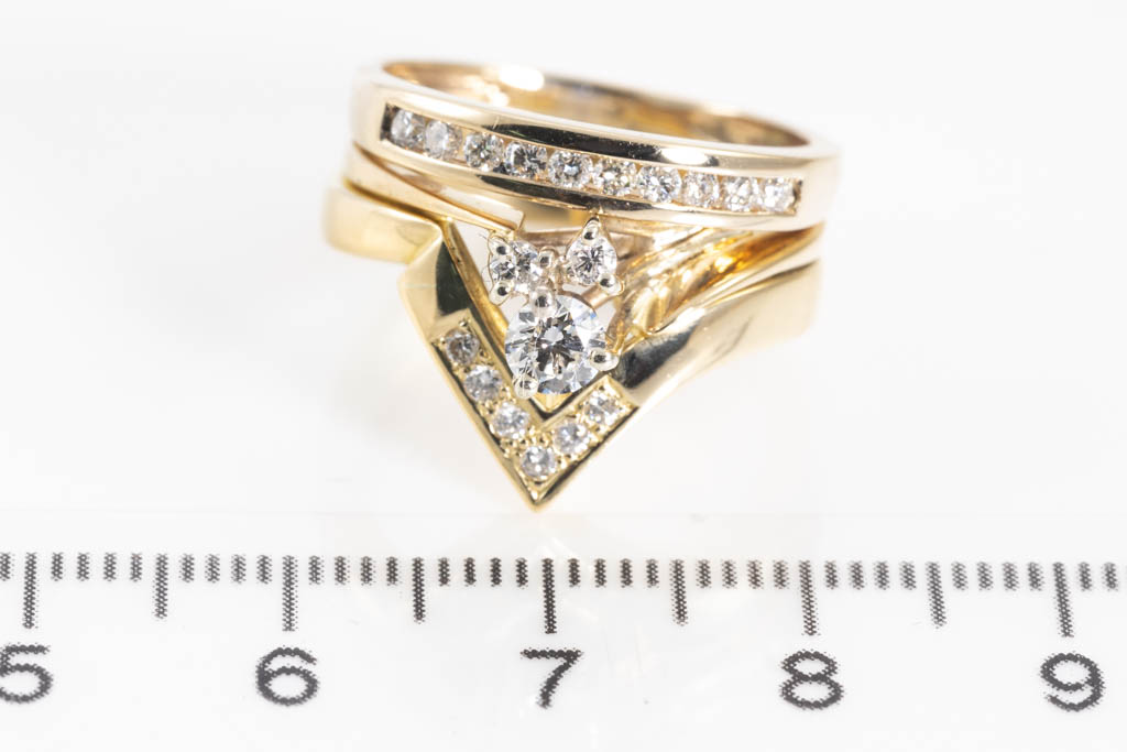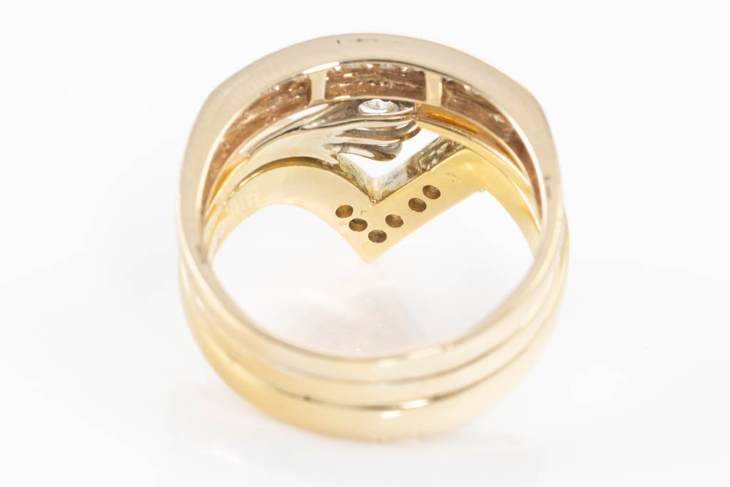 Three individual rings soldered as one Diamond dress ring with round brilliant cut Diamonds totalling approximately 0.34ct (Estimated grading: K-L SI). 18ct yellow gold. Ring size M. Weight 8.3g (Pre-owned)