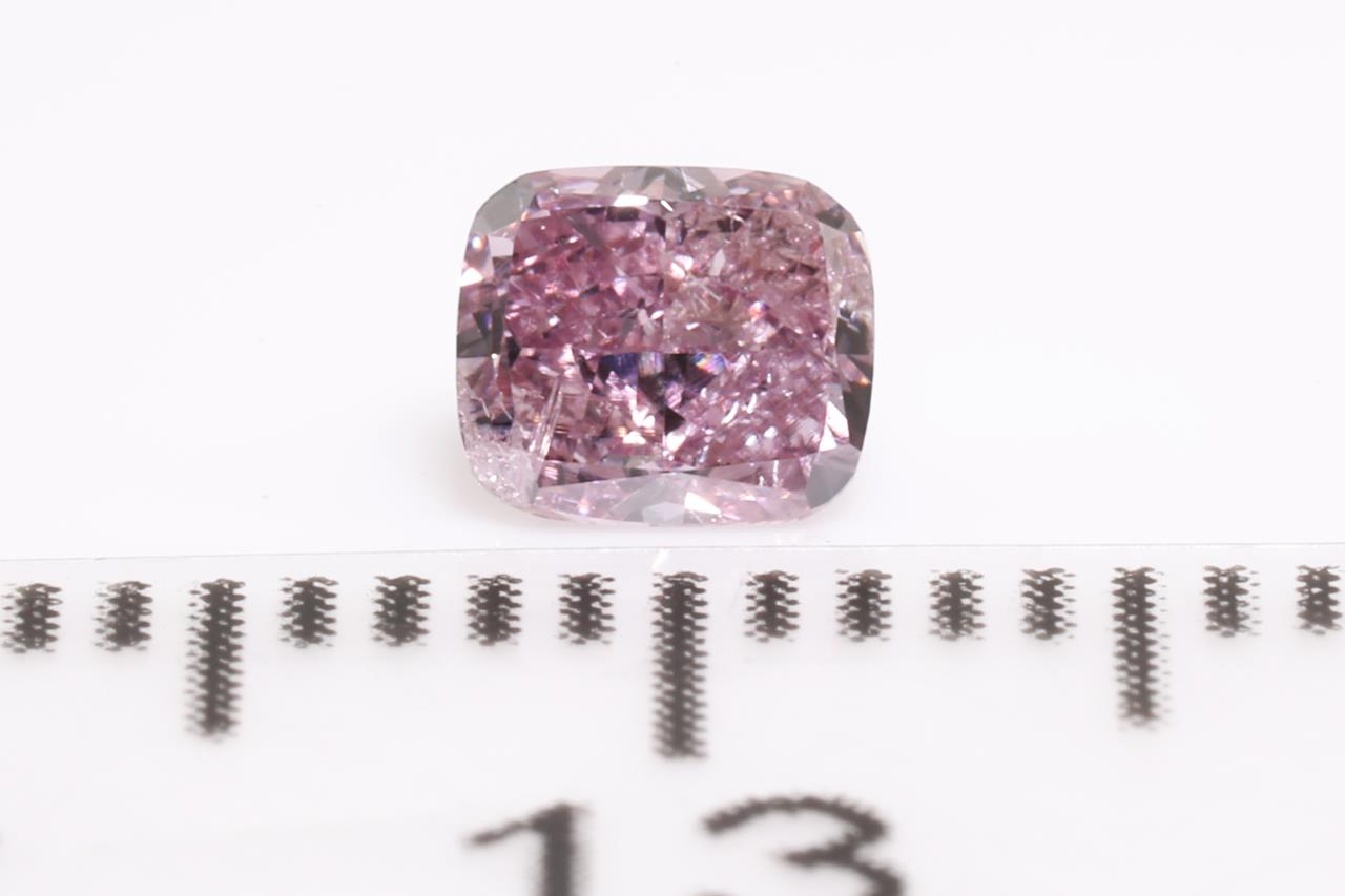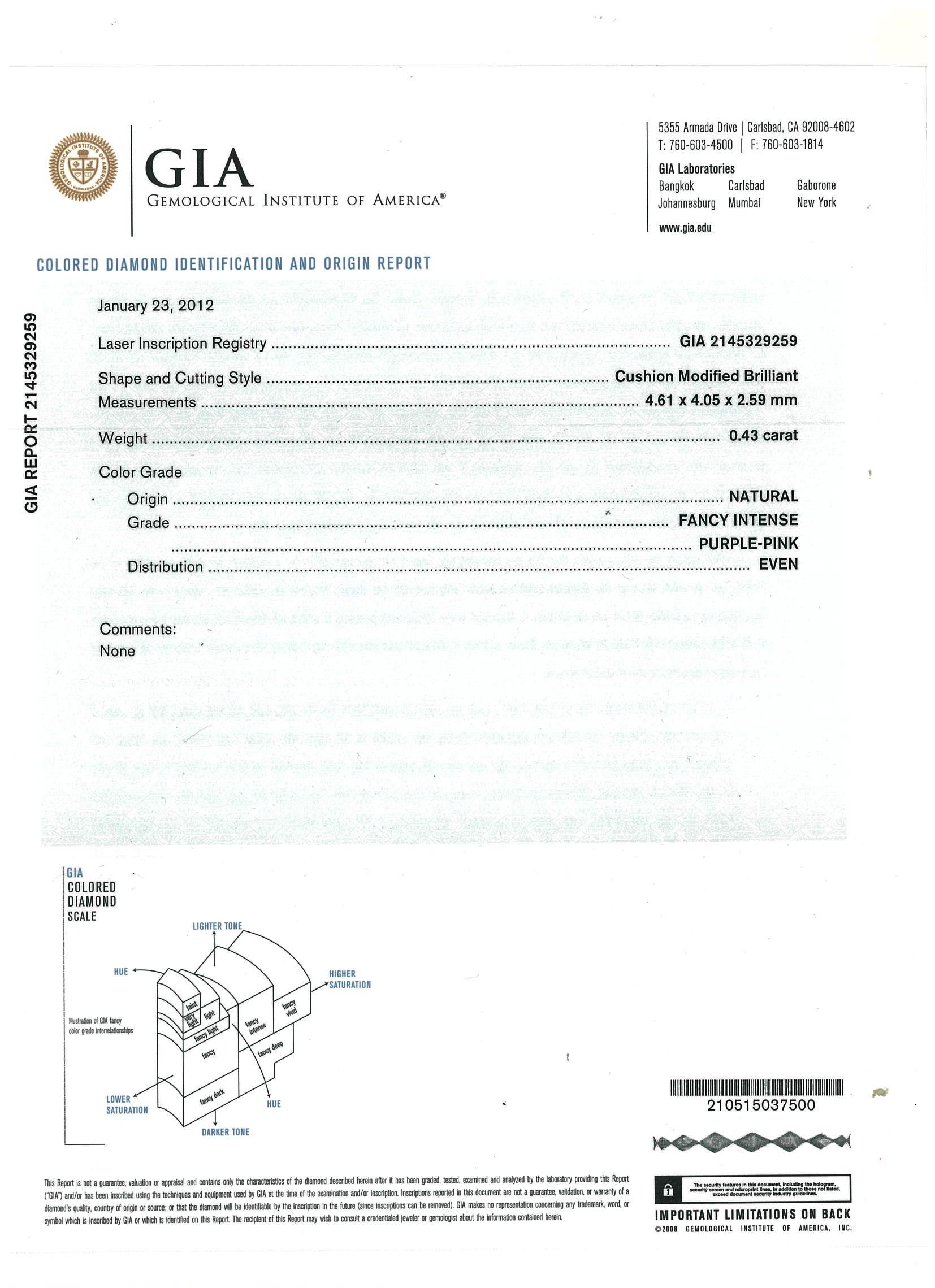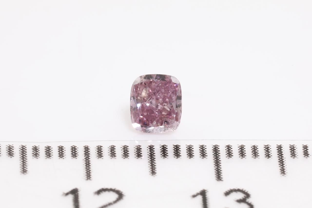 A loose cushion cut Diamond of 0.43ct (With GIA report graded as Natural Fancy Intense Purple-Pink Even #2145329259). (New)