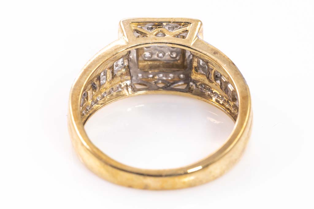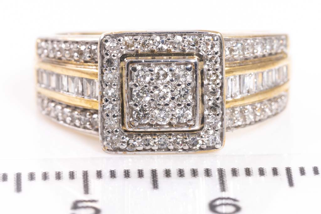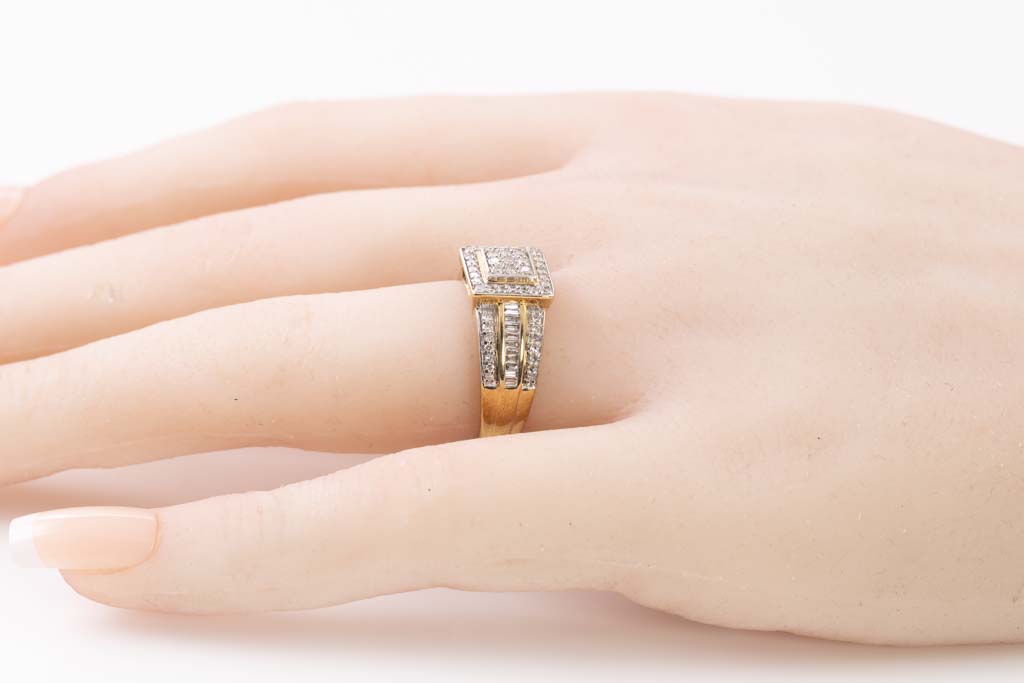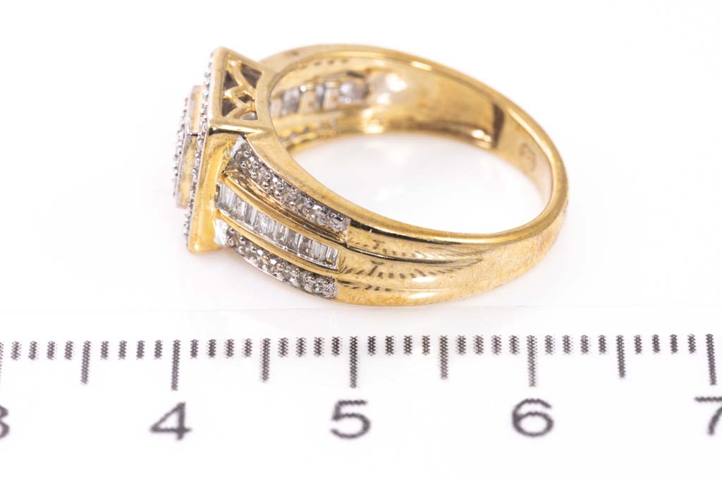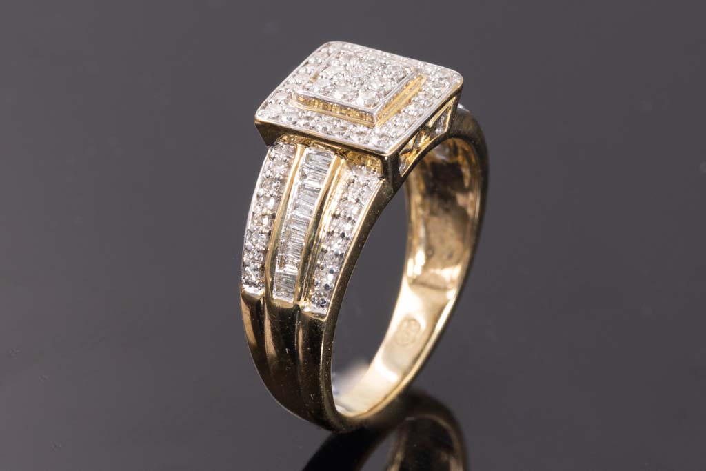 Diamond dress ring with round and baguette cut Diamonds totalling 0.45cts (Estimated grading: TTLB SI). 9ct yellow gold. Ring size L1/2. Weight: 3.5g. With Valuation Certificate Ref# 032900077807. (Pre-owned)