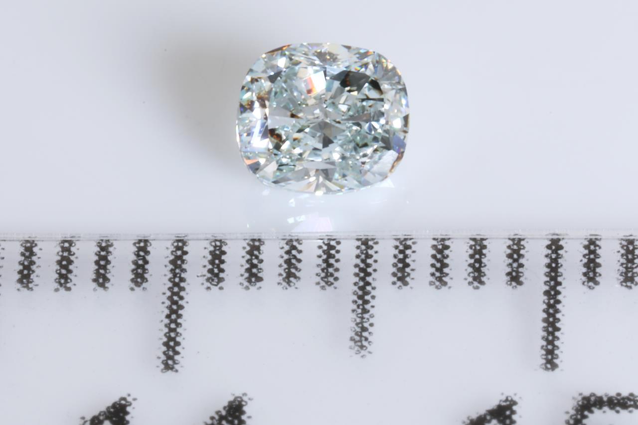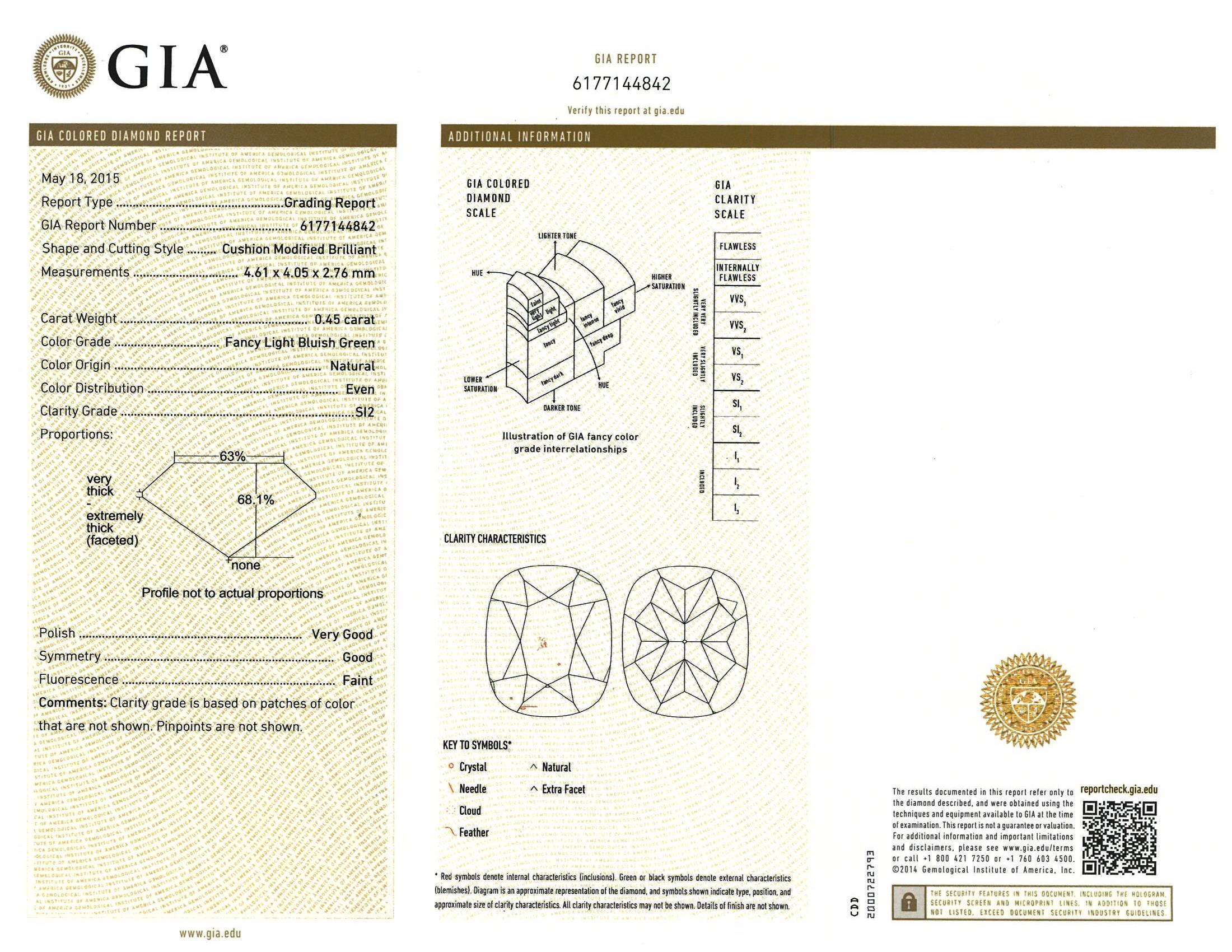 A loose Cushion cut Diamond of 0.45ct (with GIA report graded as Natural Fancy Light Bluish Green Even SI2 # 6177144842). (new)