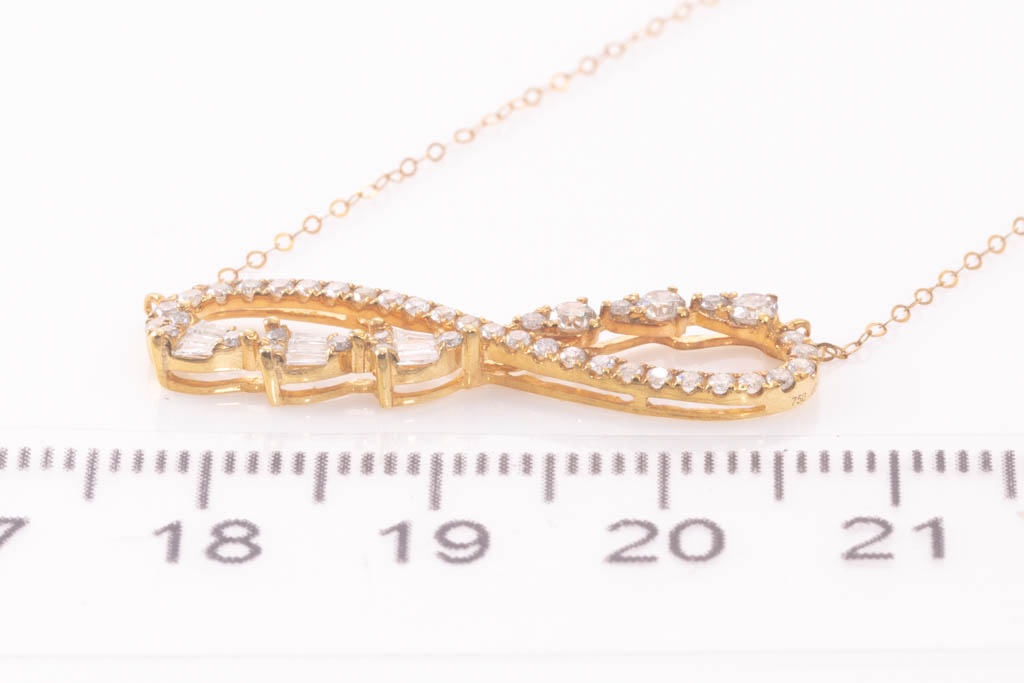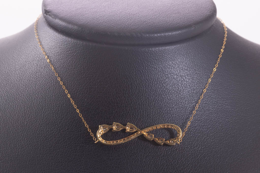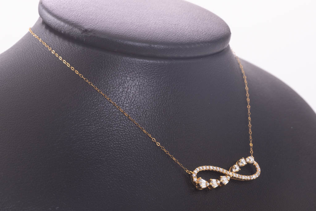 Diamond infinity pendant with round and baguette cut Diamonds totalling 0.46cts (Estimated grading: H-I P1). 18ct yellow gold with attached 18ct yellow gold chain. Maximum adjustable Length: 45cm, Weight: 1.8g. (Pre-owned)