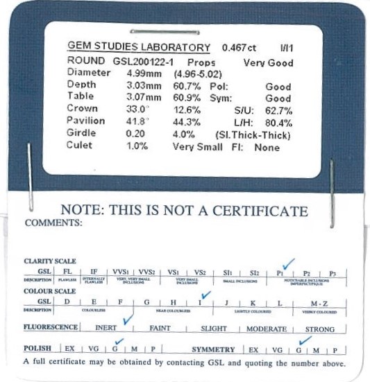 A loose round brilliant cut Diamond of 0.46ct (With GSL memo graded as I P1 #200122-1. (New)