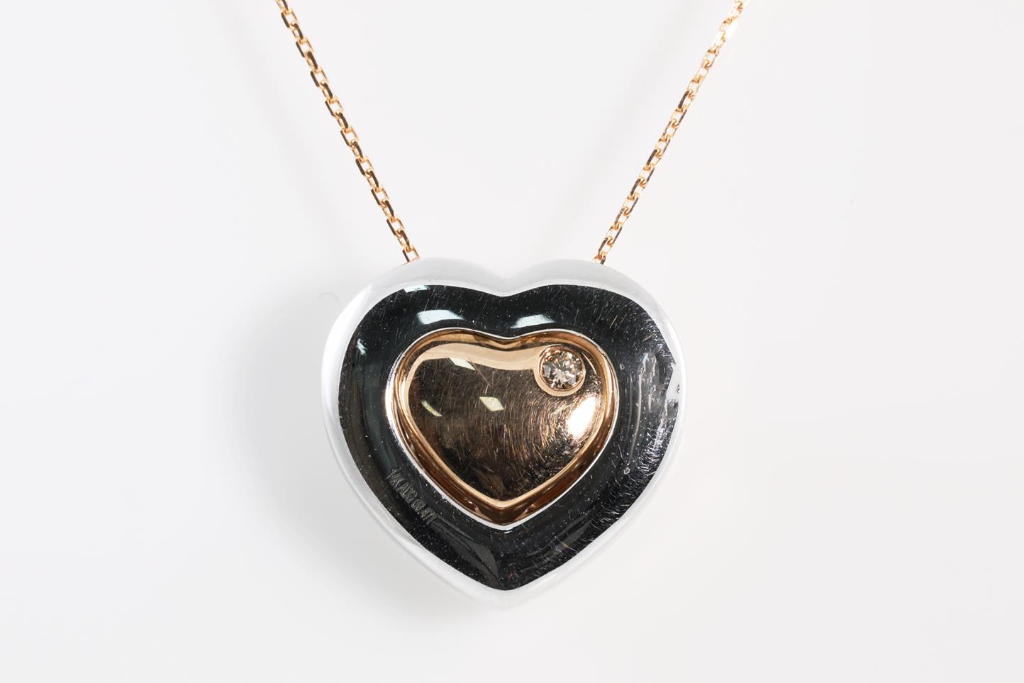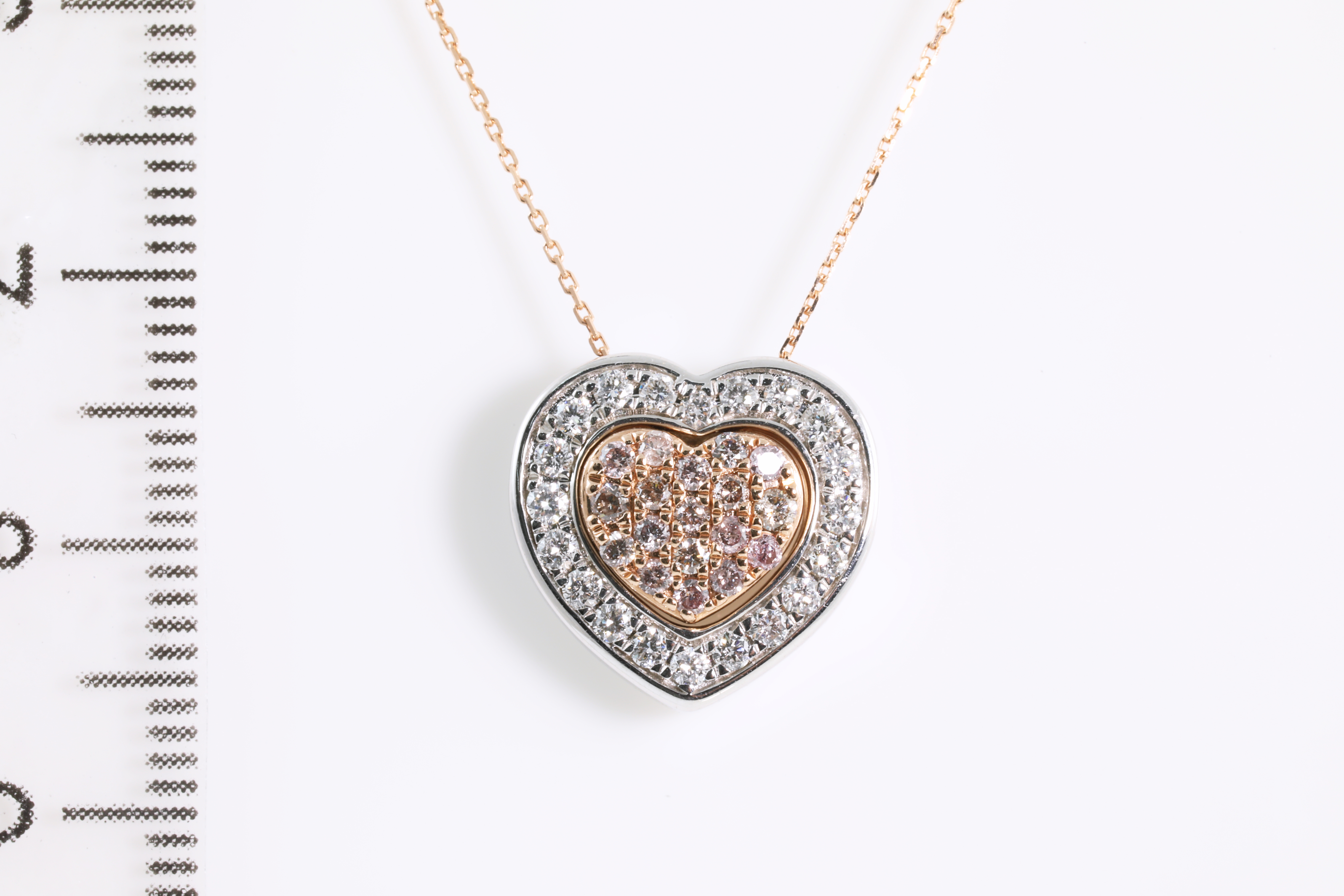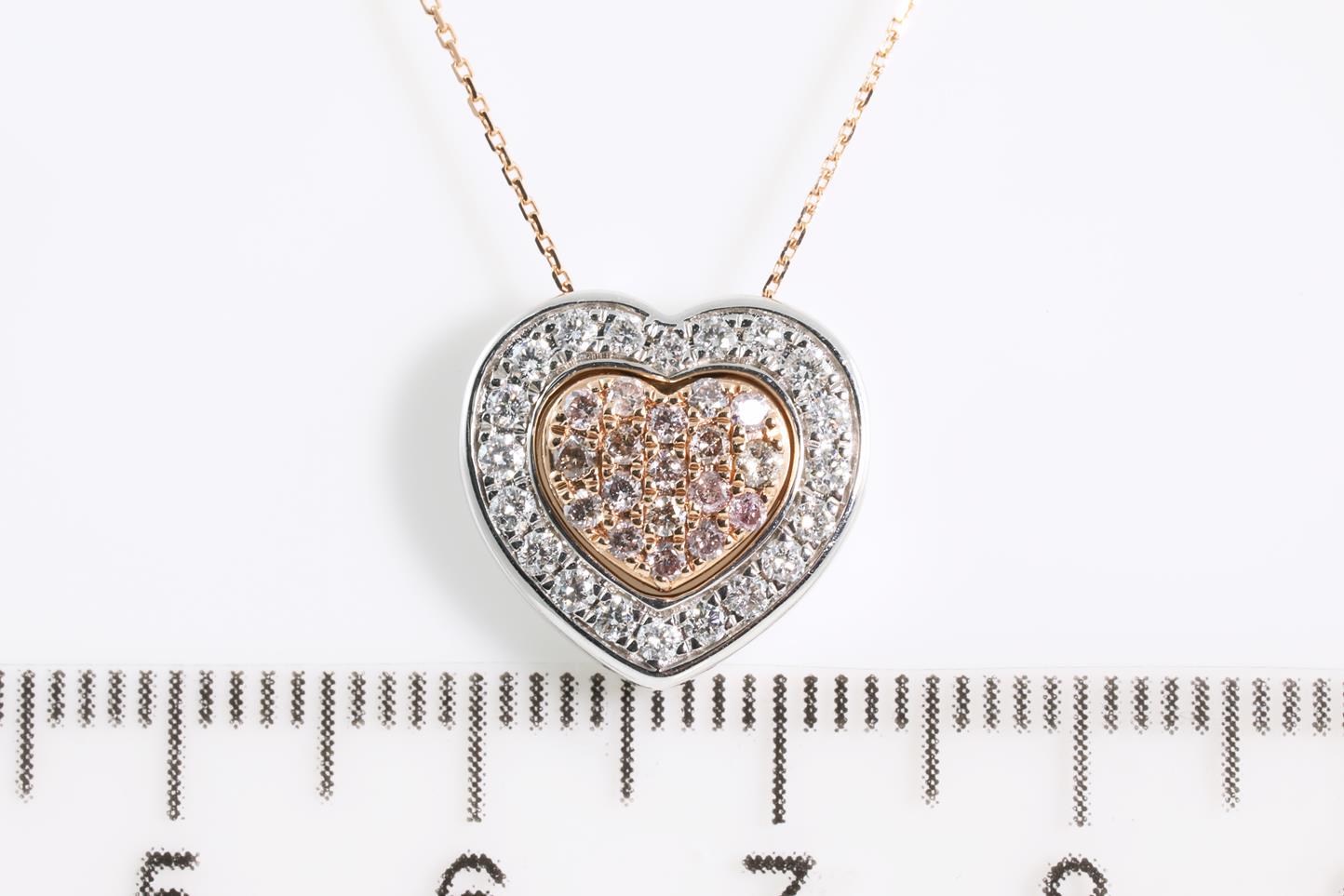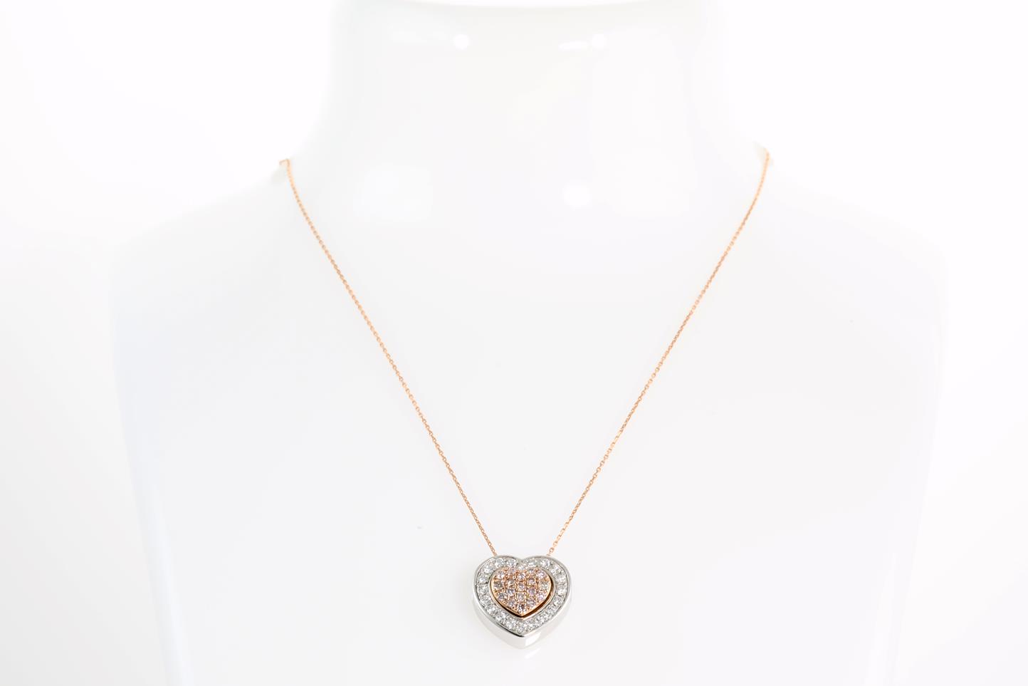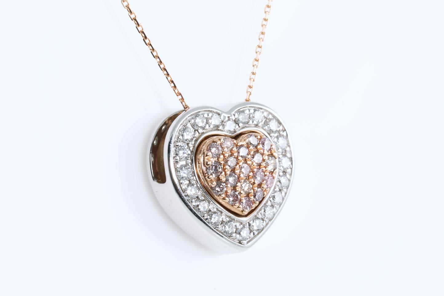 Diamond heart pendant with reversible halo of round pink Diamonds totalling 0.20cts and white Diamonds totalling 0.27cts (Estimated grading: G-H SI). 14ct white and rose gold with 14ct gold 45cm chain. Weight: 4.0g (As New)
