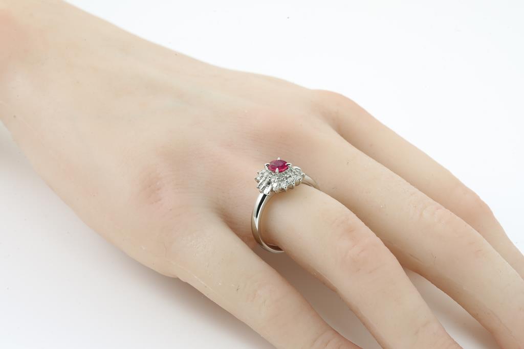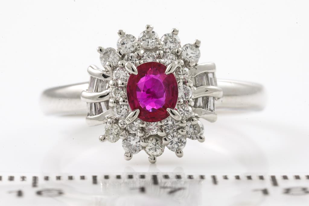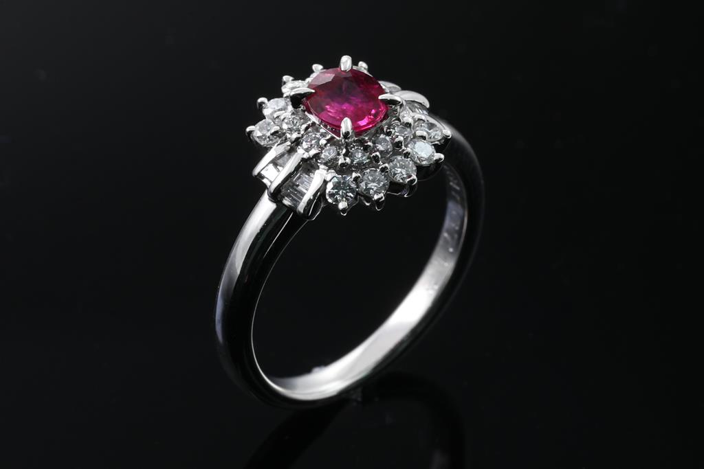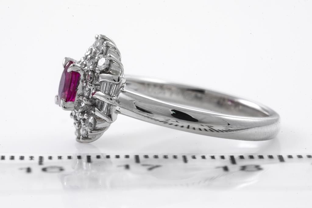 Ruby and Diamond ring with an oval shape Ruby of 0.47ct and round & baguette cut Diamonds totalling 0.34cts (Estimated grading: H SI). Platinum. Ring size L1/2. Weight: 6.9g. (Pre-owned)