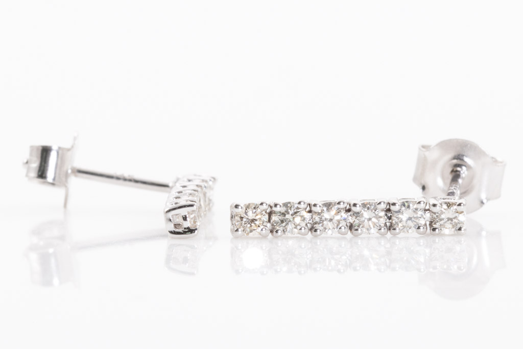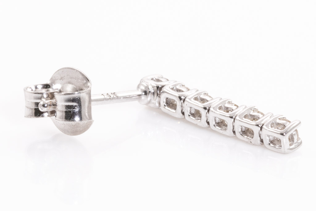 Diamond drop earrings with 12 round Diamonds totalling 0.48cts (Estimated grading: J SI). 14ct white gold. Weight: 1.3g. (New)