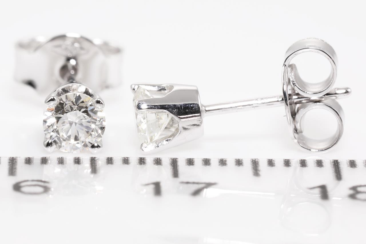 Diamond stud earrings with 2 round brilliant cut Diamonds totalling 0.48cts (Estimated grading: I-J SI-P1). 18ct white gold. Weight: 1.2g. (New).