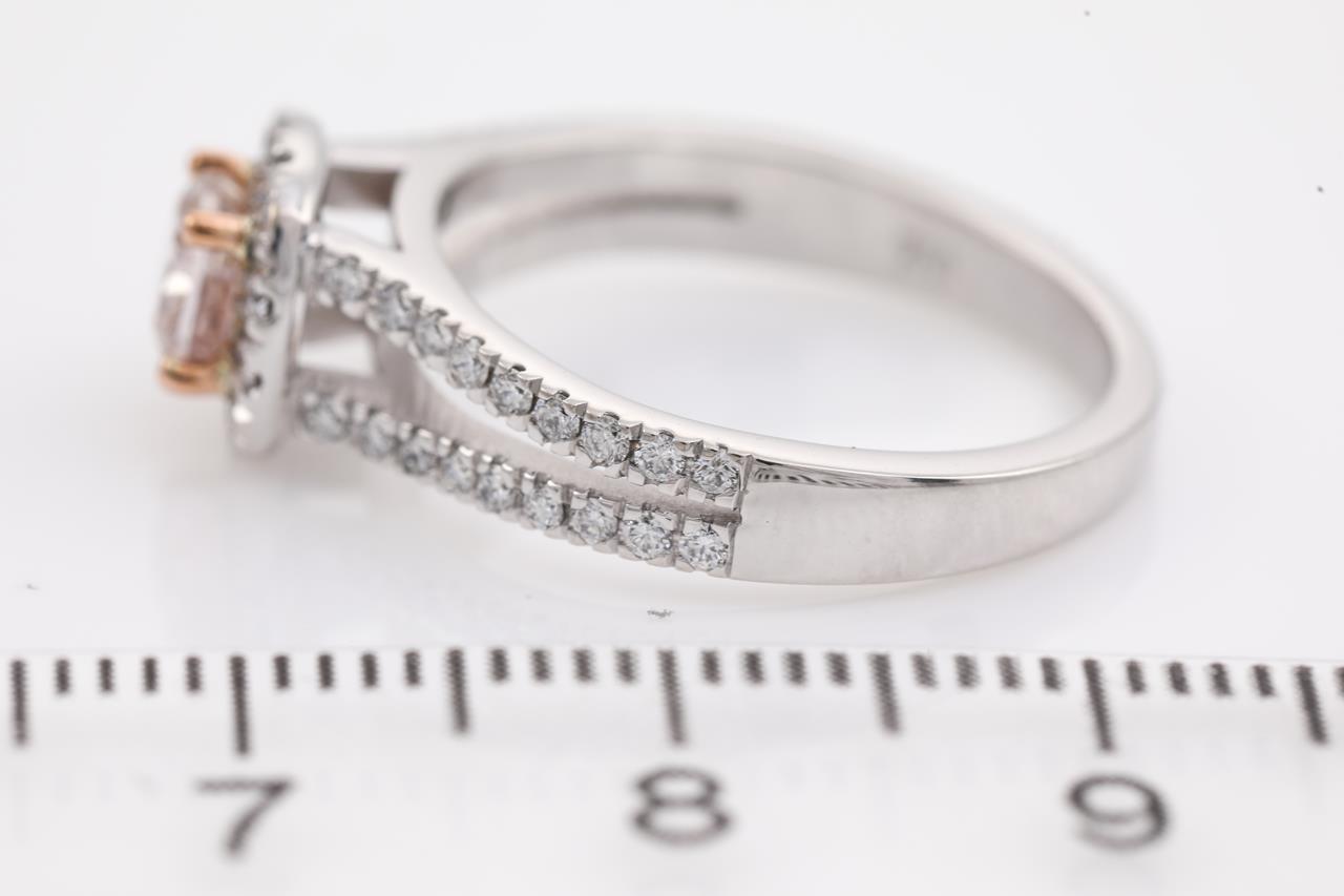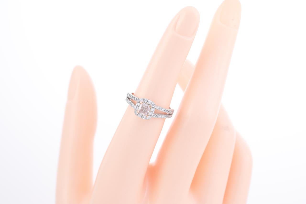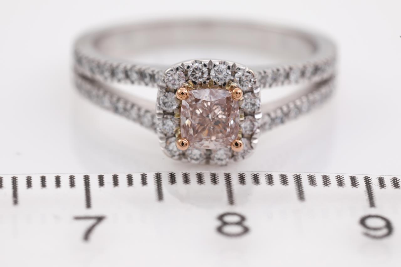 Diamond Ring with centre cushion cut Diamond of 0.50ct (with GIA report graded as Natural Fancy Brownish Pink Even P1 #2193502056) and remaining 48 Diamonds totalling 0.40cts (Estimated grading: G-H VS-SI). 18ct white and rose gold. Ring size L. Weight 4.5g. (New)