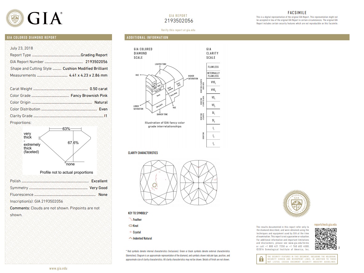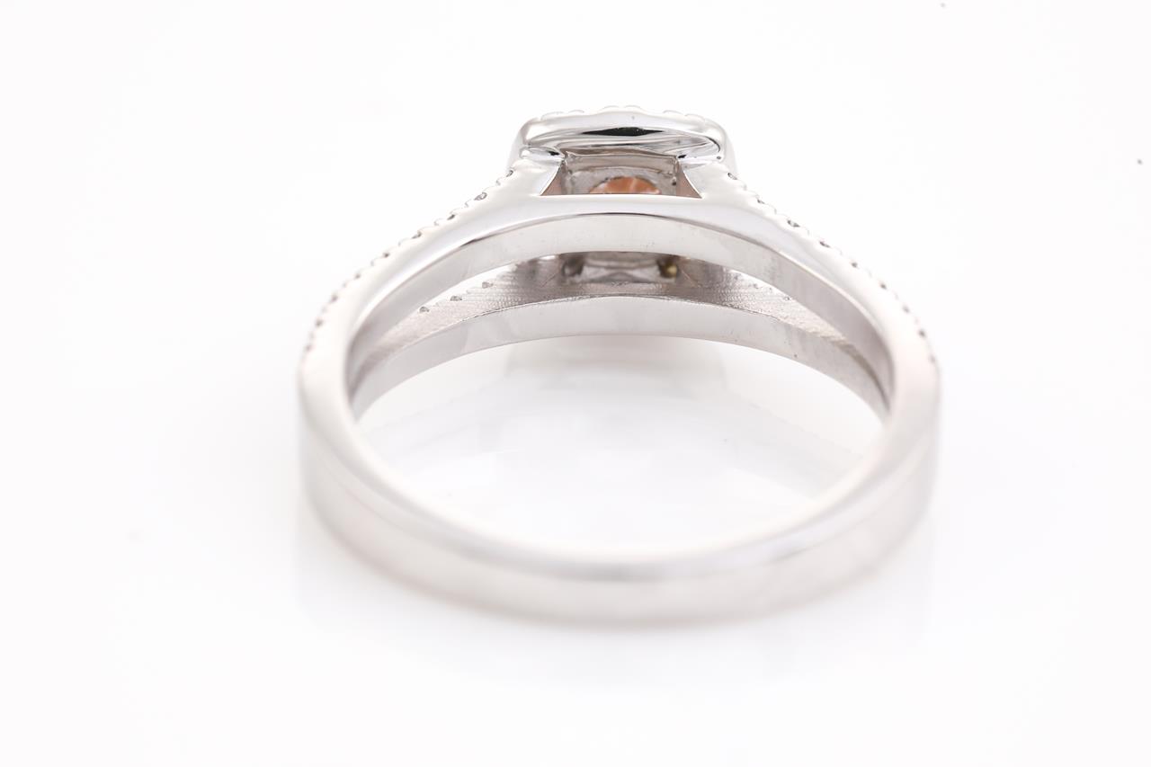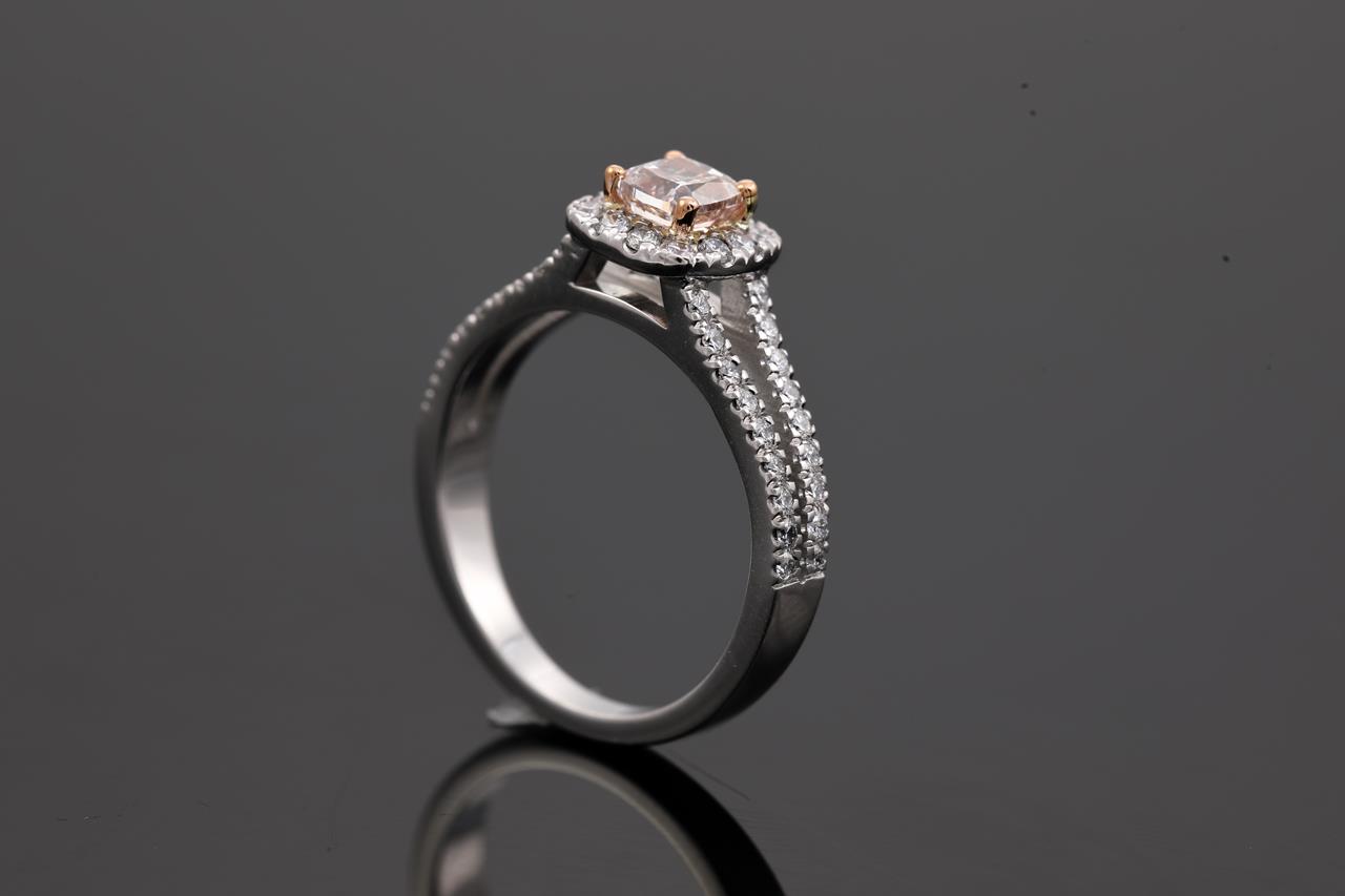 Diamond Ring with centre cushion cut Diamond of 0.50ct (with GIA report graded as Natural Fancy Brownish Pink Even P1 #2193502056) and remaining 48 Diamonds totalling 0.40cts (Estimated grading: G-H VS-SI). 18ct white and rose gold. Ring size L. Weight 4.5g. (New)