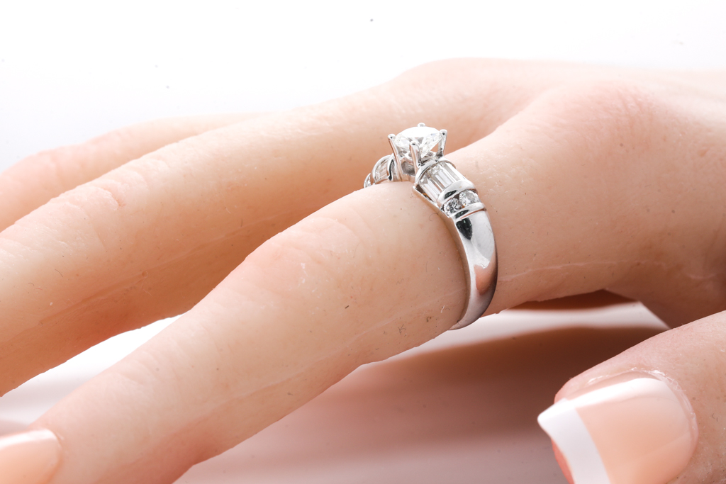 Diamond dress ring with centred round Diamond of aproximately 0.50ct (Estimated grading H-I SI) and baguette & round cut Diamonds totalling approcimately 0.98cts (estimated grading H-I SI). 18ct white gold. Ring size J. Weight 3.4g. (Pre-owned)