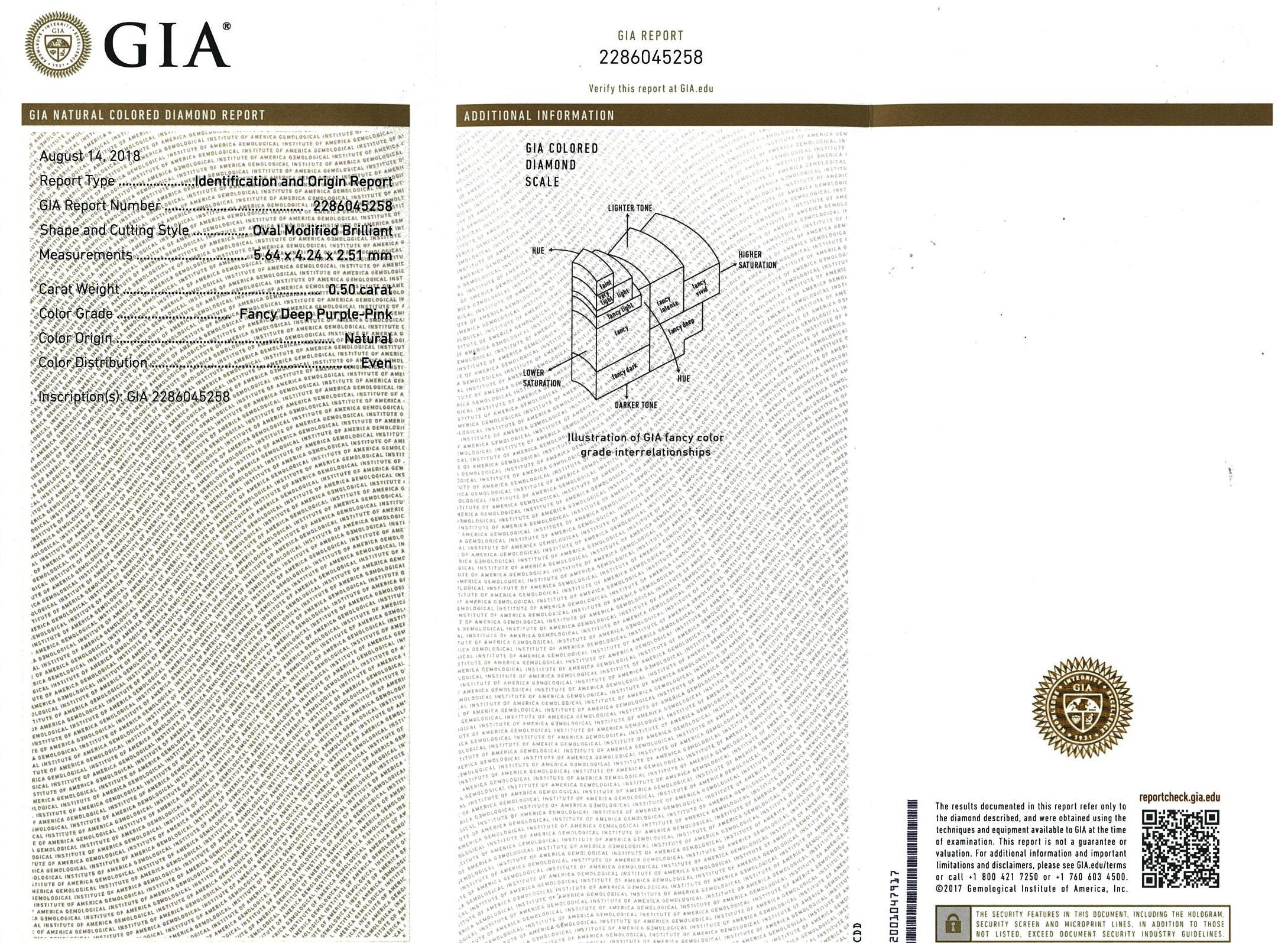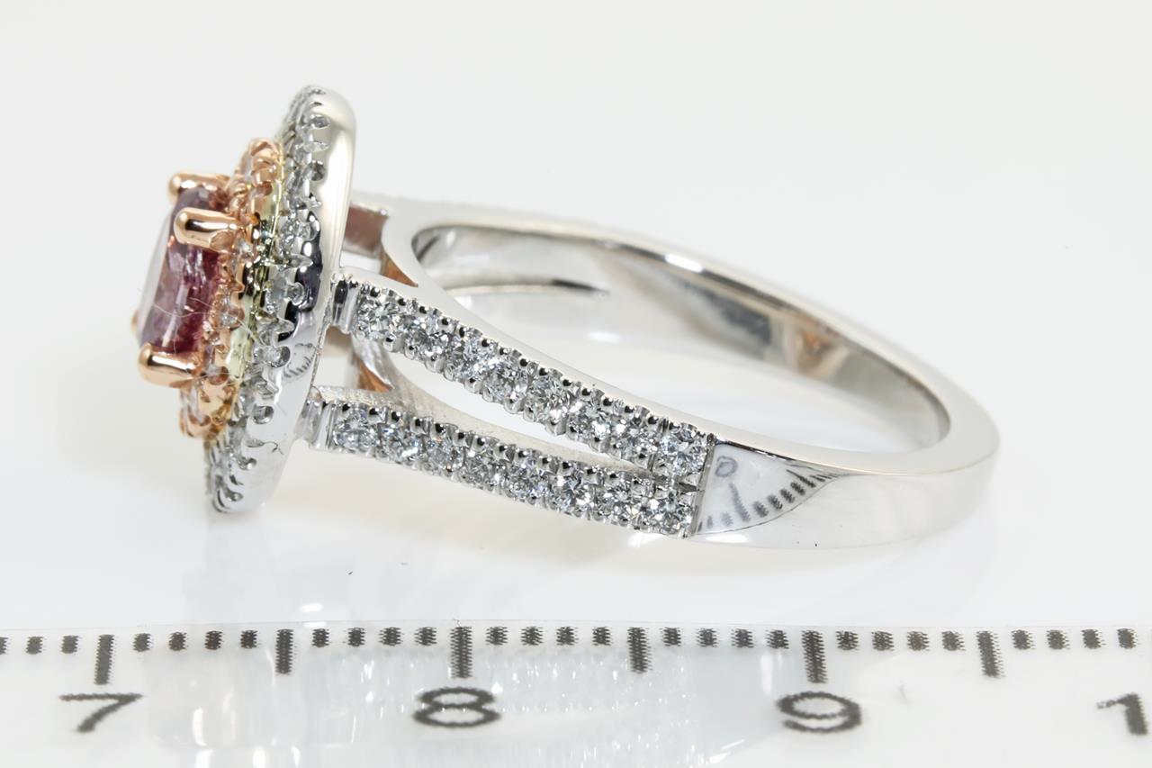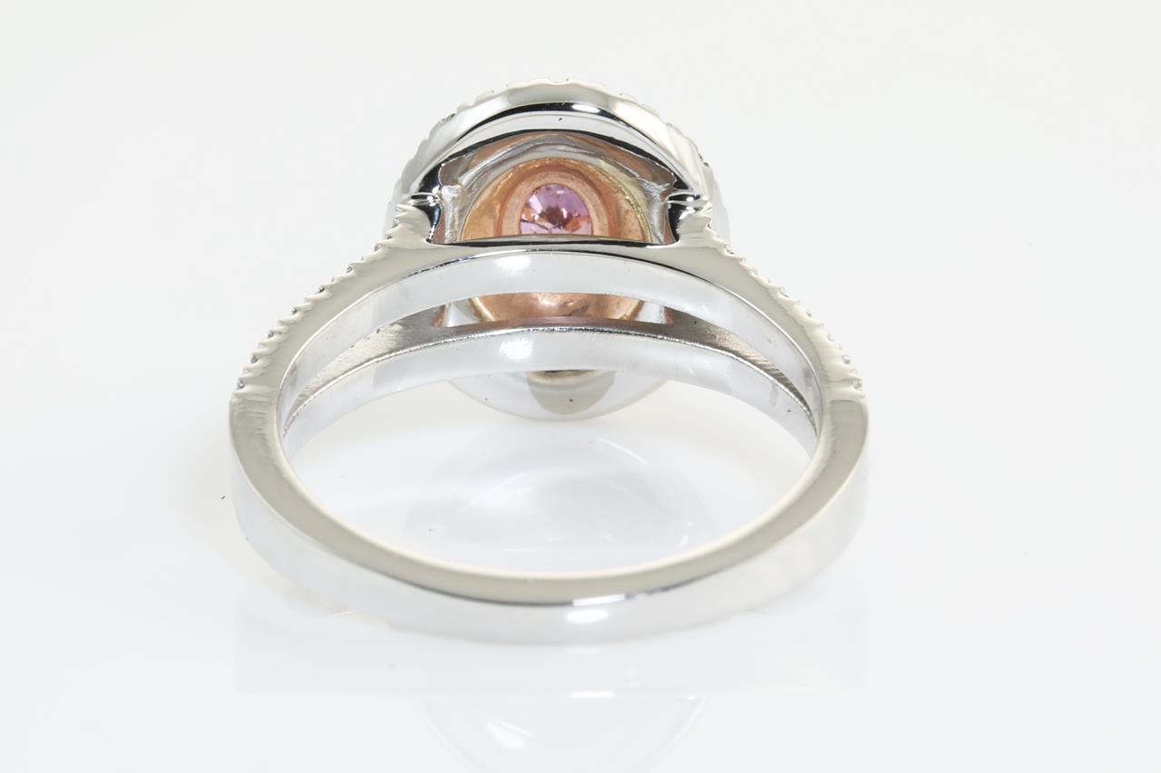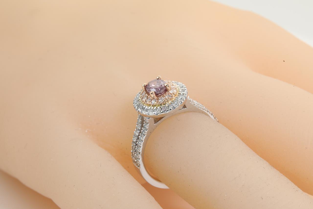 Diamond double halo ring with a centre oval Diamond of 0.50ct (with GIA report graded as Natural Fancy Deep Purple-Pink Even #2286045258) and remaining white Diamonds totalling 0.61cts (Estimated grading: H SI). 18ct rose & white gold. Ring