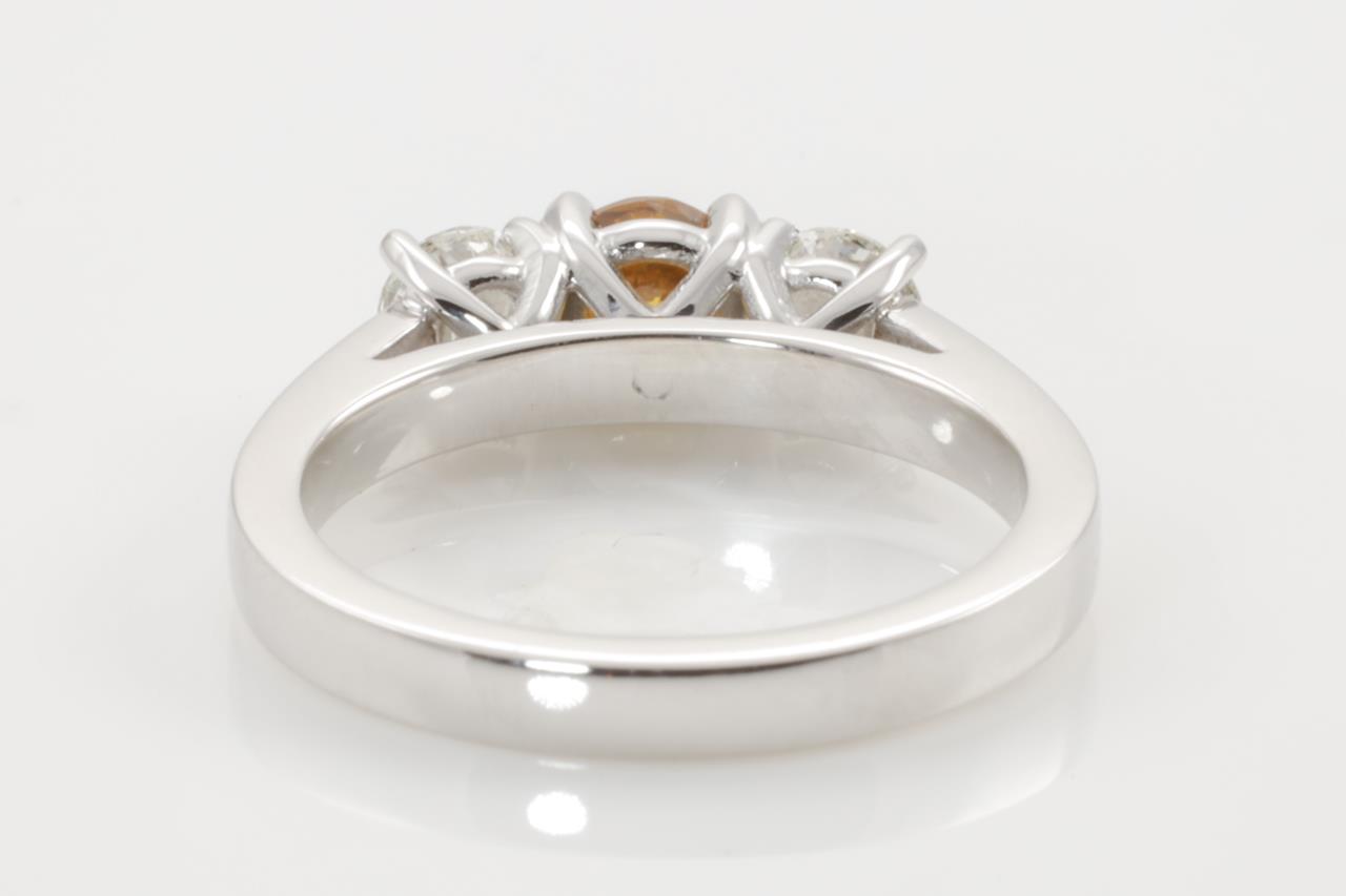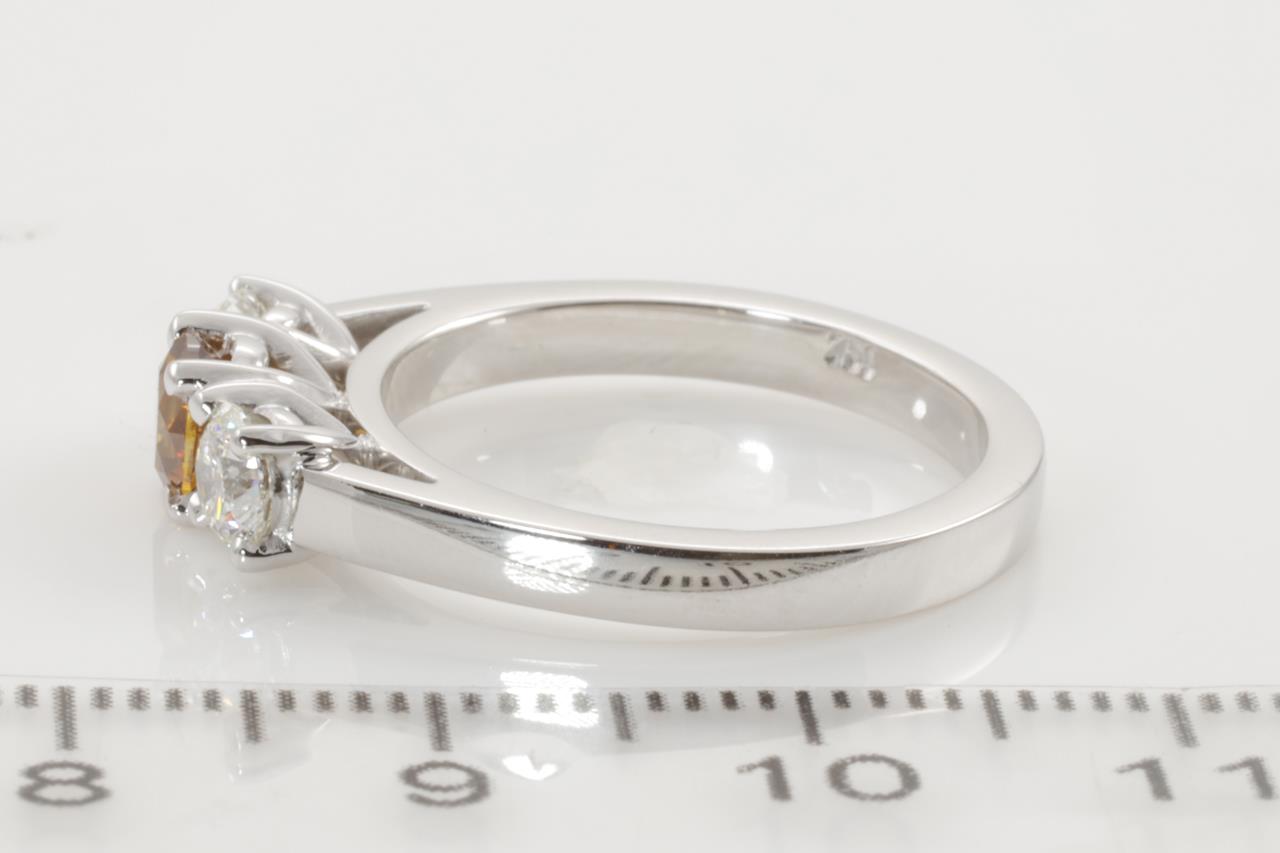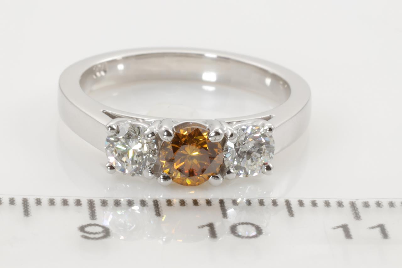 Diamond trilogy ring with centre round brilliant cut Diamond of 0.51ct (with GIA report graded as Natural Fancy Deep Yellow-Orange Even SI2 #2171417692) set with 2 round diamonds totalling 0.61cts (with GIA summary reports graded as G P1 #6352542460, 2357741823). 18ct white gold. Ring size: L1/2. Weight 5.6g. (New)