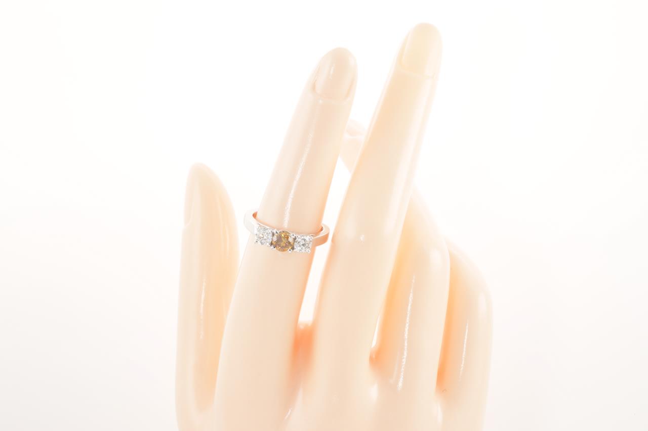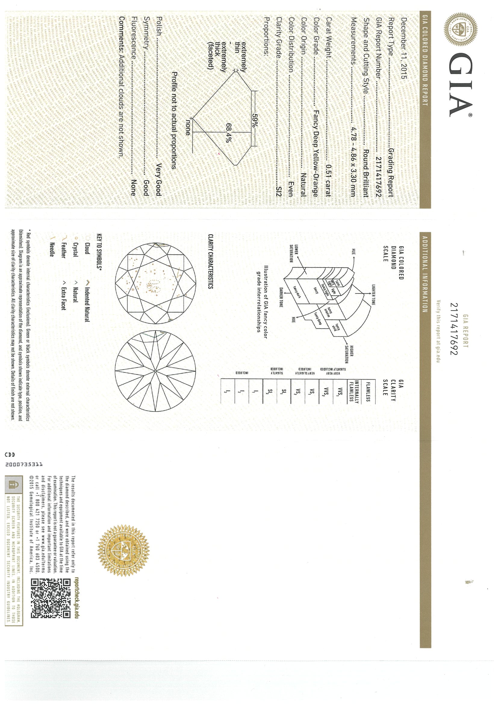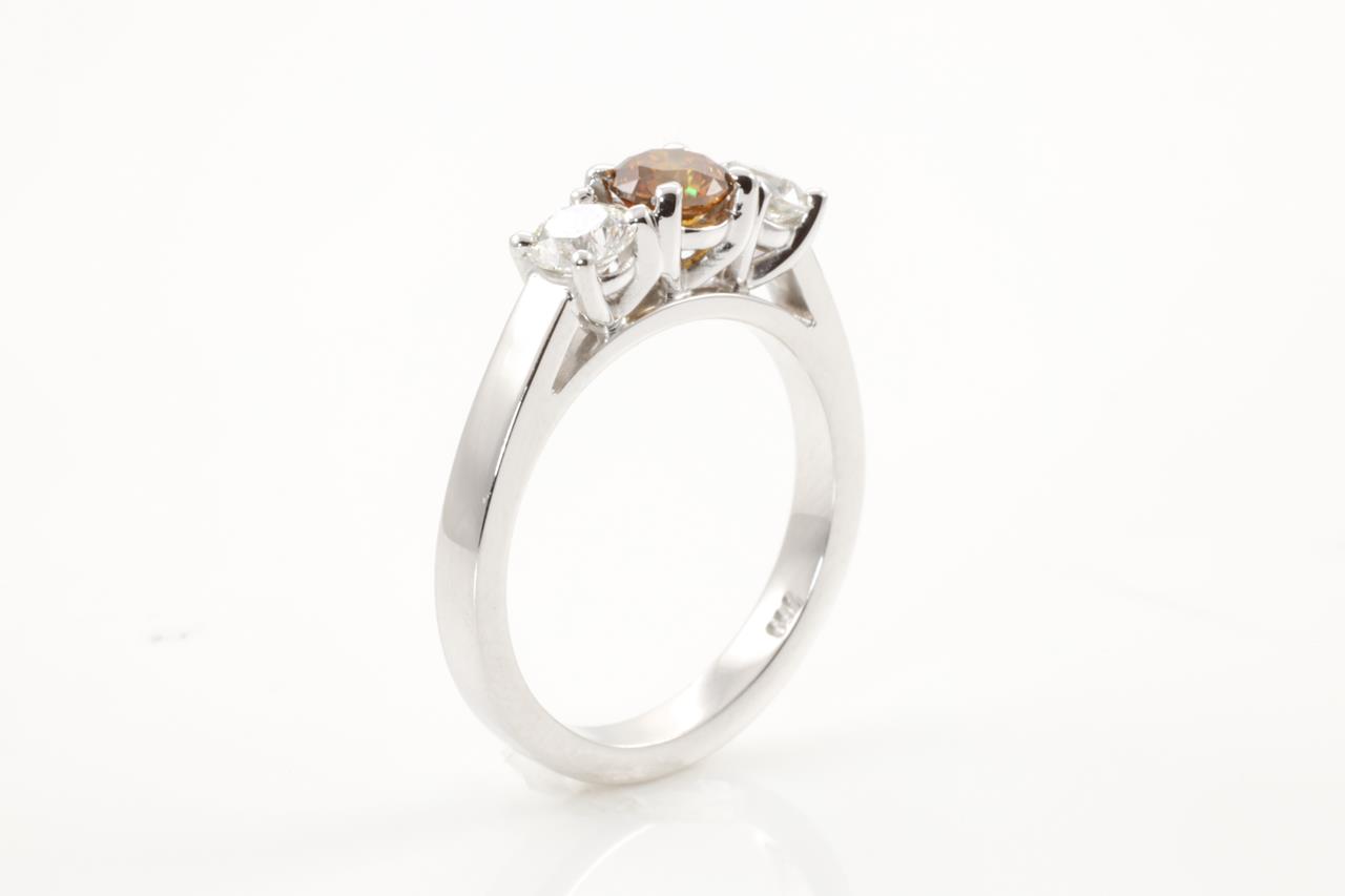 Diamond trilogy ring with centre round brilliant cut Diamond of 0.51ct (with GIA report graded as Natural Fancy Deep Yellow-Orange Even SI2 #2171417692) set with 2 round diamonds totalling 0.61cts (with GIA summary reports graded as G P1 #6352542460, 2357741823). 18ct white gold. Ring size: L1/2. Weight 5.6g. (New)