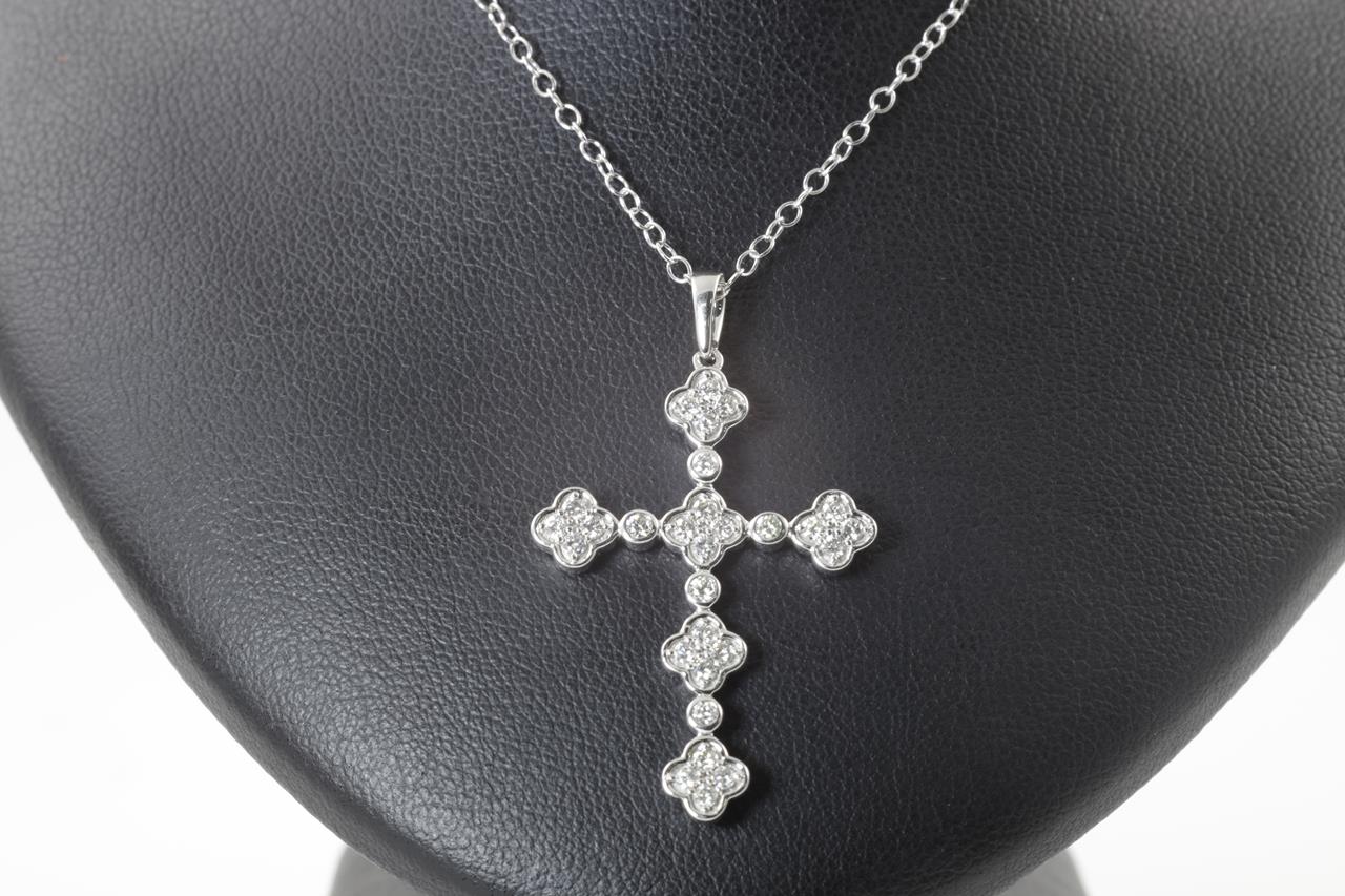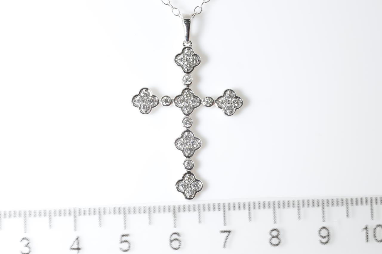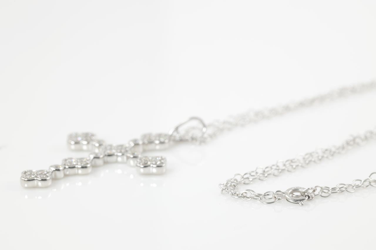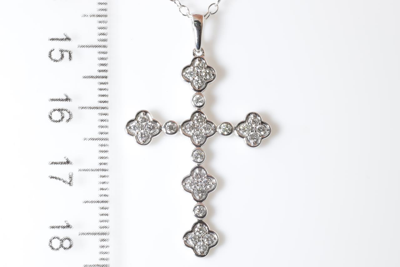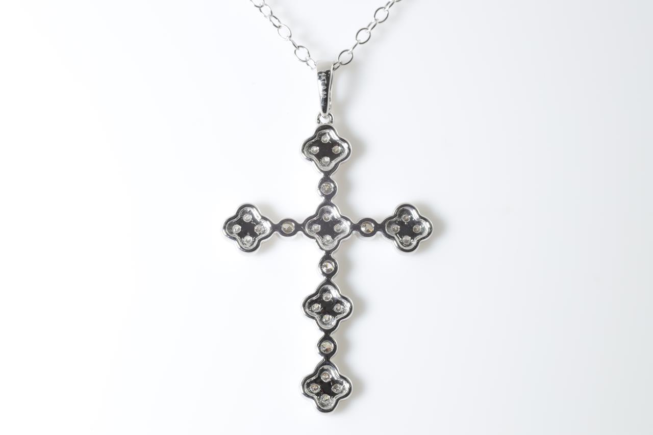 Diamond cross pendant with round Diamonds totalling 0.50cts (Estimated grading: H SI). 14ct white gold with 45cm chain. Weight: 3.8g. (New)