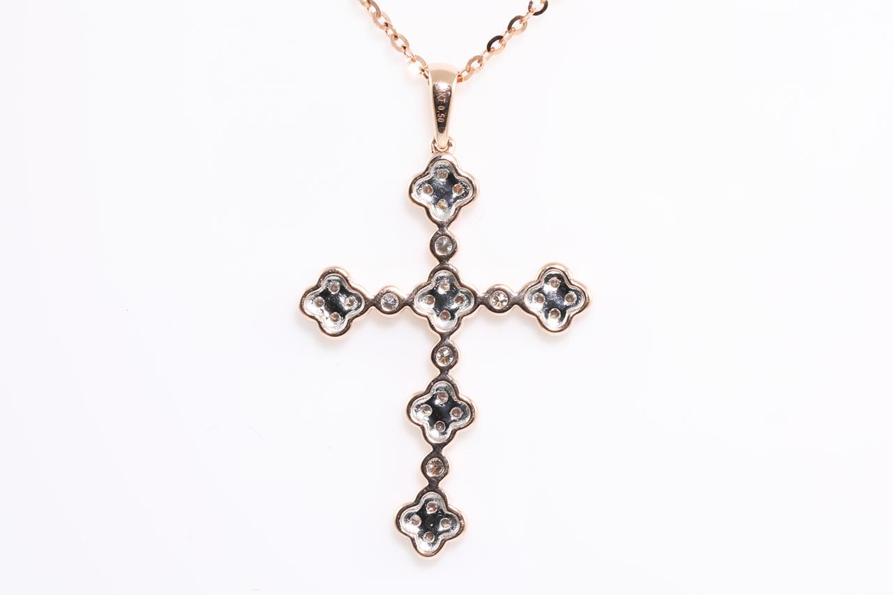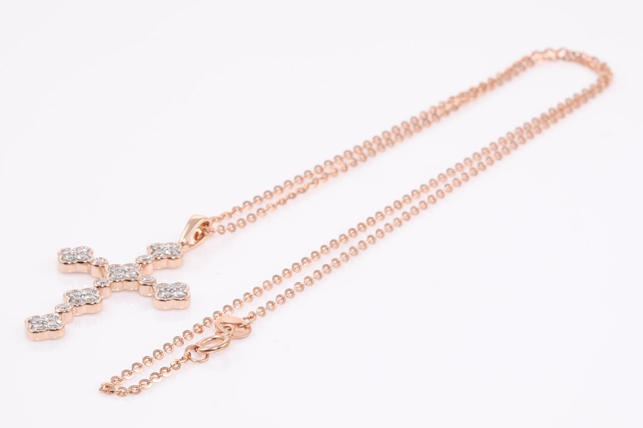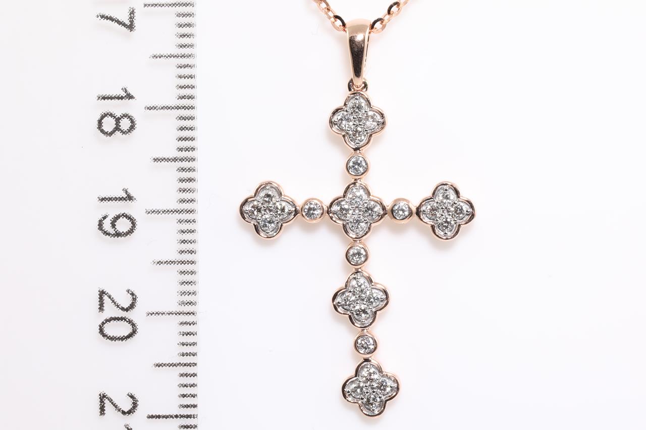 Diamond cross pendant with round Diamonds totalling 0.50cts (Estimated grading: H SI). 14ct rose gold & white gold with 18ct rose gold 44cm chain. Weight: 4.6g (New)