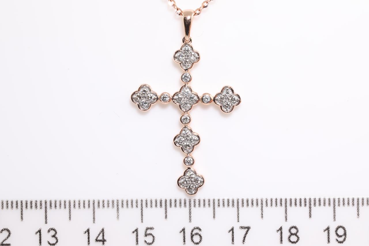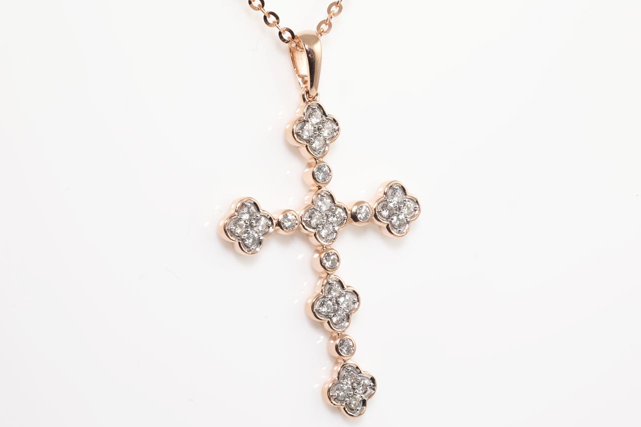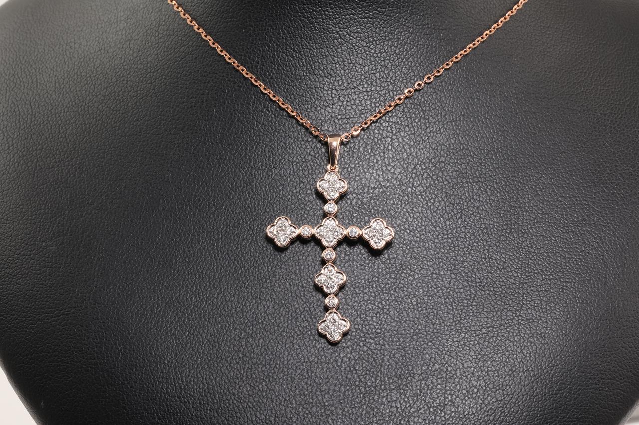 Diamond cross pendant with round Diamonds totalling 0.50cts (Estimated grading: H SI). 14ct rose gold & white gold with 18ct rose gold 44cm chain. Weight: 4.6g (New)
