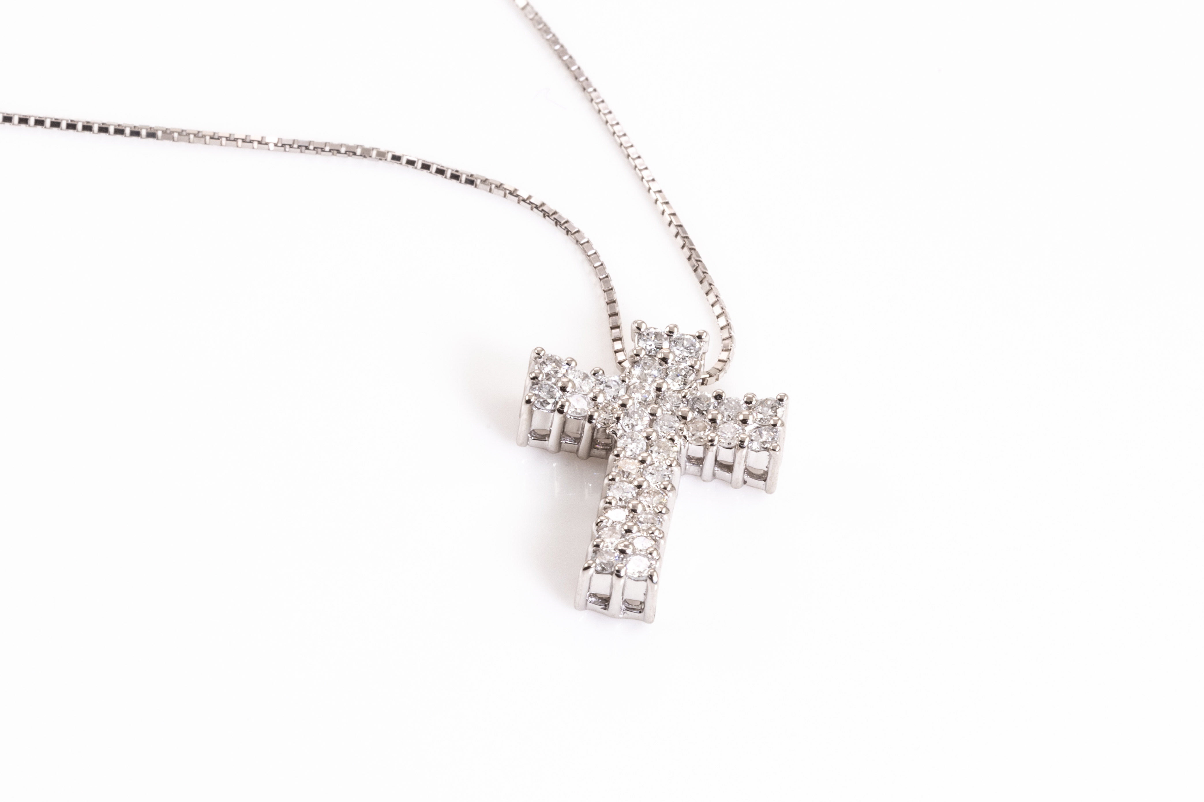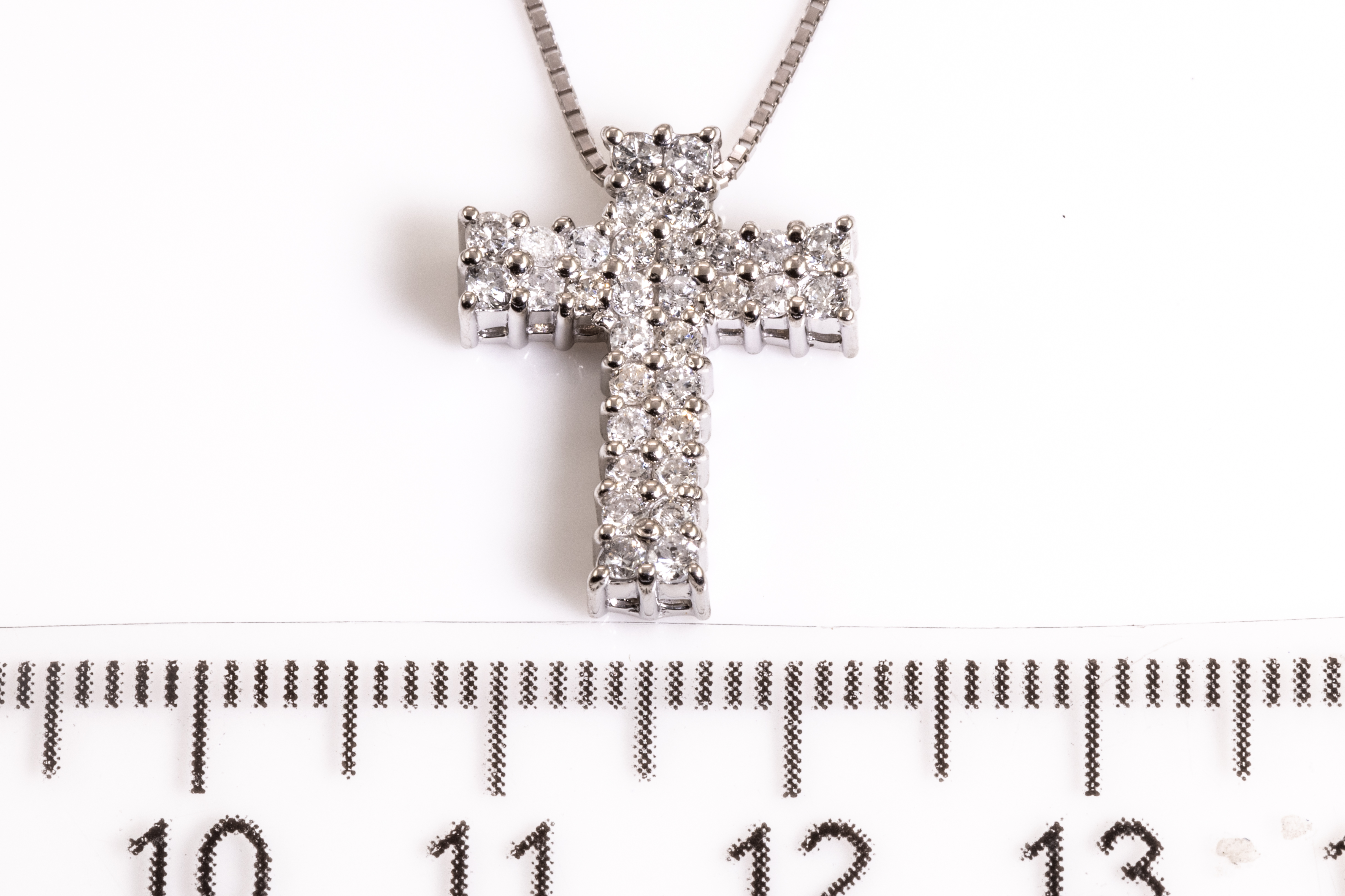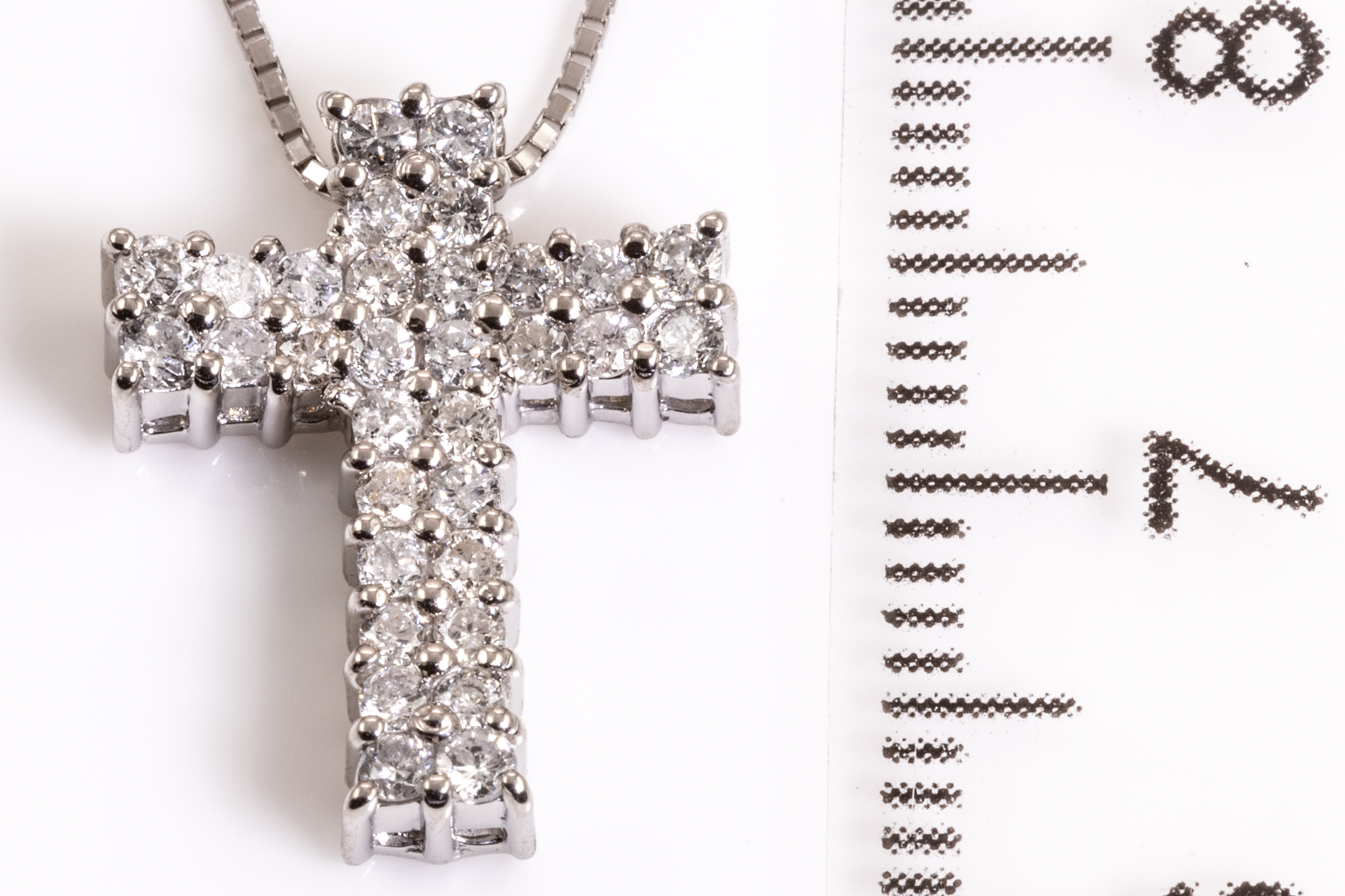 Diamond cross pendant with round Diamonds totalling 0.50cts (Estimated grading: H-I P2-P3). Platinum with 18ct white gold 44cm adjustable chain. Weight: TBAg. (Pre-owned)