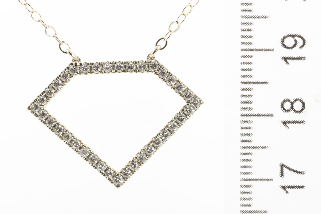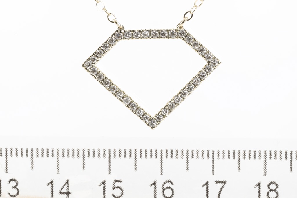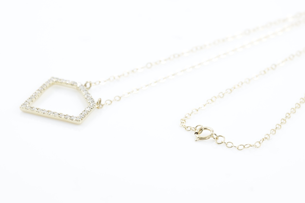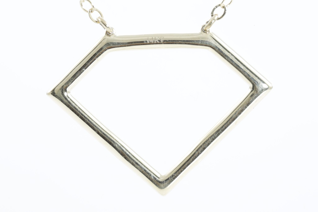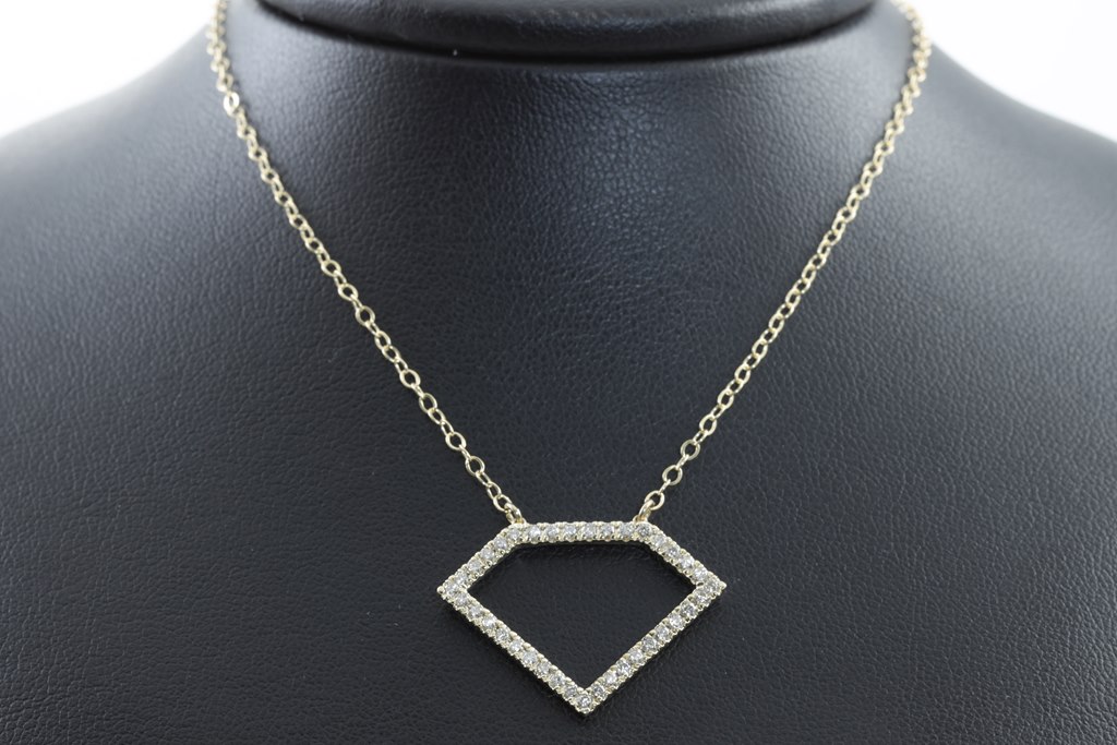 Diamond shape dress pendant with round Diamonds totalling 0.50cts (Estimated grading: H SI). 14ct yellow gold with 18ct gold attached chain. Length: 48cm. Weight: 3.2g. (New)