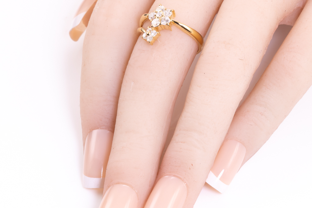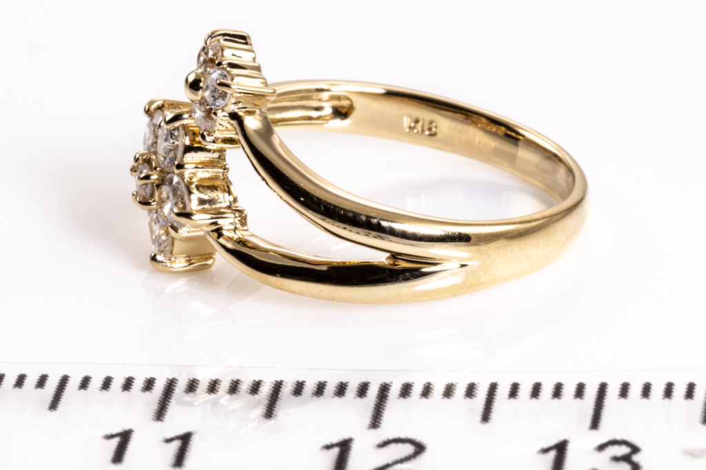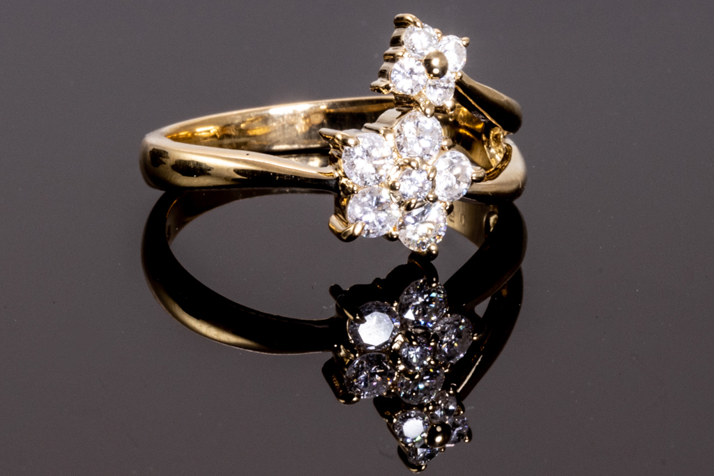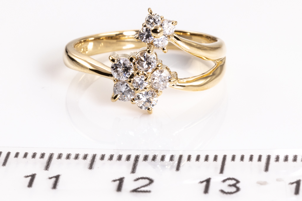 Flower design ring with round Diamonds totalling 0.50cts (Estimated grading: H-I P1). 18ct yellow gold. Ring size M - ring resizing is not recommended. Weight: 3.5g. (Pre-owned)