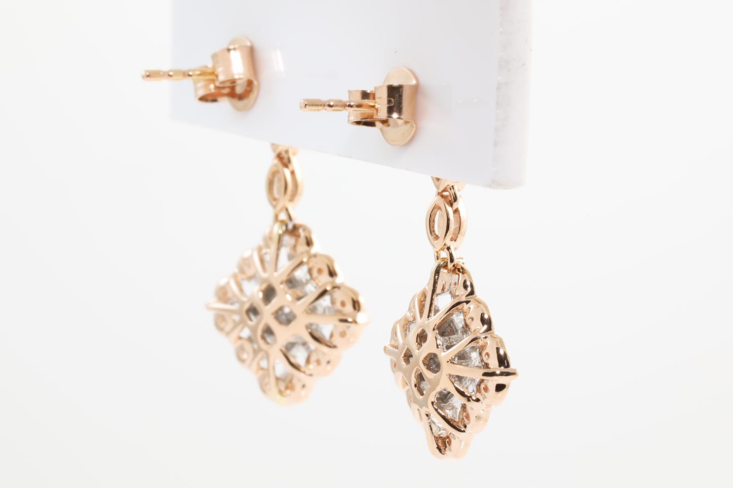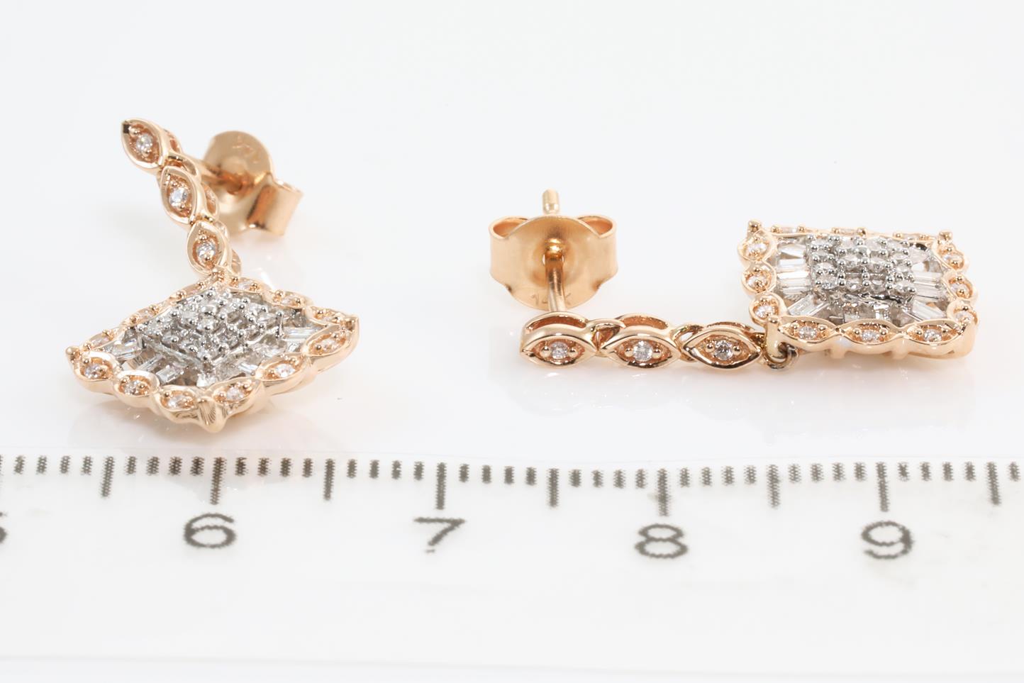 Diamond earrings with round Diamonds totalling 0.28cts and baguette cut Diamonds totalling 0.22cts (Estimated grading: I SI). 14ct Rose gold. Weight: 3.7g (New)