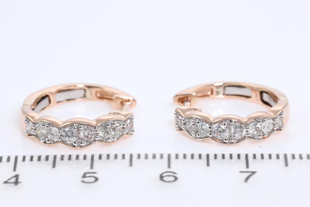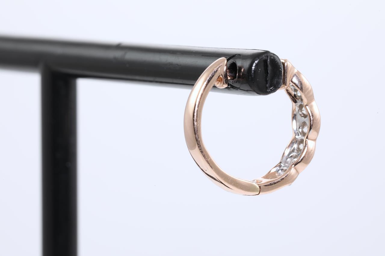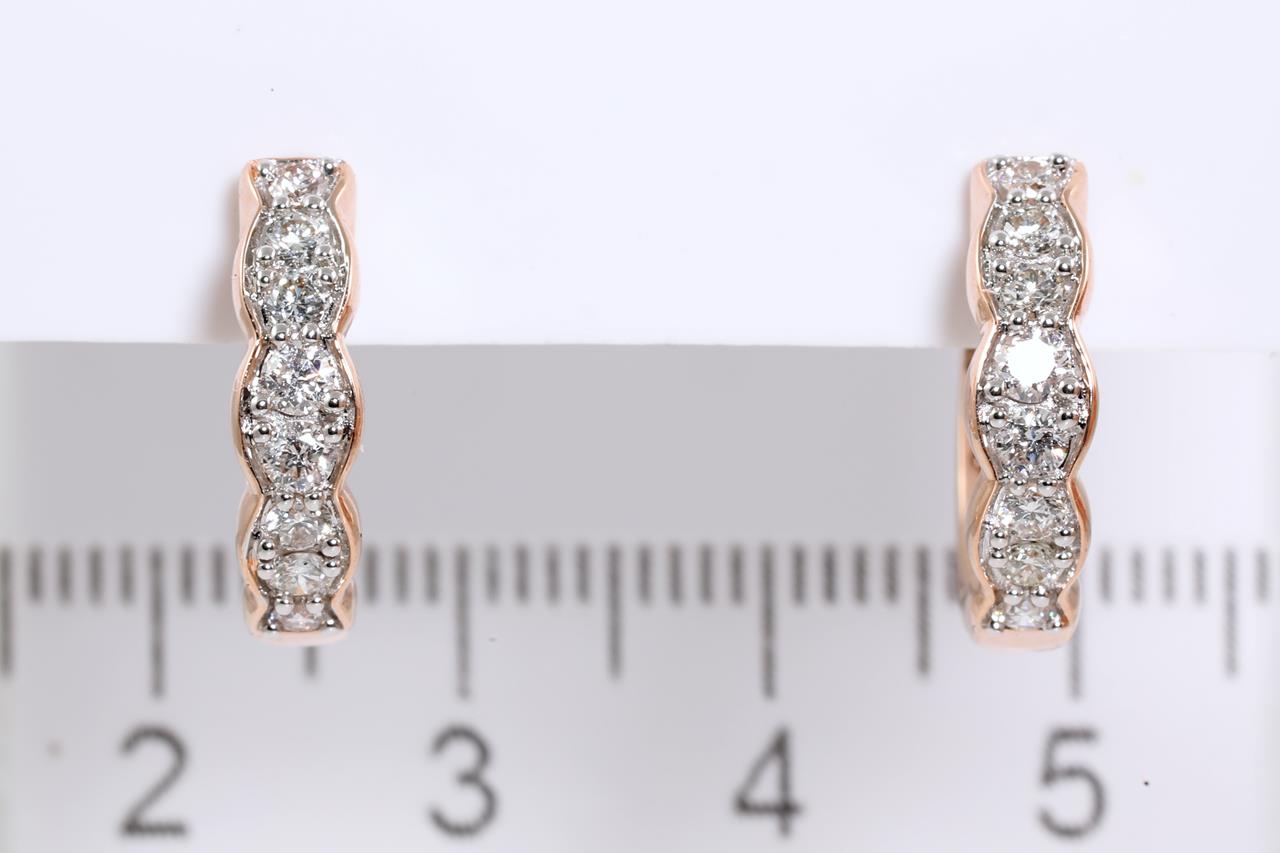 Diamond huggie earrings with 16 round Diamonds totallling 0.50cts (Estimated grading: H SI). 14ct rose gold and white gold. Weight: 3.5g (New)