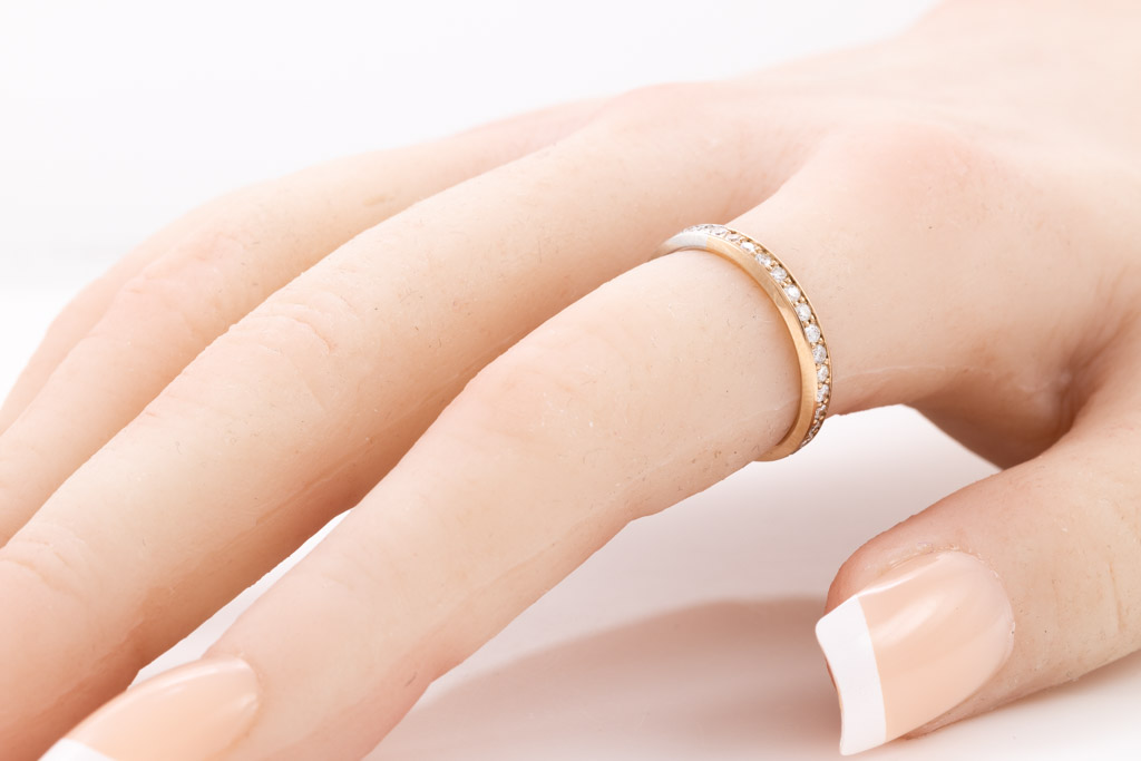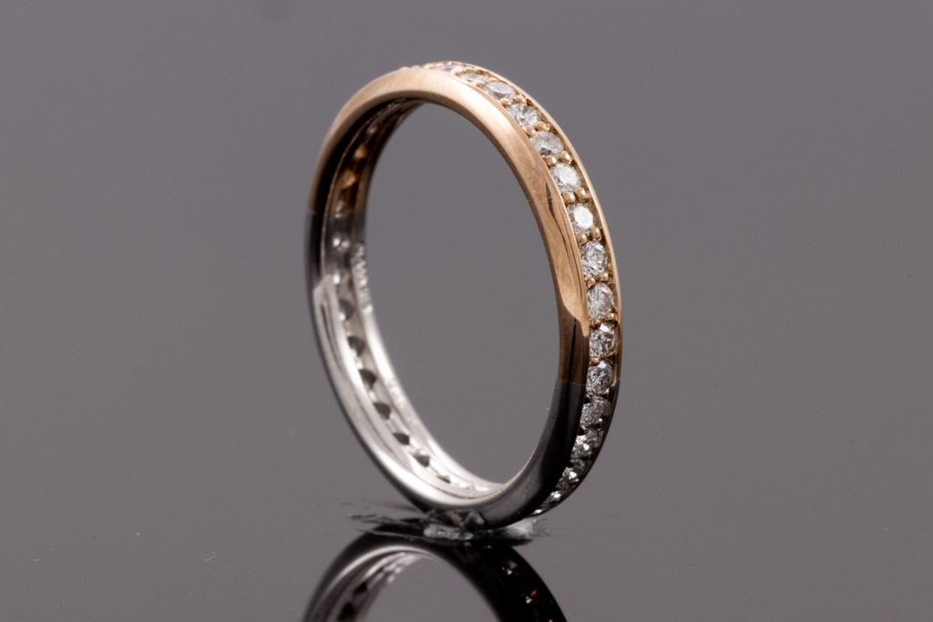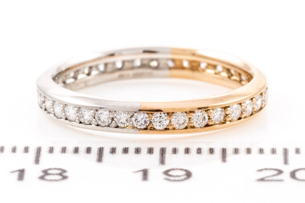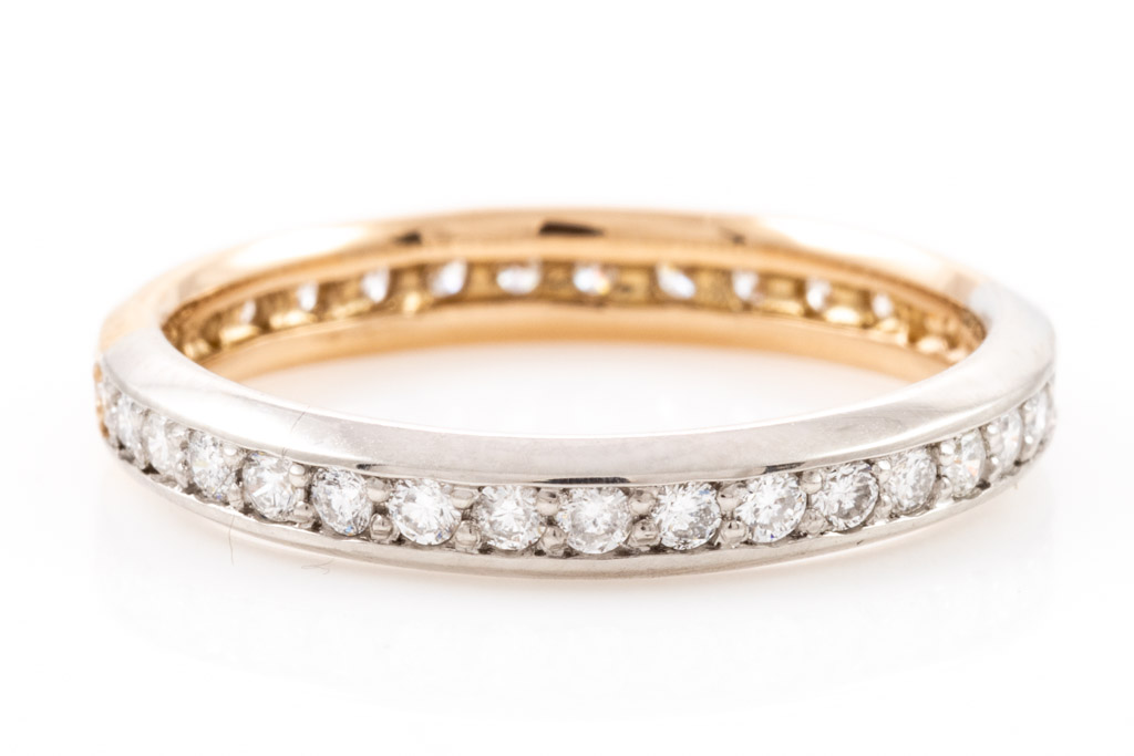 Diamond full eternity ring with round Diamonds totalling 0.50cts (Estimated grading: G-H SI). 18ct rose gold and platinum. Ring size K1/2 - ring resizing is not recommended. Weight: 2.8g. (Pre-owned)