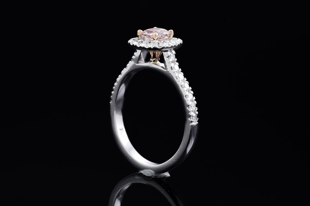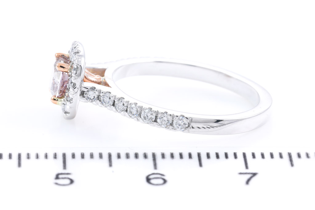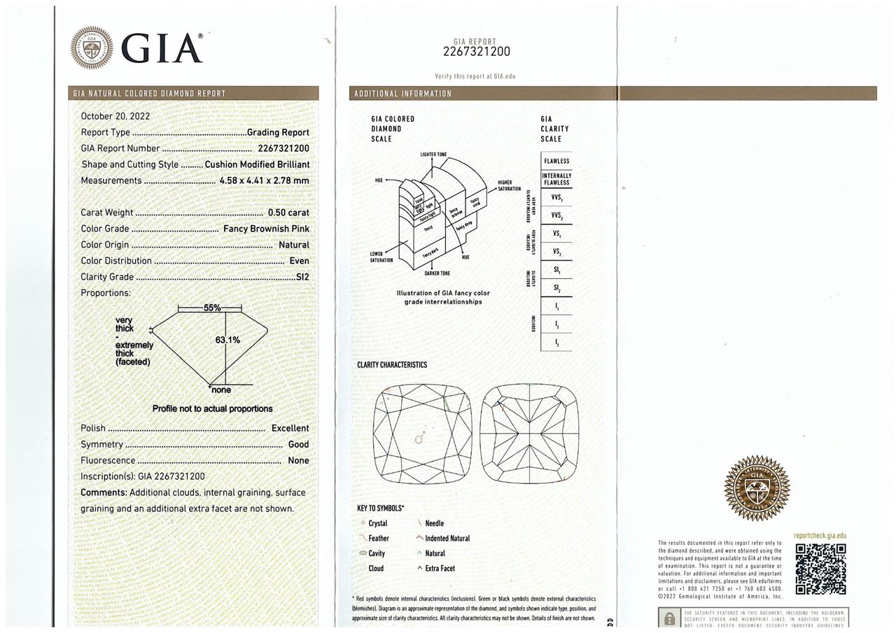 Diamond ring with centre cushion cut Diamond of 0.50ct (with GIA report graded as Natural Fancy Brownish Pink Even SI2#2267321200) and diamonds totalling 0.42cts (Estimated grading: G VS-SI). 18ct white and rose gold. Ring size L. Weight 3.9g . (New)