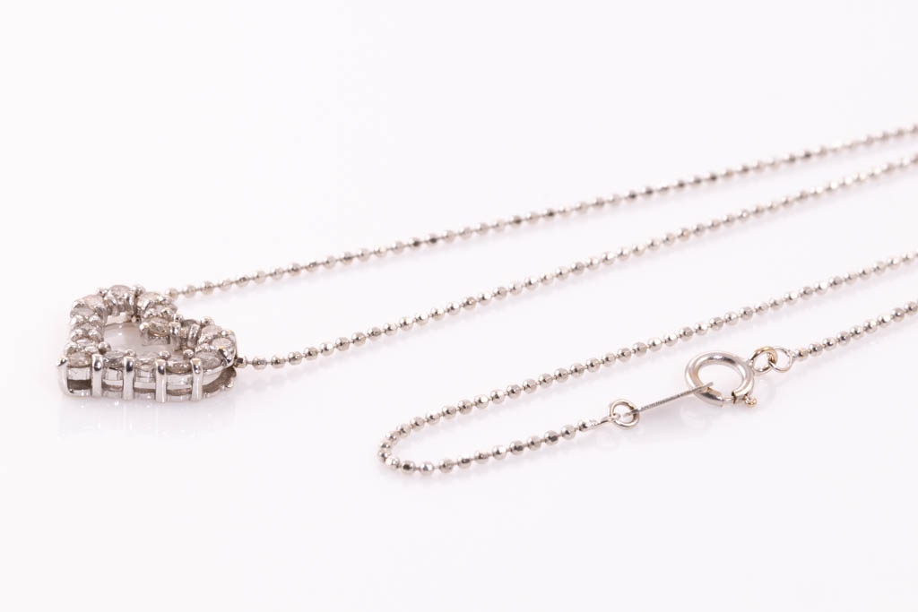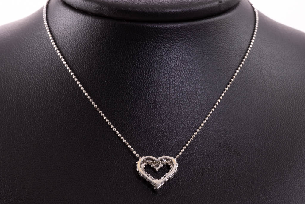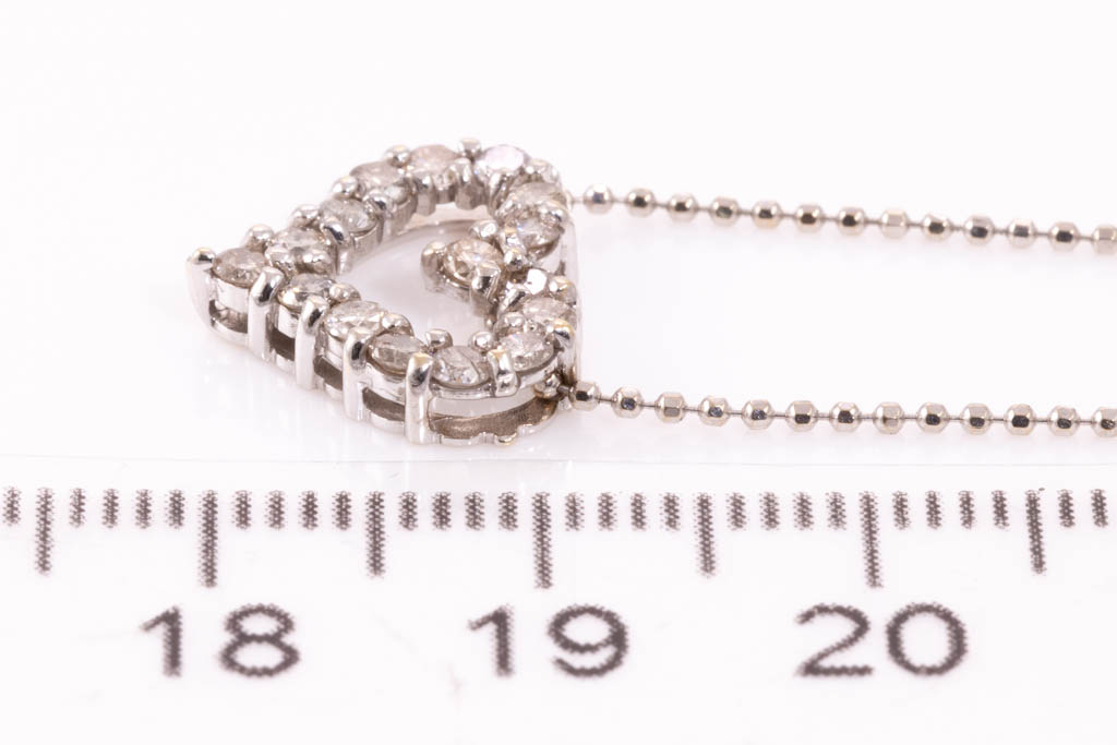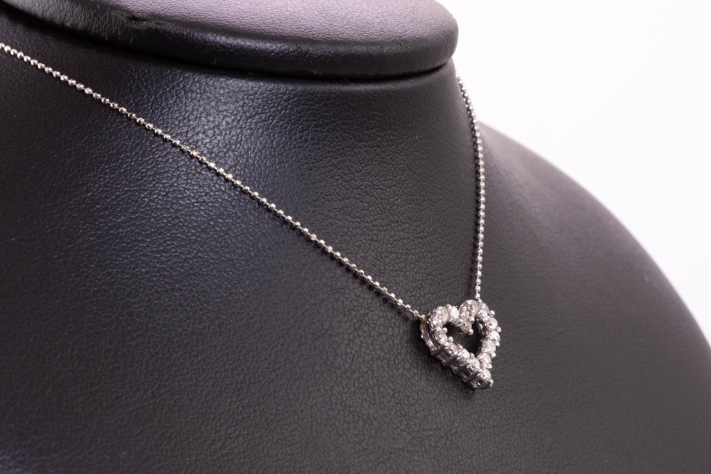 Diamond heart design pendant with round Diamonds totalling 0.50cts (Estimated grading: J-K P1). 18ct white gold with 40cm 18ct white gold chain. Weight: 2.7g (Pre-owned)