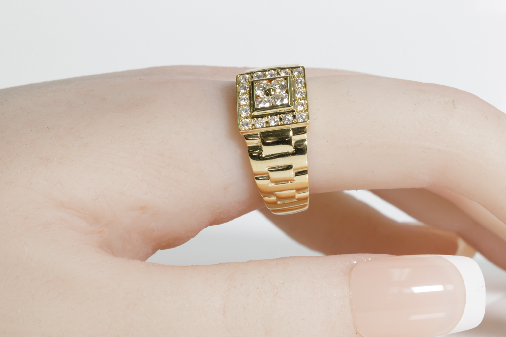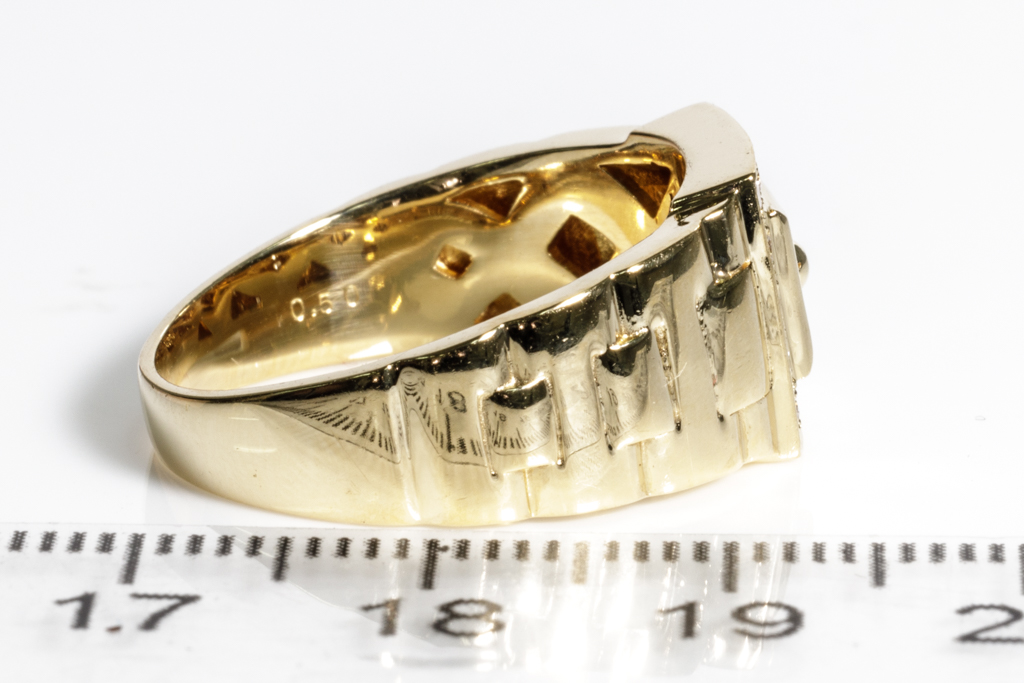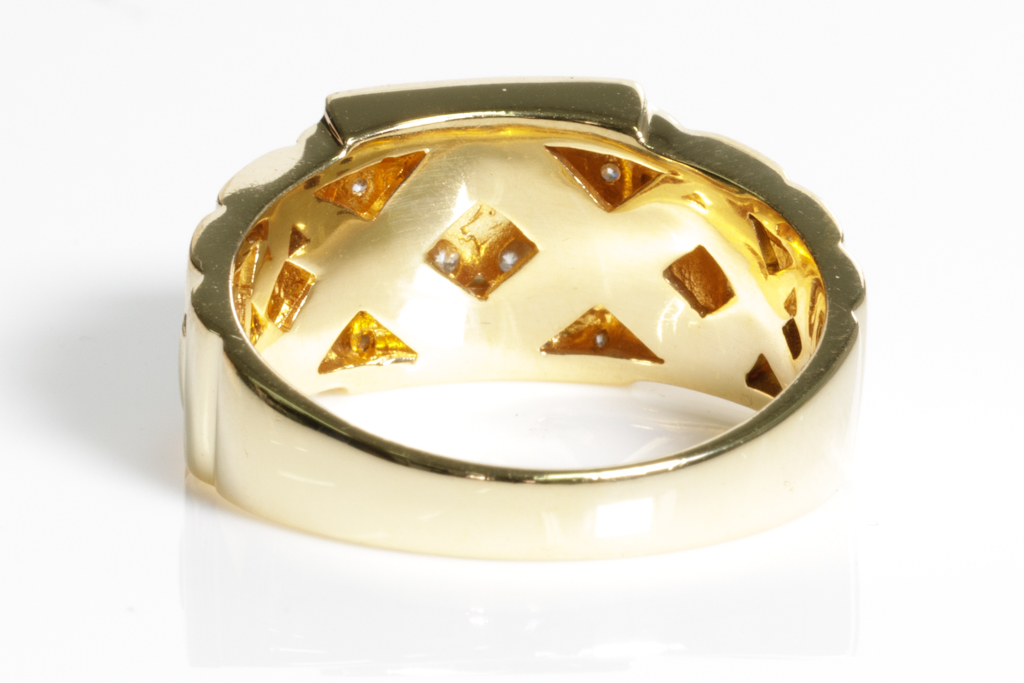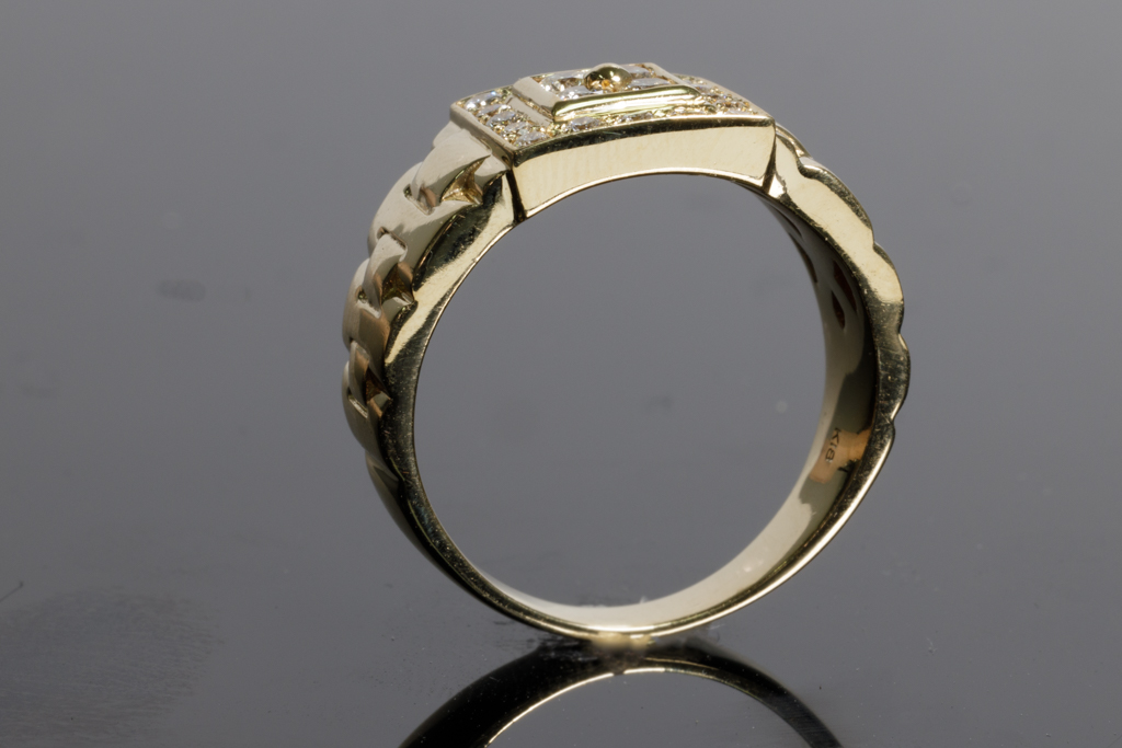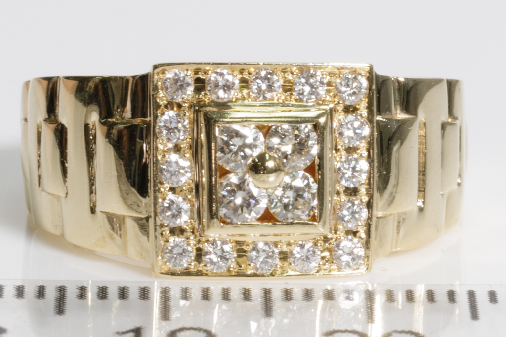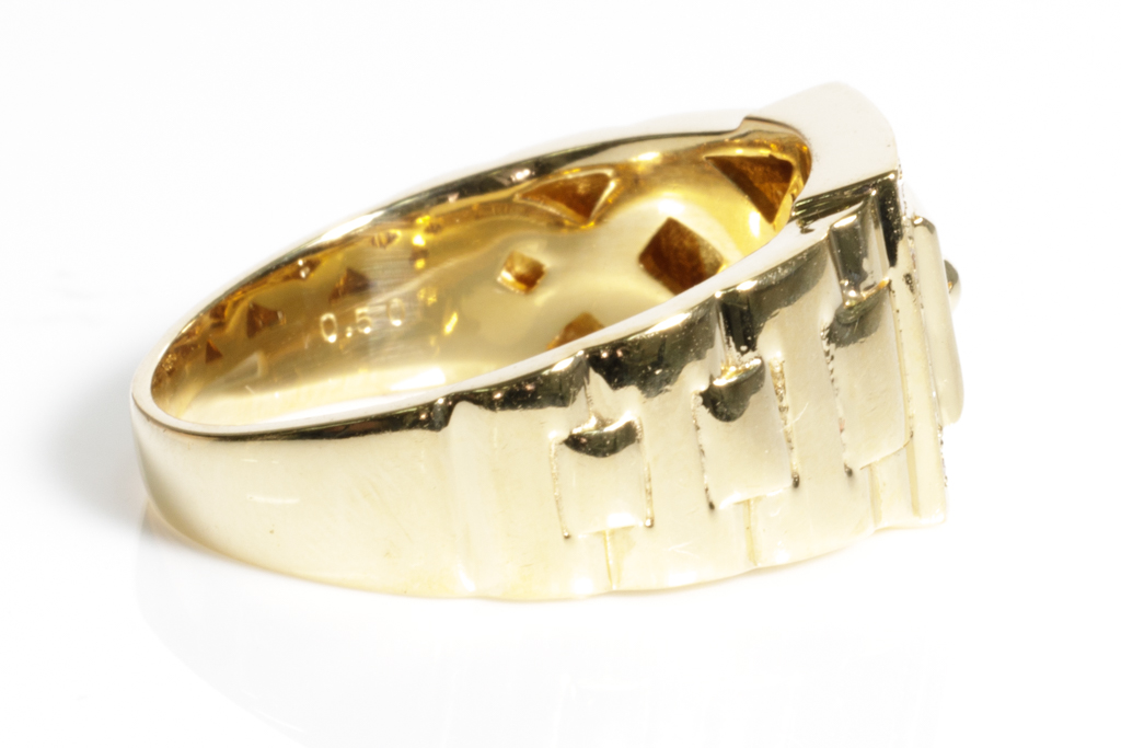 Diamond mens ring with round Diamonds totalling 0.50cts (Estimated grading: H SI). 18ct yellow gold. Rings size R1/2. Weight: 9.2g. (Pre-owned)