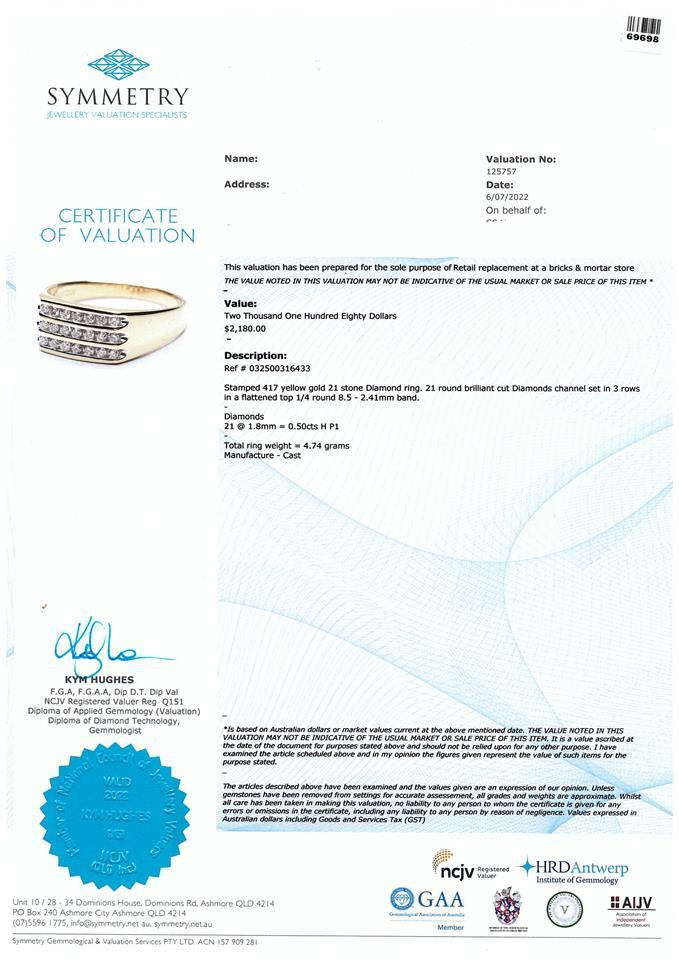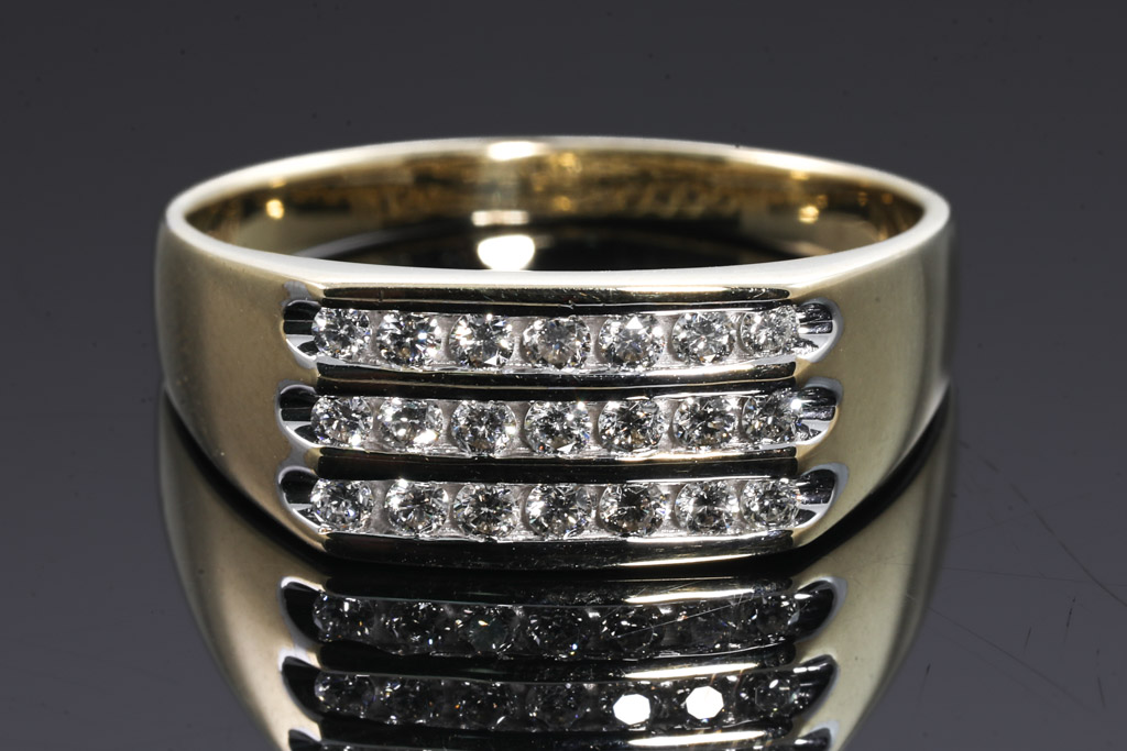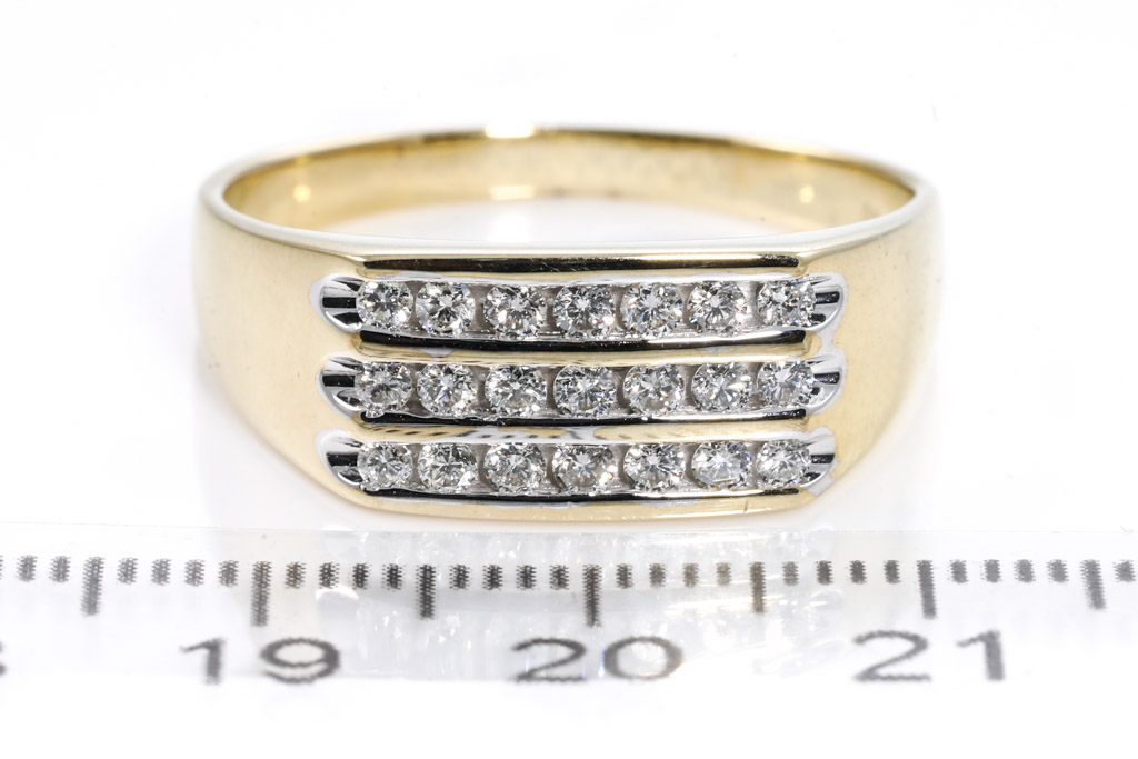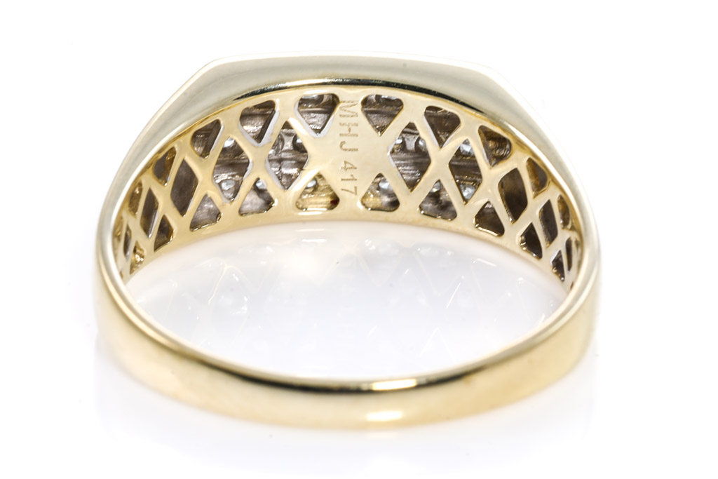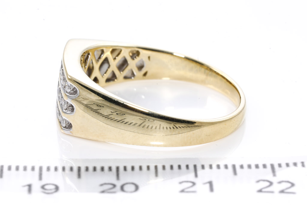 Diamond mens ring with round Diamonds totalling approximately 0.50cts (Estimated grading H P). 10ct yellow gold. Ring size Y. Weight 4.7g. With Vaulation #125757. (Pre-owned)